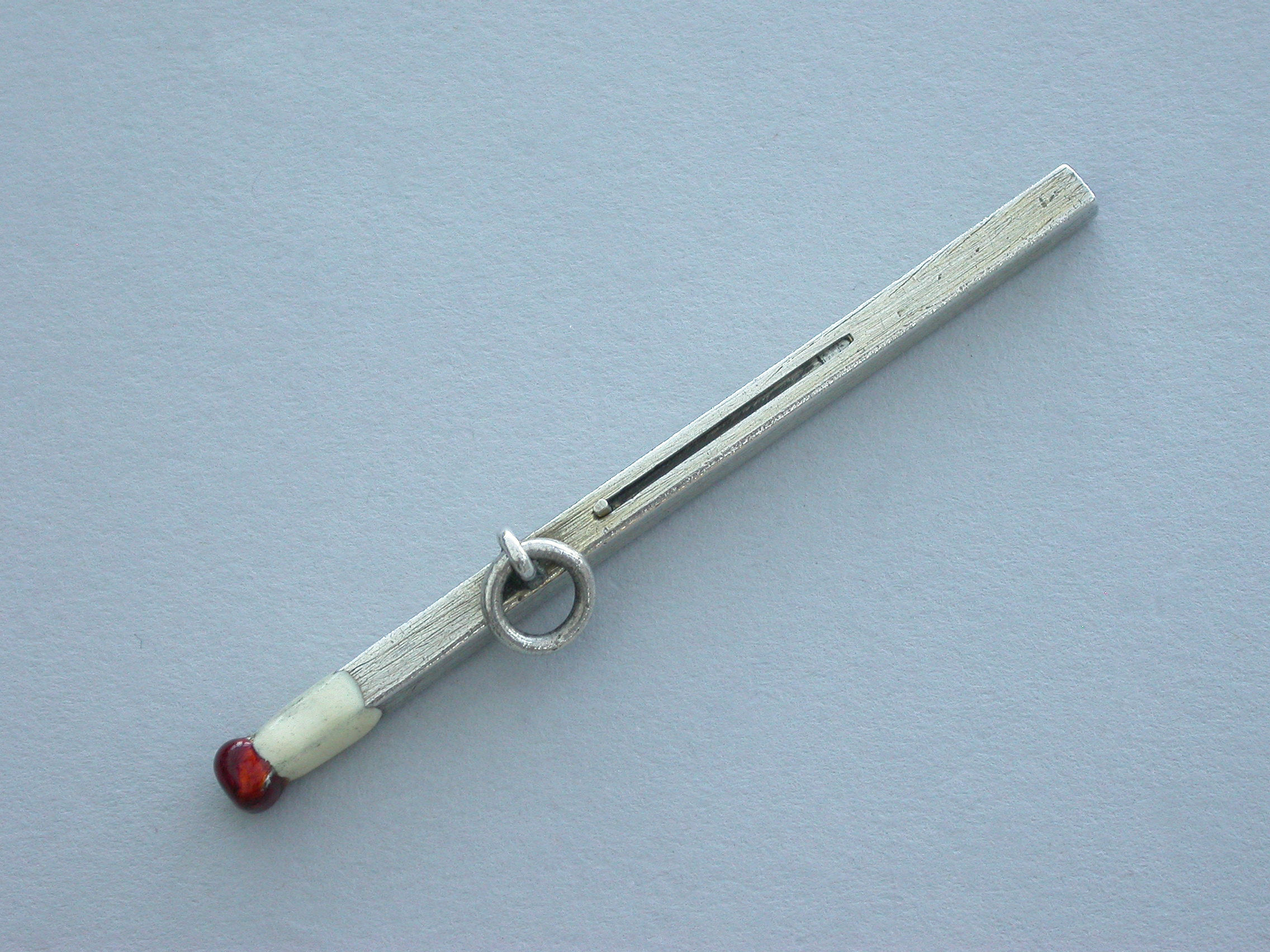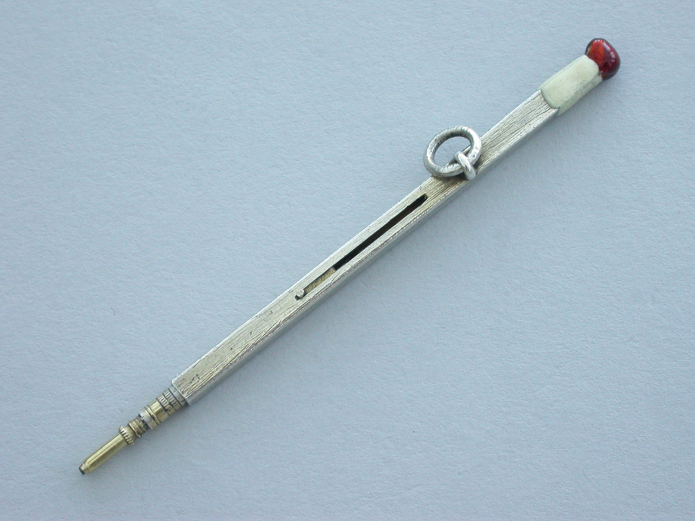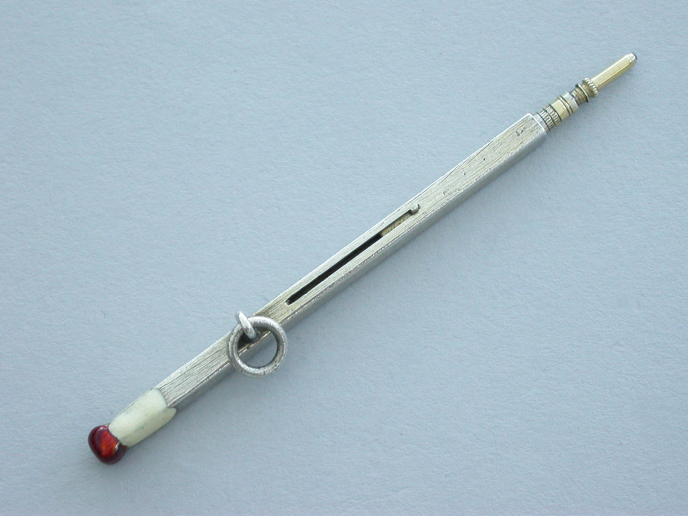 A rare Victorian novelty silver sliding Propelling Pencil made in the form of a match, with red and white enamel head and attached suspension ring.