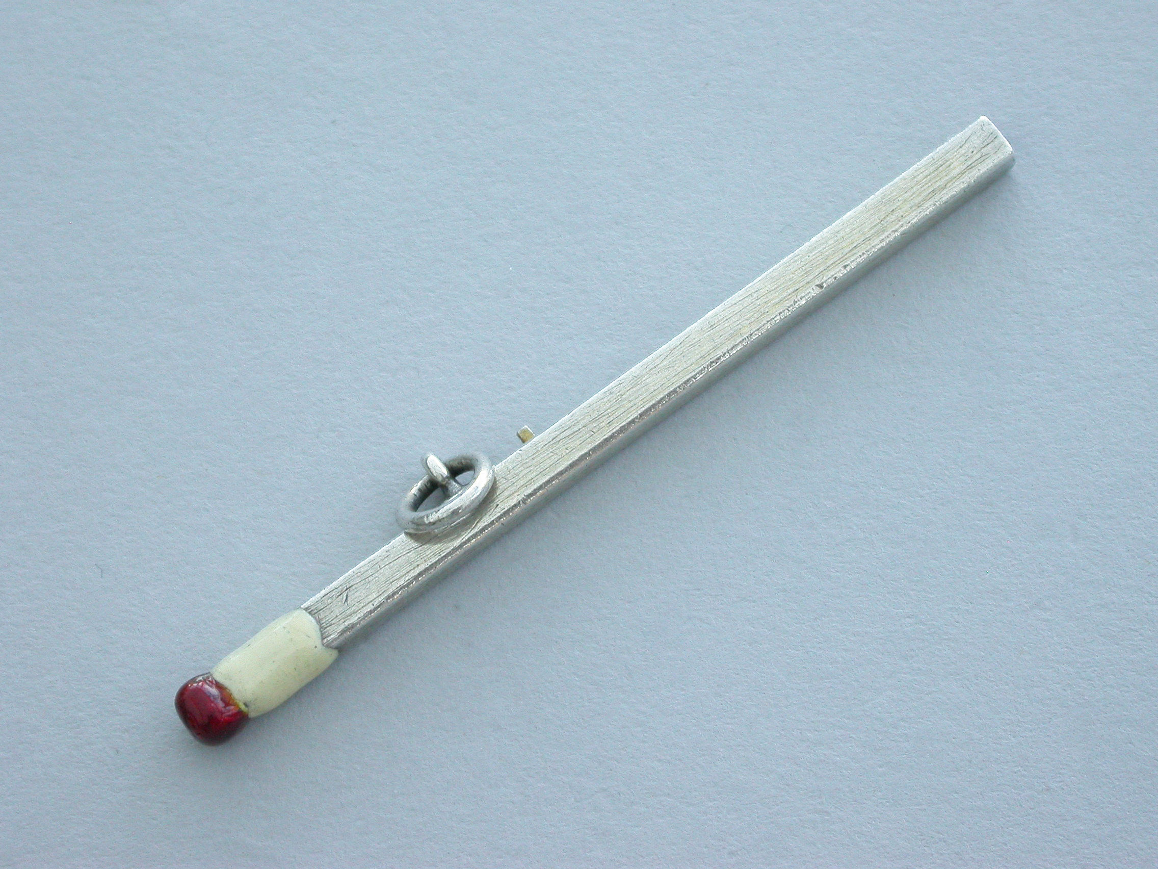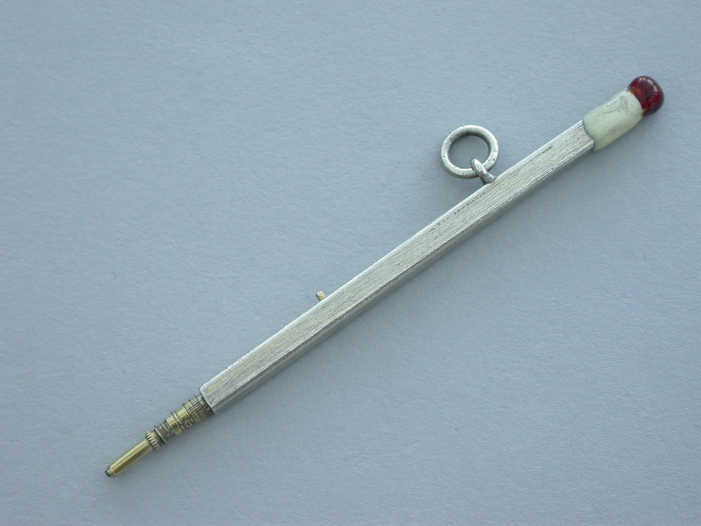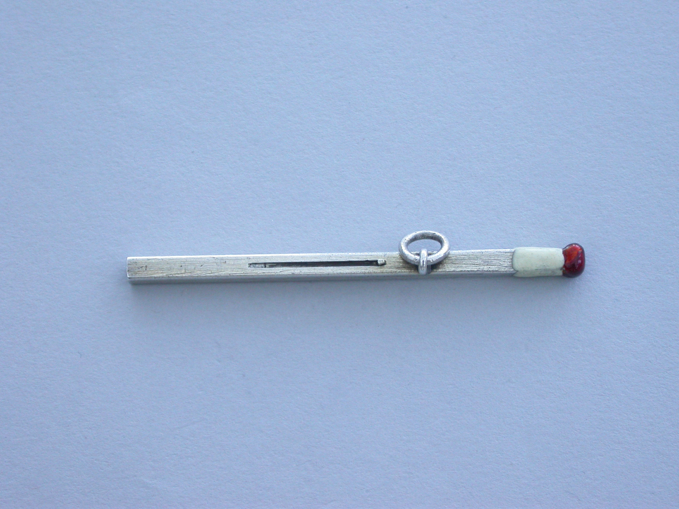 A rare Victorian novelty silver sliding Propelling Pencil made in the form of a match, with red and white enamel head and attached suspension ring.
