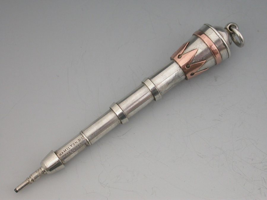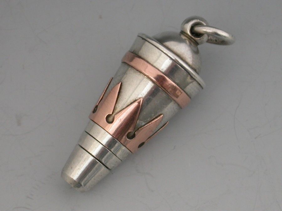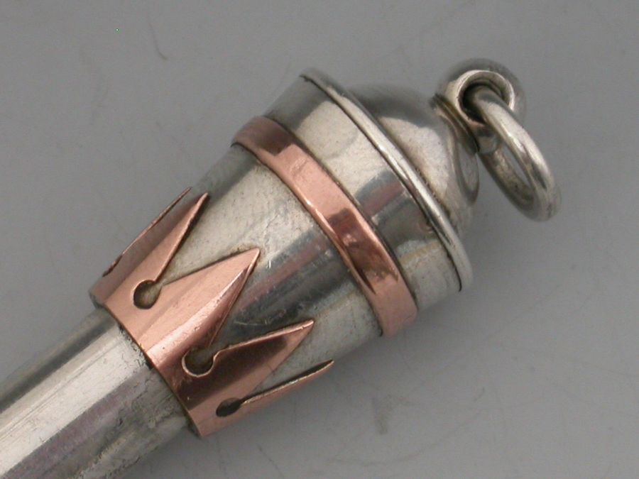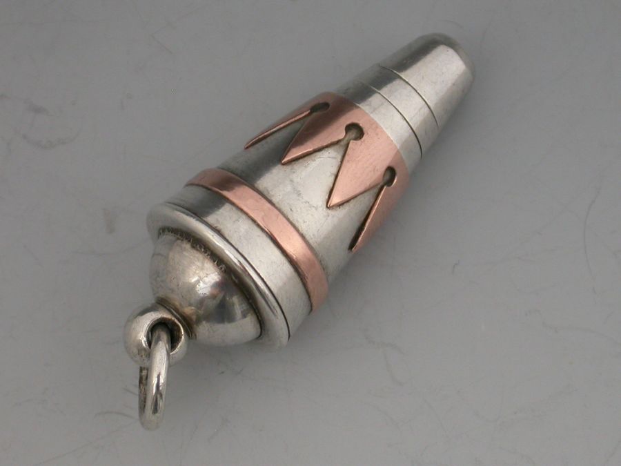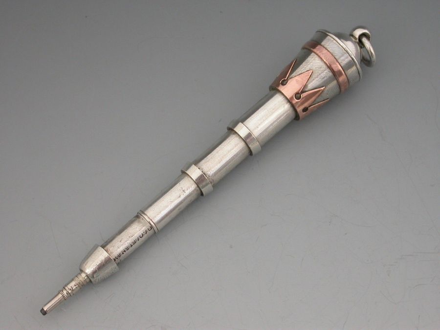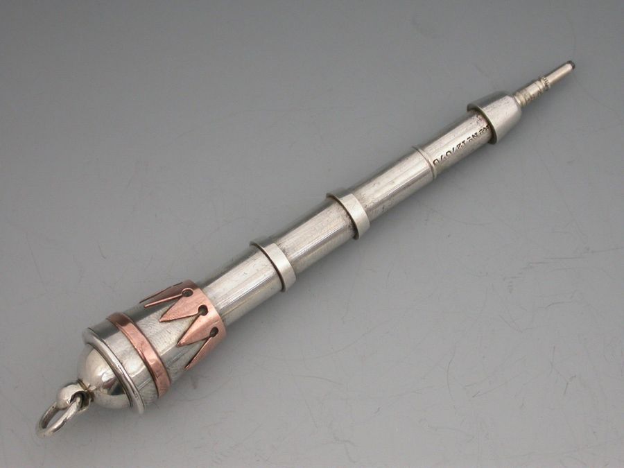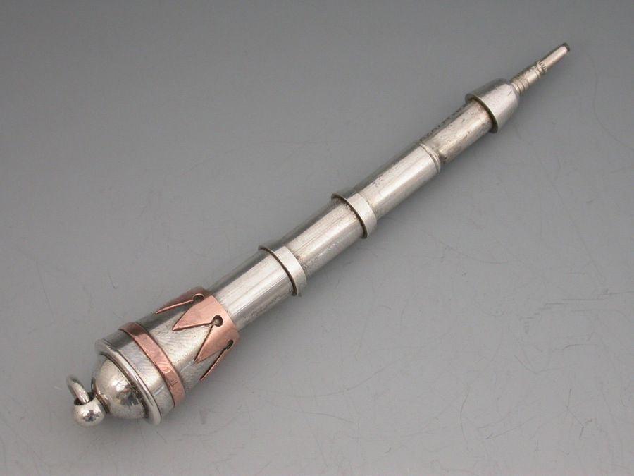 A very fine quality and rare novelty silver Propelling Pencil made in the form of a Spinning Top, with applied bands of gold decoration and attached suspension ring. With superb four drawer telescopic action to extend the pencil.