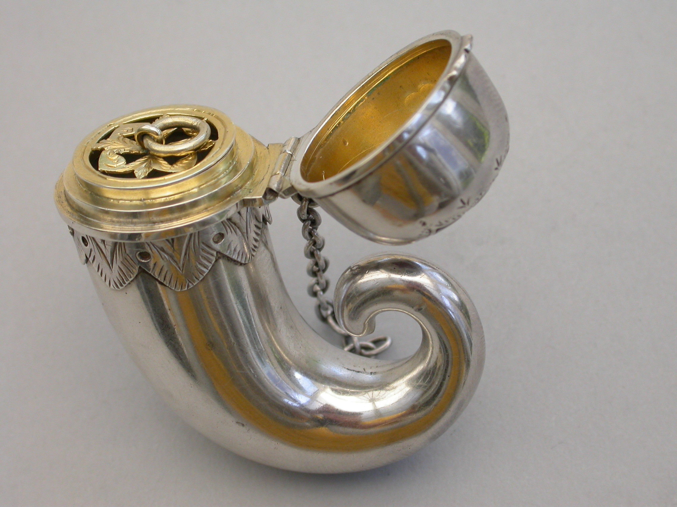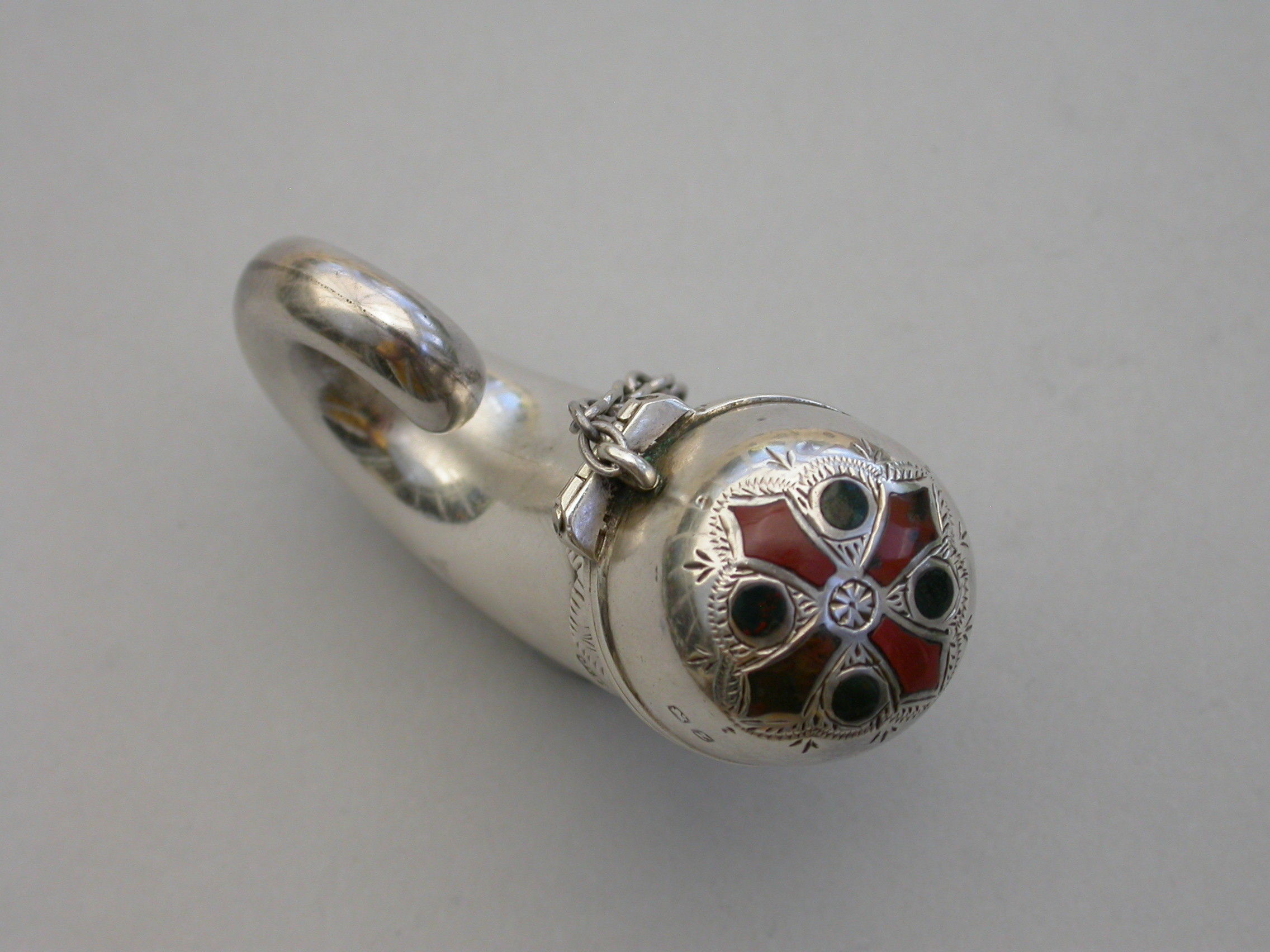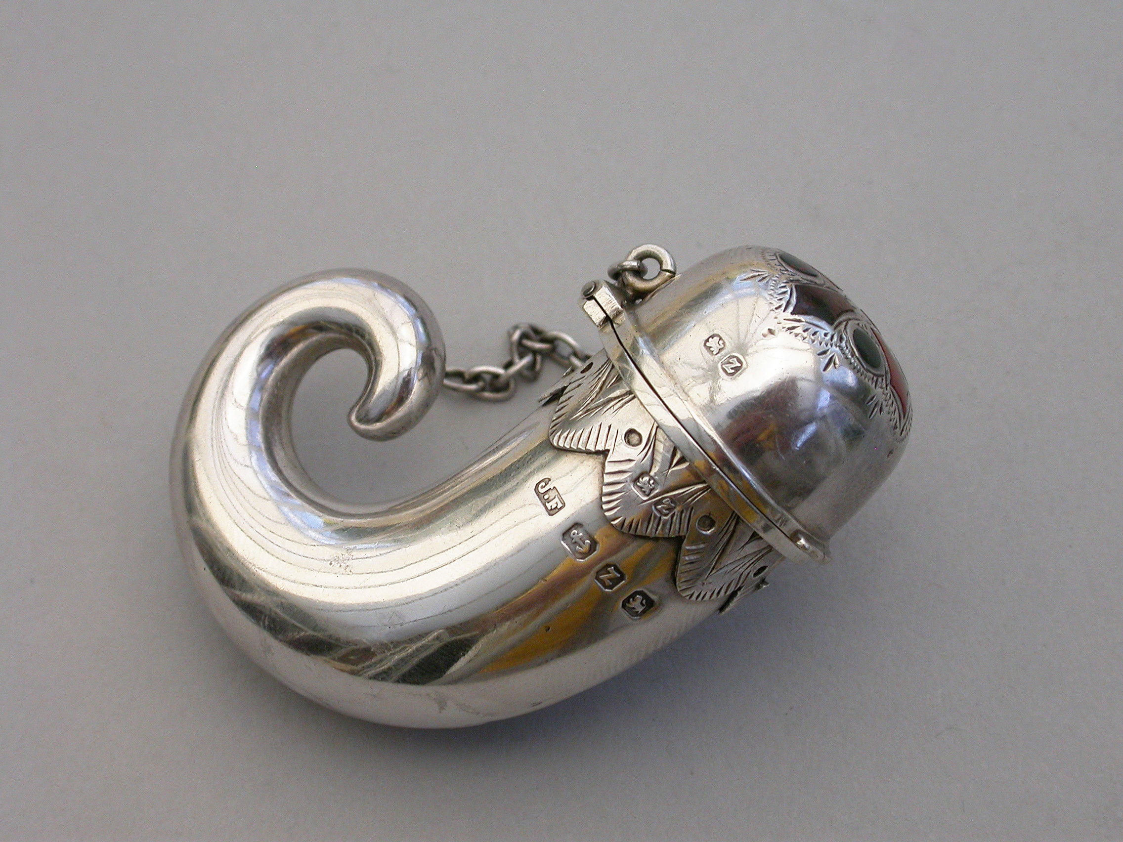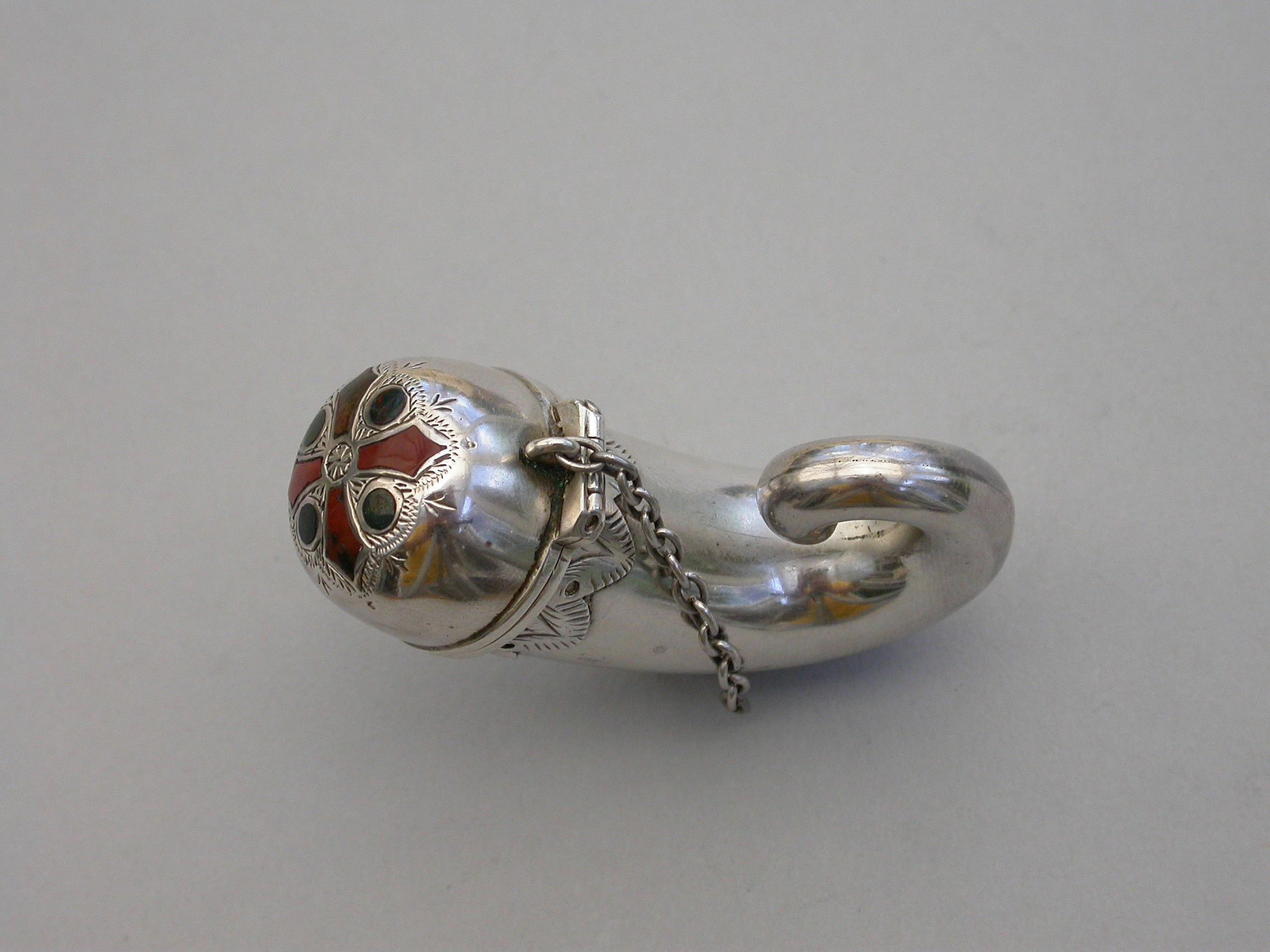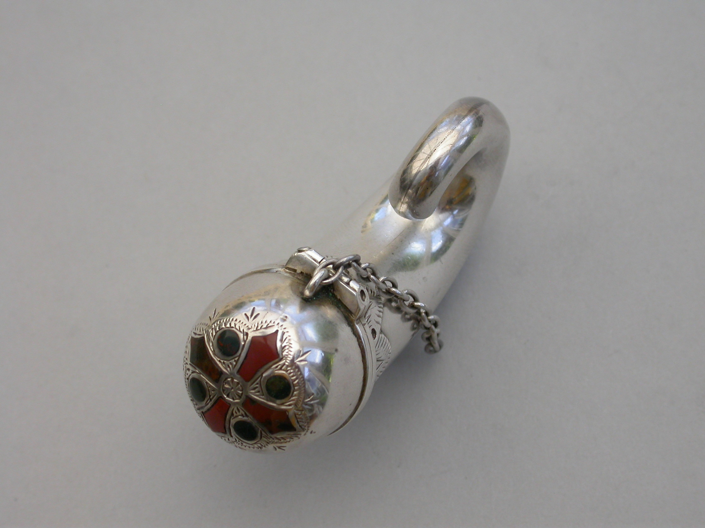A Victorian novelty silver Vinaigrette formed as a snuff mull, mostly plain with a band of applied decoration below the lid, attached suspension ring and chain, the lid engraved and set with various coloured hardstones in a cruciform design, opening with a stand-away hinge and thumb-piece to a silver gilt interior including a pull-out pierced grille with flower head design and attached ring.