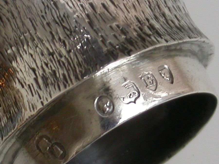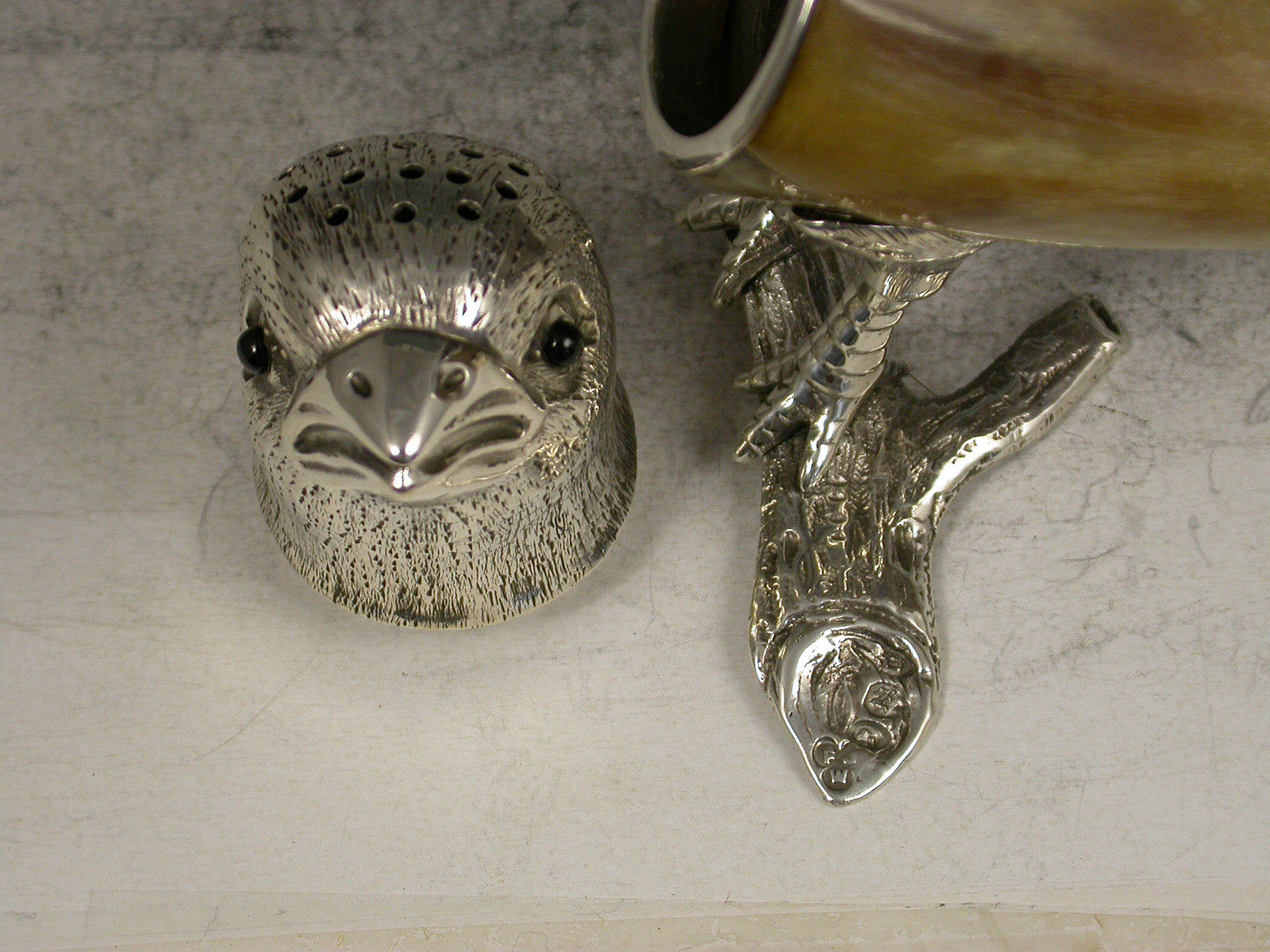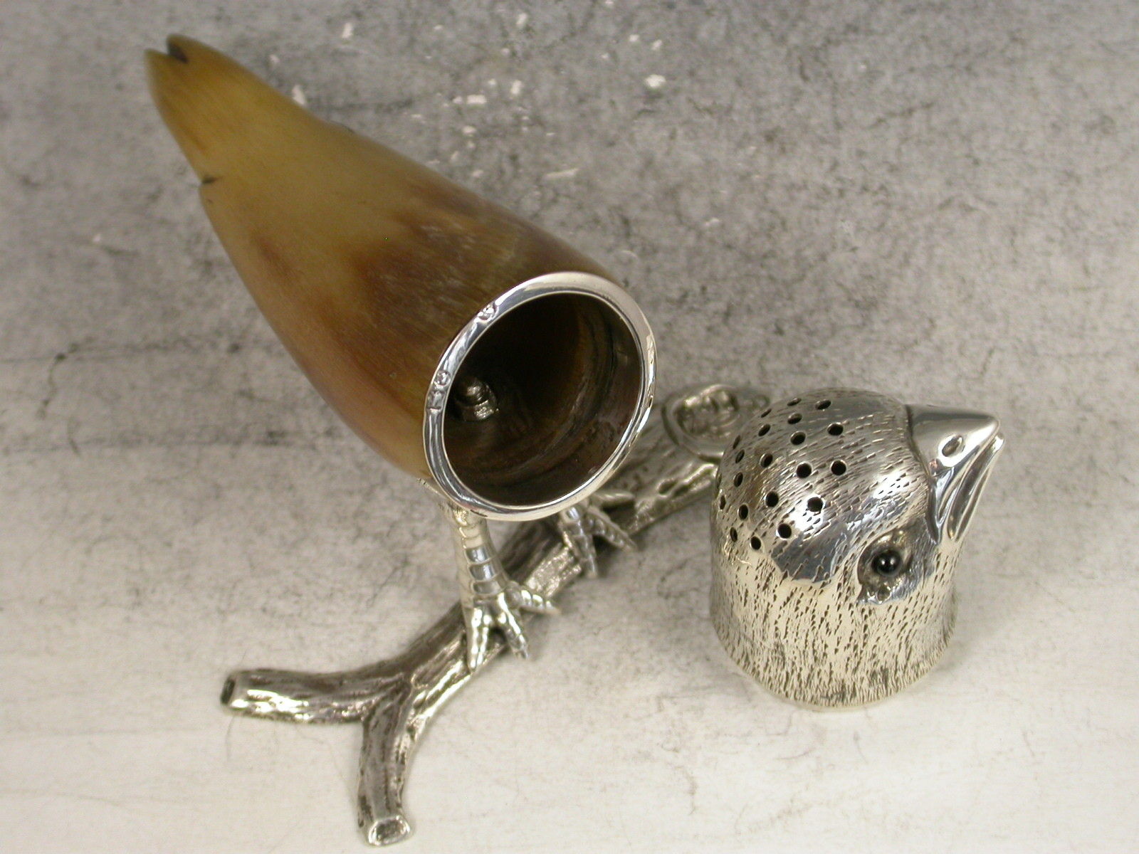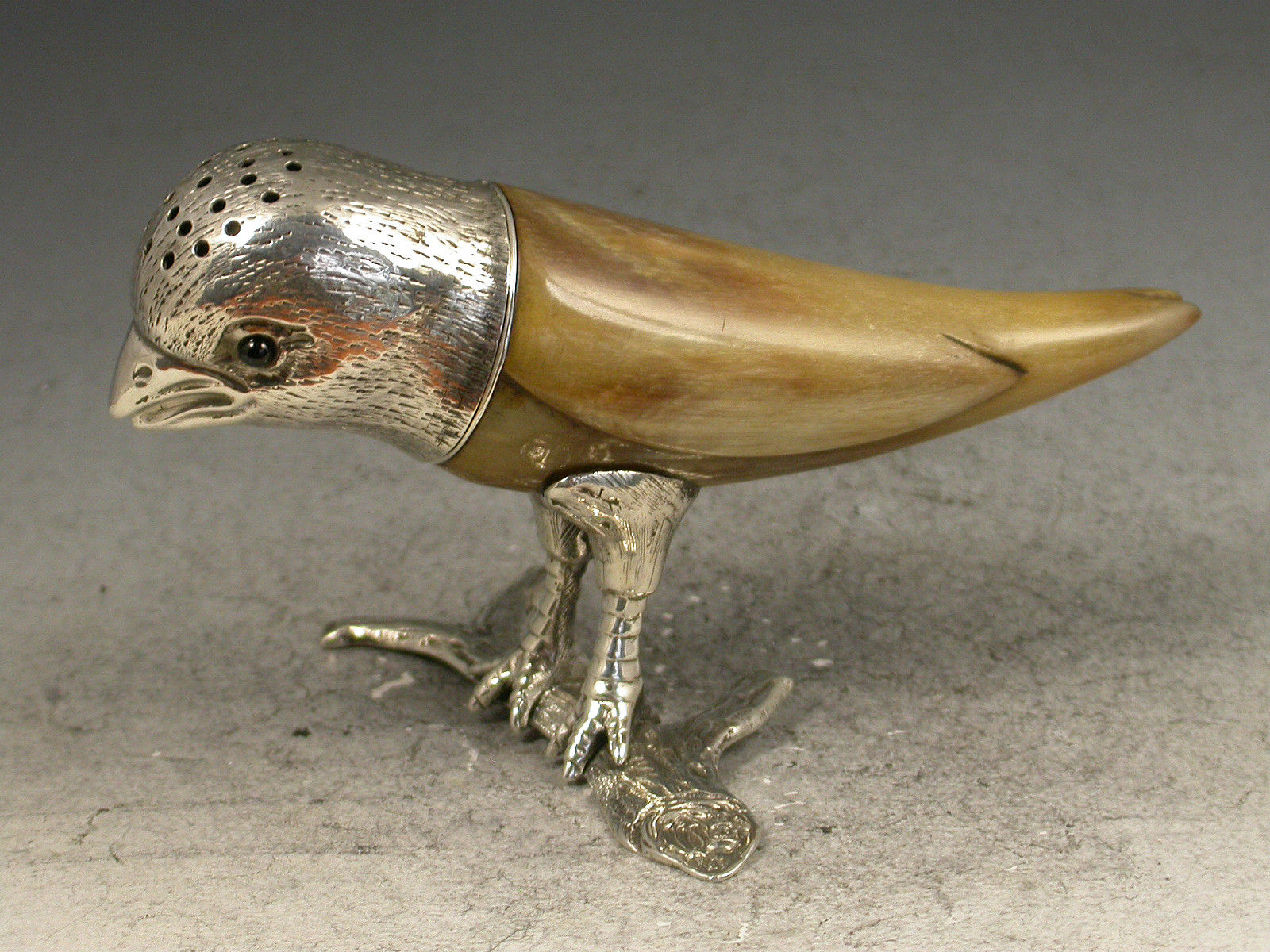 A very unusual Victorian novelty silver mounted horn Pepper, natralistically formed as a Parakeet standing on a branch, the pierced pull-off head with garnet eyes.