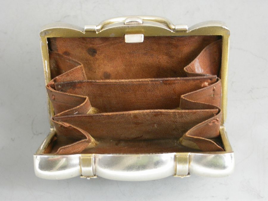 An unusual Victorian novelty silver and parcel gilt Coin Purse made in the form of a Valise with swing handle, hinging open to reveal brown leather interior with three compartments.