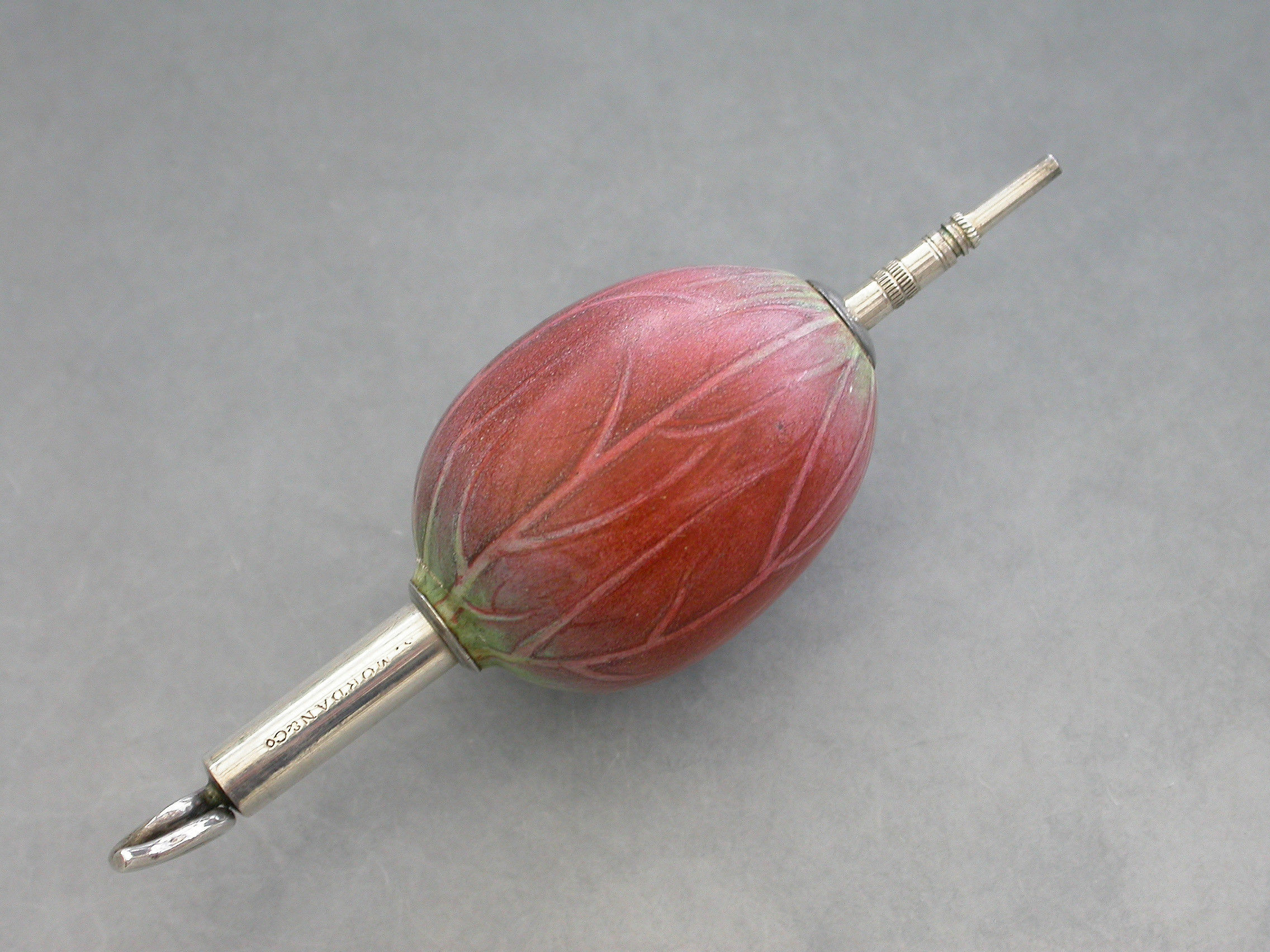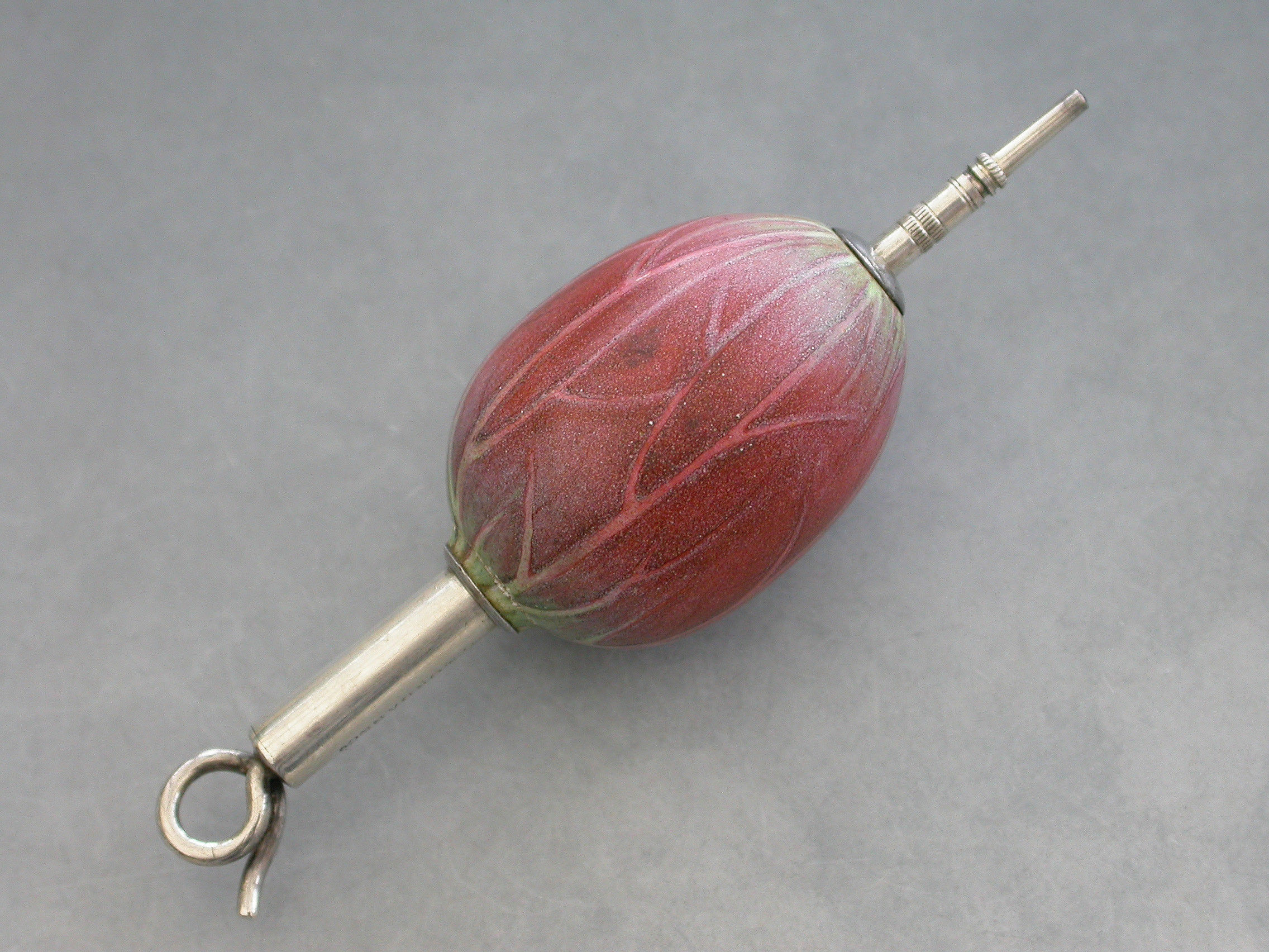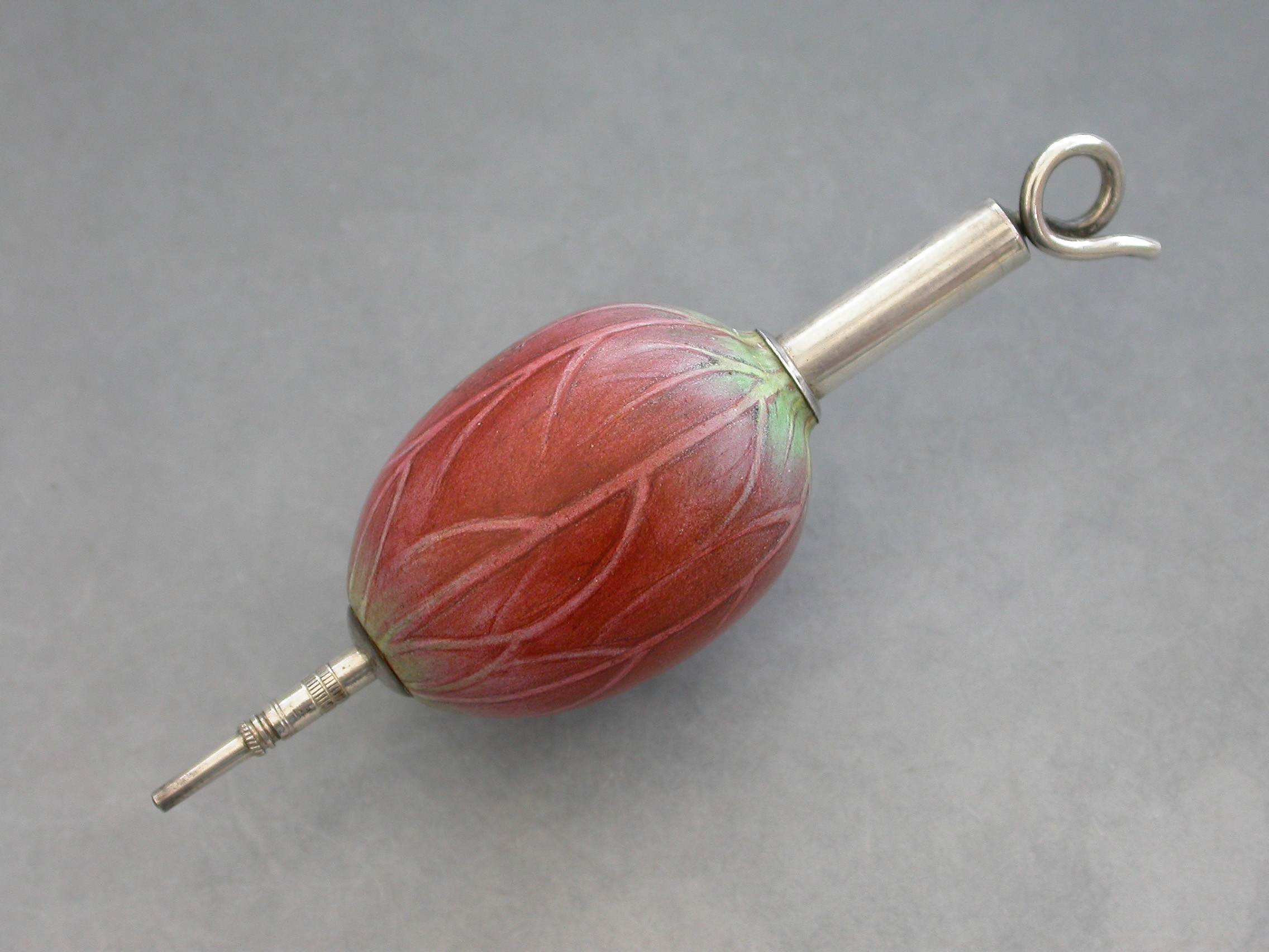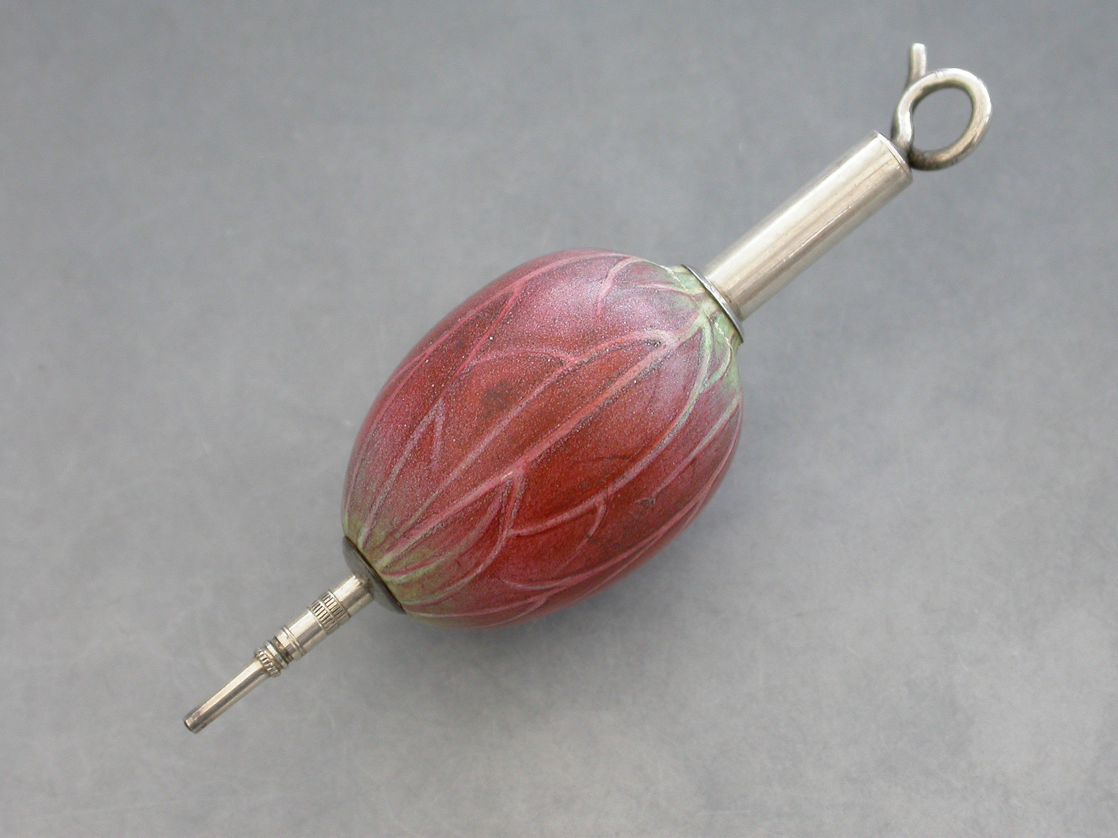 An extremely rare Victorian novelty silver and porcelain telescopic Propelling Pencil, the body realistically painted as a Lotus Flower Bud, with twisted wire handle.