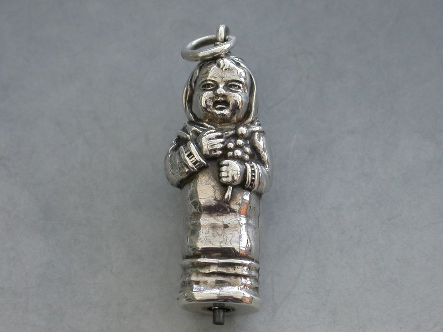 A rare Victorian novelty silver Propelling Pencil formed as a baby in swaddling clothes holding a rattle.