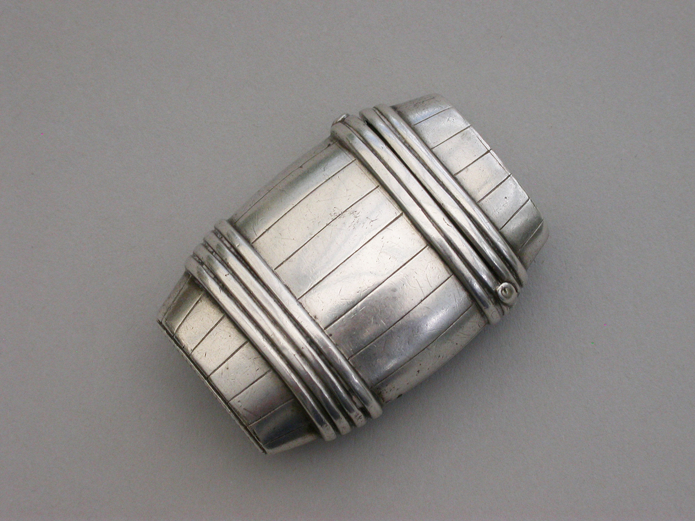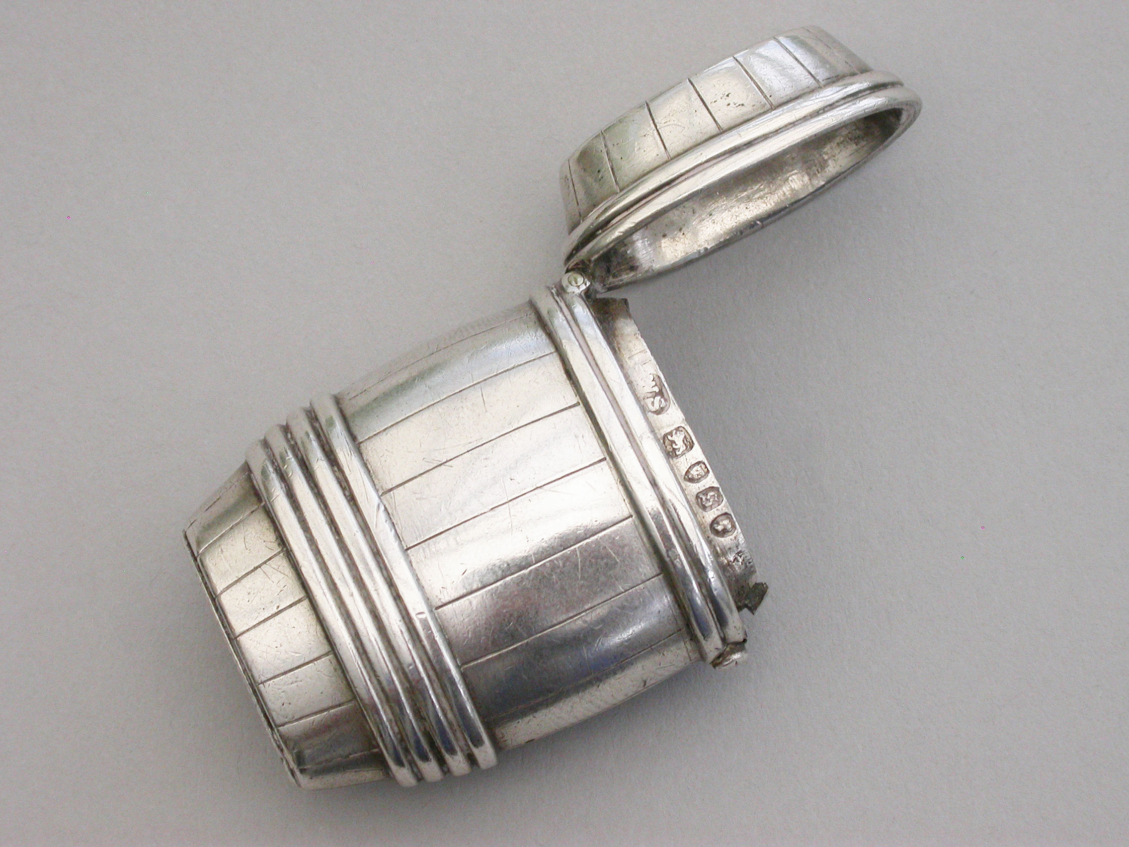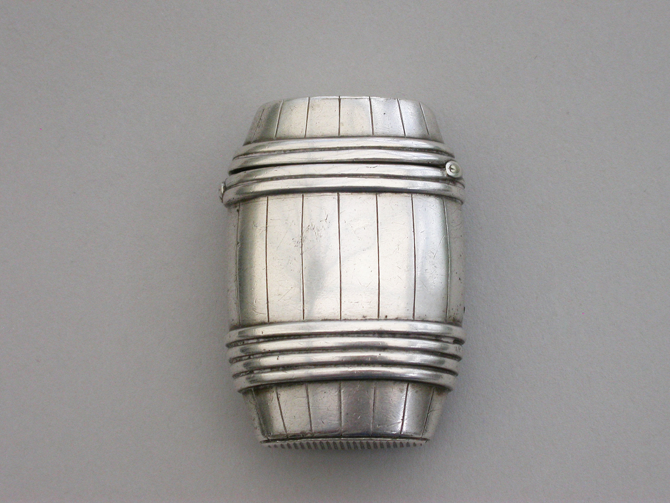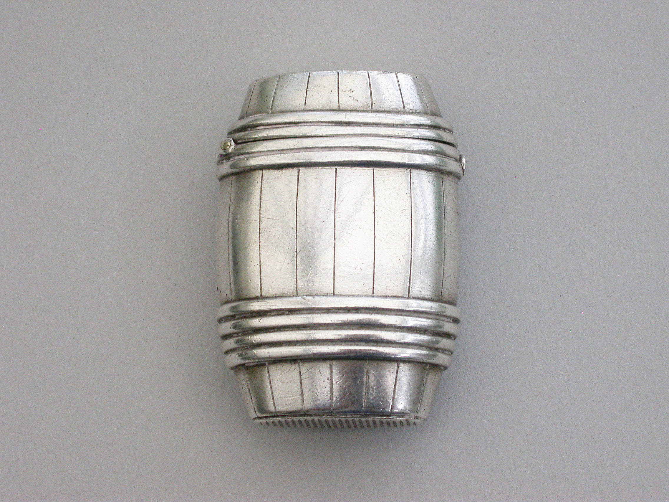 A rare Victorian novelty silver Vesta Case made in the form of a coopered barrel, the hinged lid with push-button opening mechanism, striker to the base.