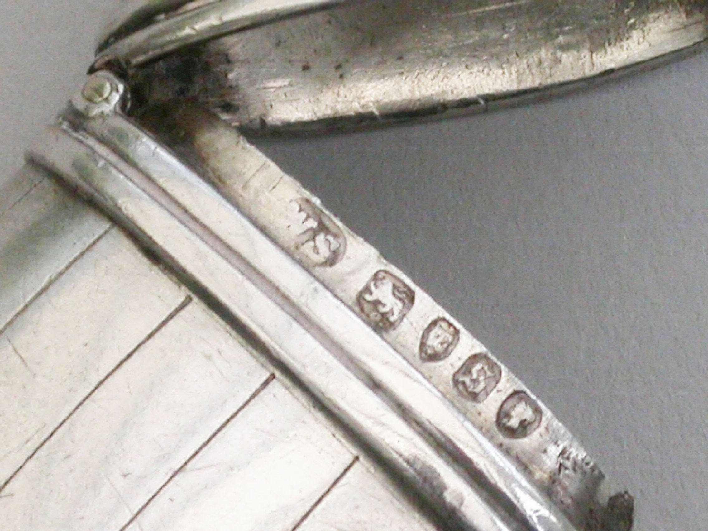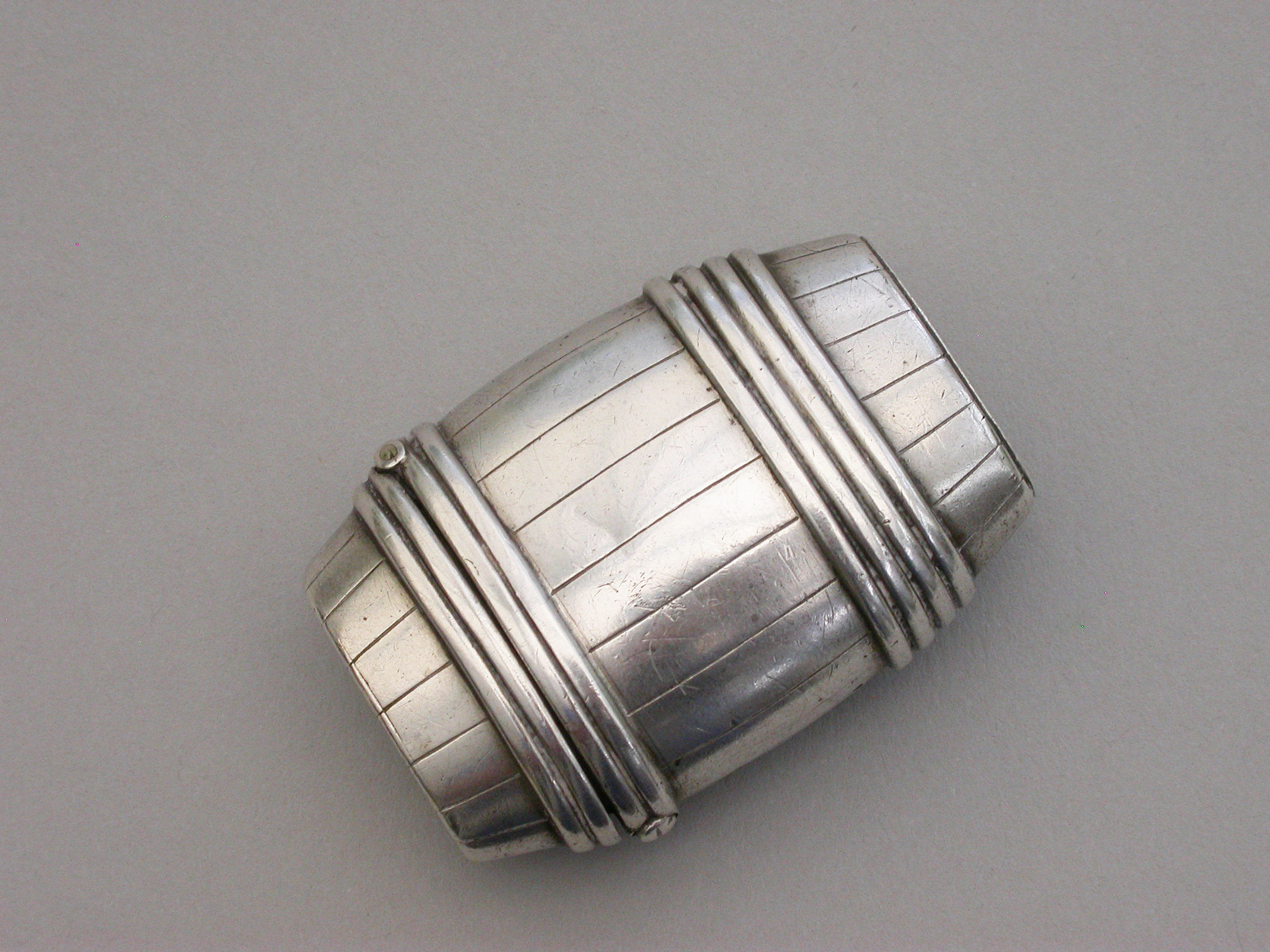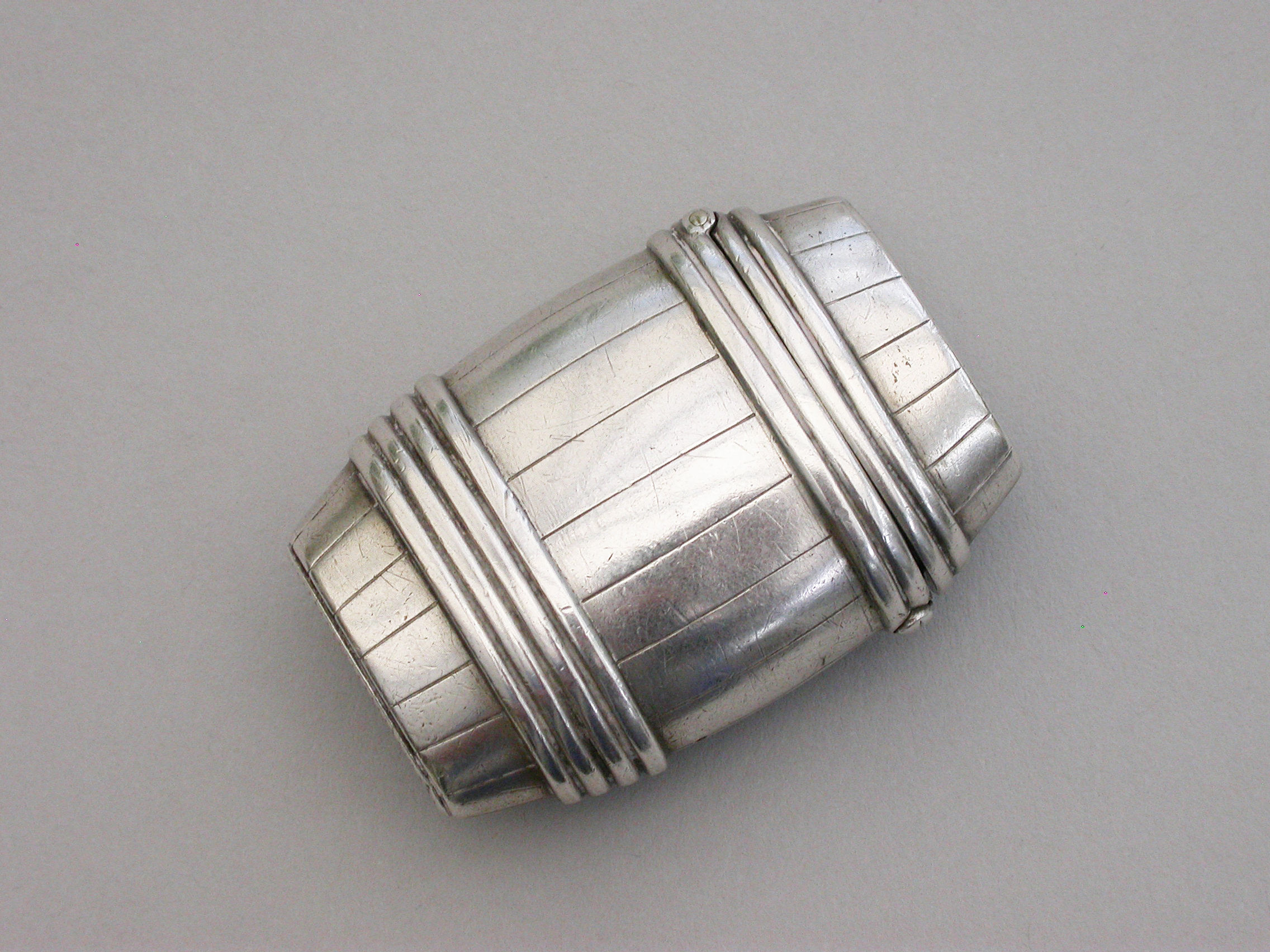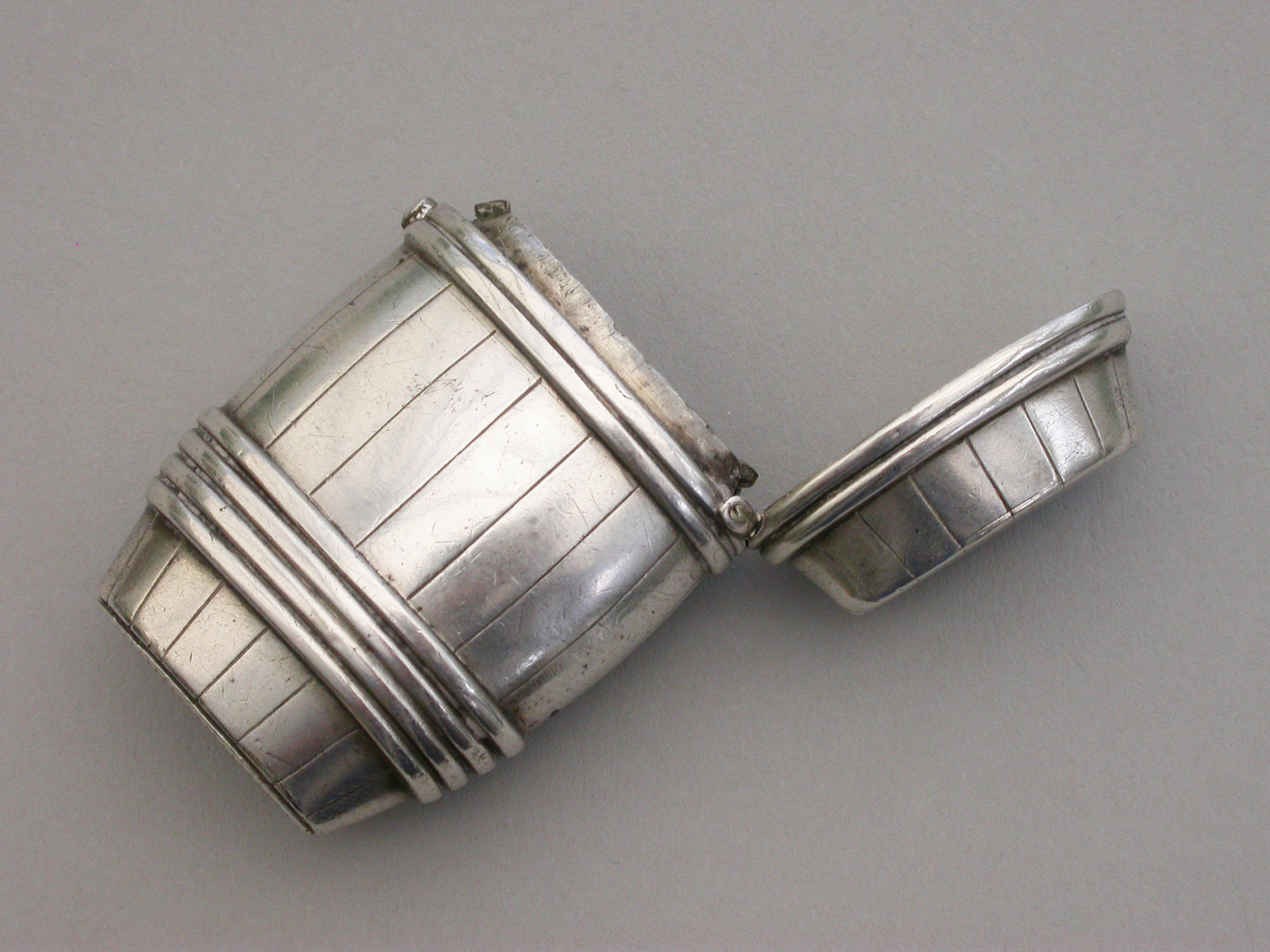 A rare Victorian novelty silver Vesta Case made in the form of a coopered barrel, the hinged lid with push-button opening mechanism, striker to the base.