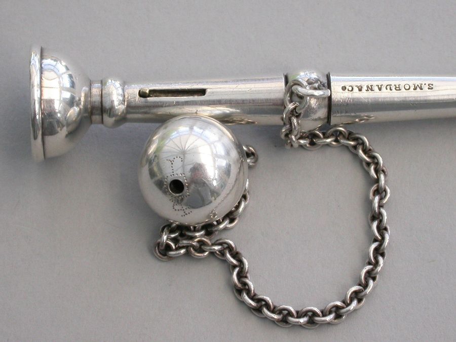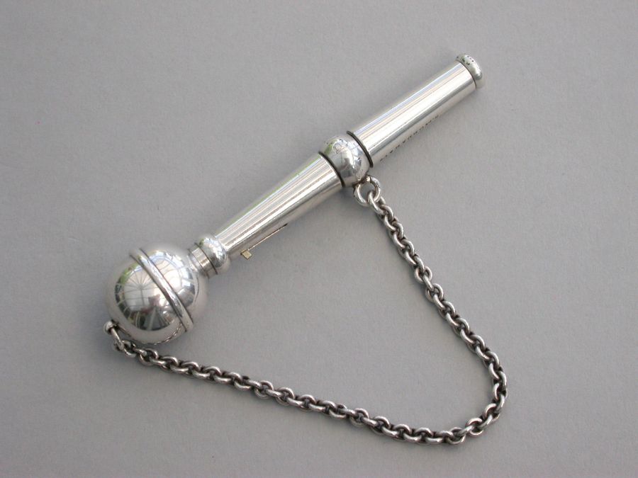 An extremely rare Victorian novelty silver Propelling Pencil, made in the form of a 'Bilboquet' or Cup & Ball Game. The silver ball is secured by a suspension chain and screws onto a metal peg located at the base of the cup. The peg can be extended or repelled by a sliding mechanism on the side of the pencil. The pencil itself is extended by a twist mechanism.