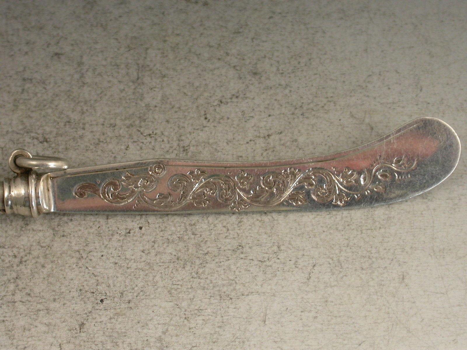 A rare Victorian novelty silver Propelling Pencil made in the form of a Butter Knife, the pistol shape handle with leaf capped end, the scimitar shaped blade engraved with foliate scroll decoration.