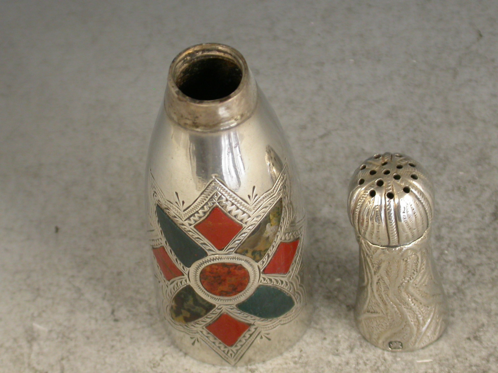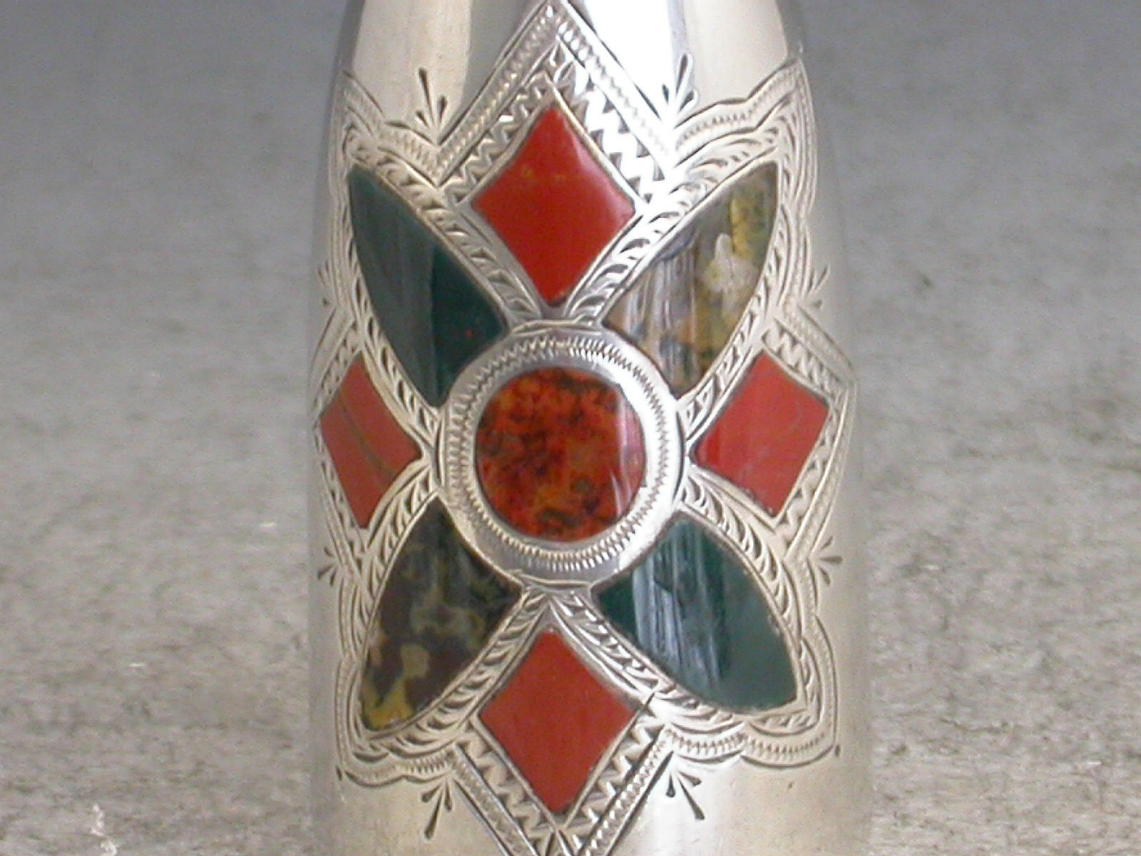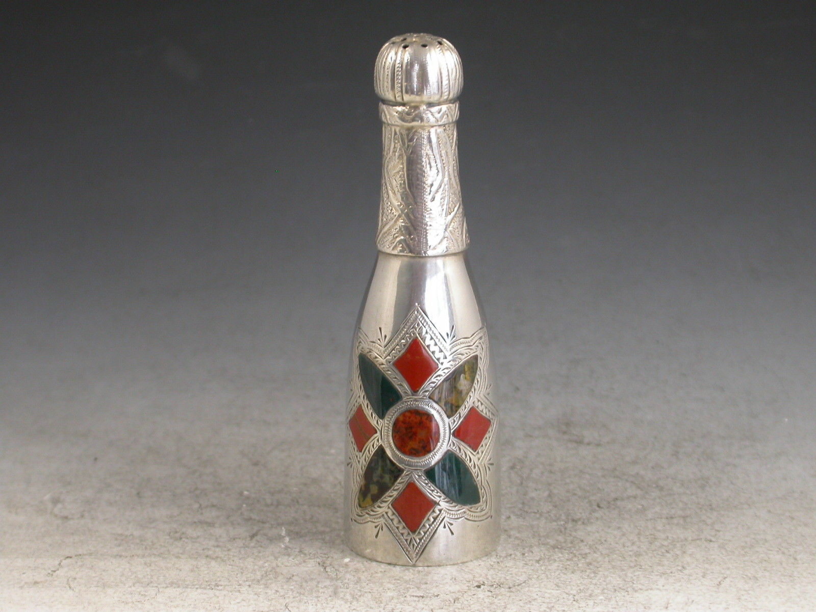 A rare Victorian novelty silver Pepper made in the form of a Champagne Bottle with screw off top section, the body inset with a pattern of various coloured Scottsh hard stones.