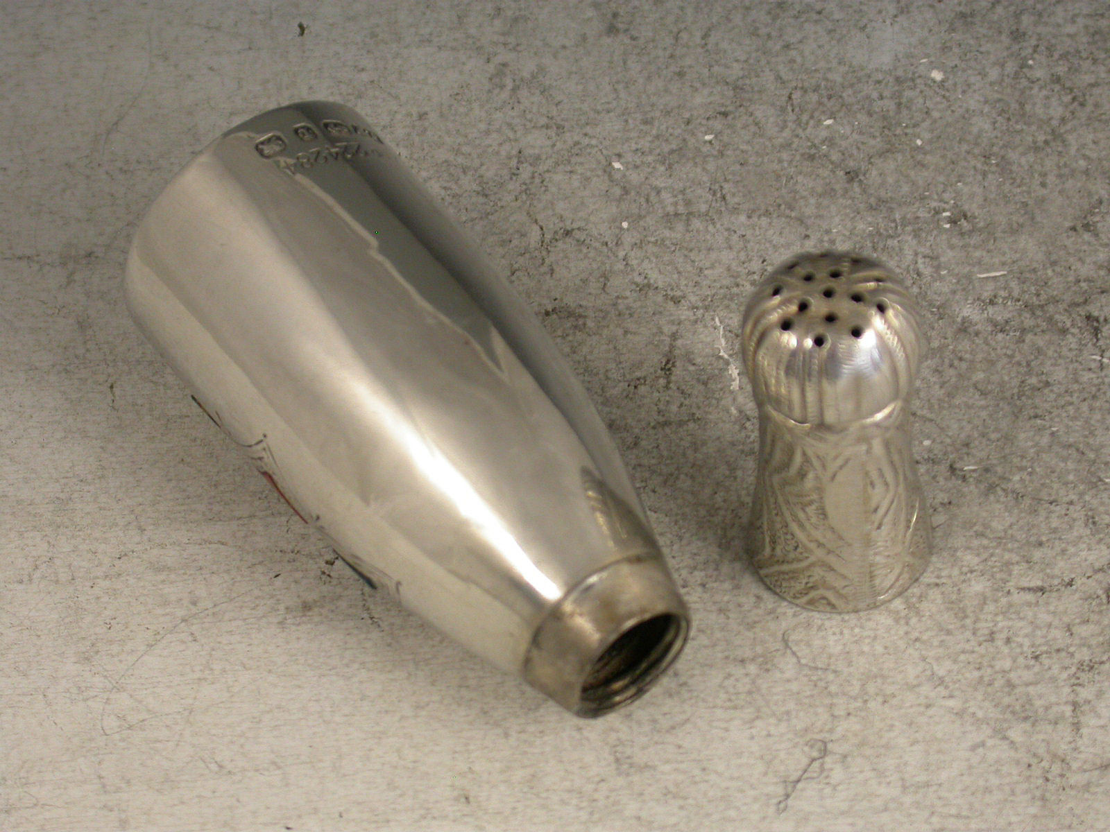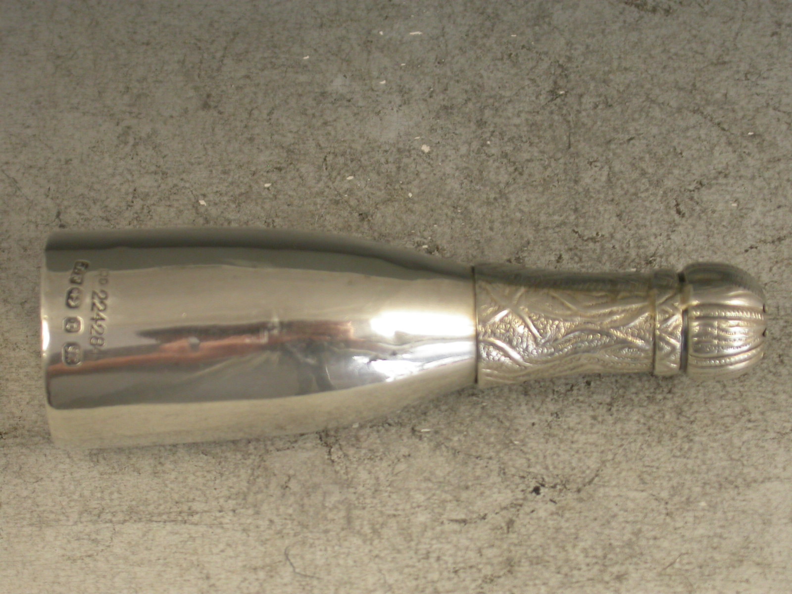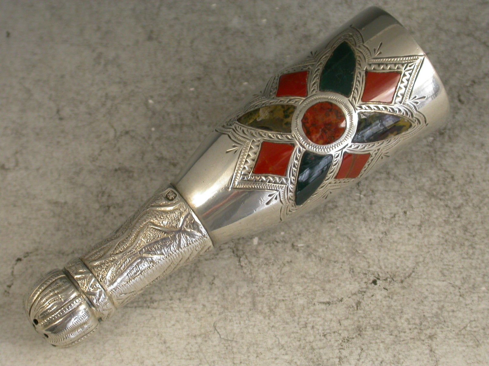A rare Victorian novelty silver Pepper made in the form of a Champagne Bottle with screw off top section, the body inset with a pattern of various coloured Scottsh hard stones.