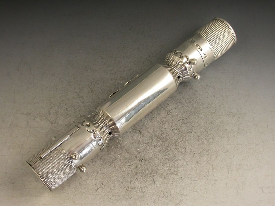 A Victorian novelty silver combination Desk Item, made in the form of a Christmas Cracker, one end with pull off cover to the tubular wax compartment the other with hinged lid to match compartment and upright tubular match holder, the body with applied decoration of dancers.