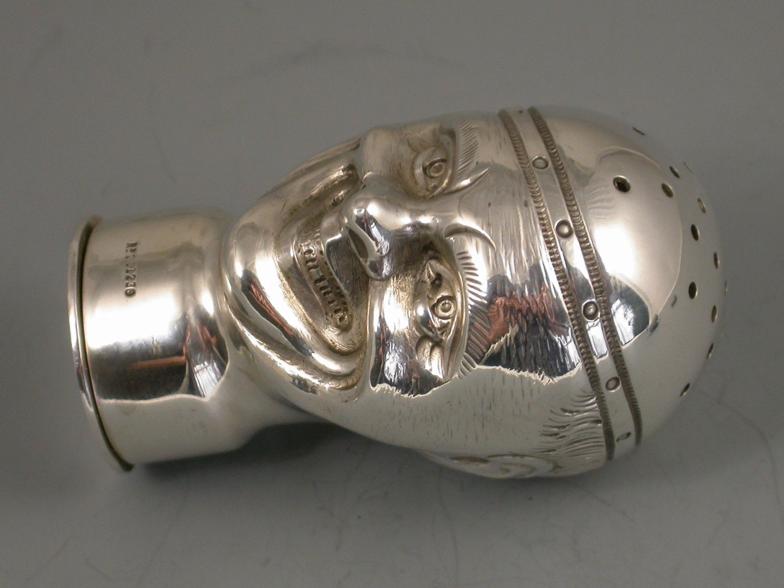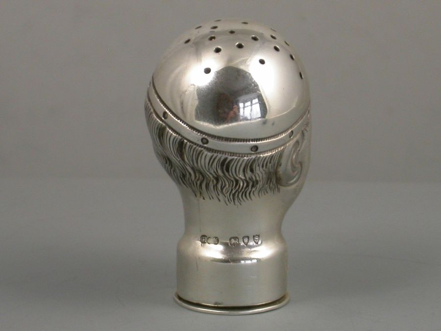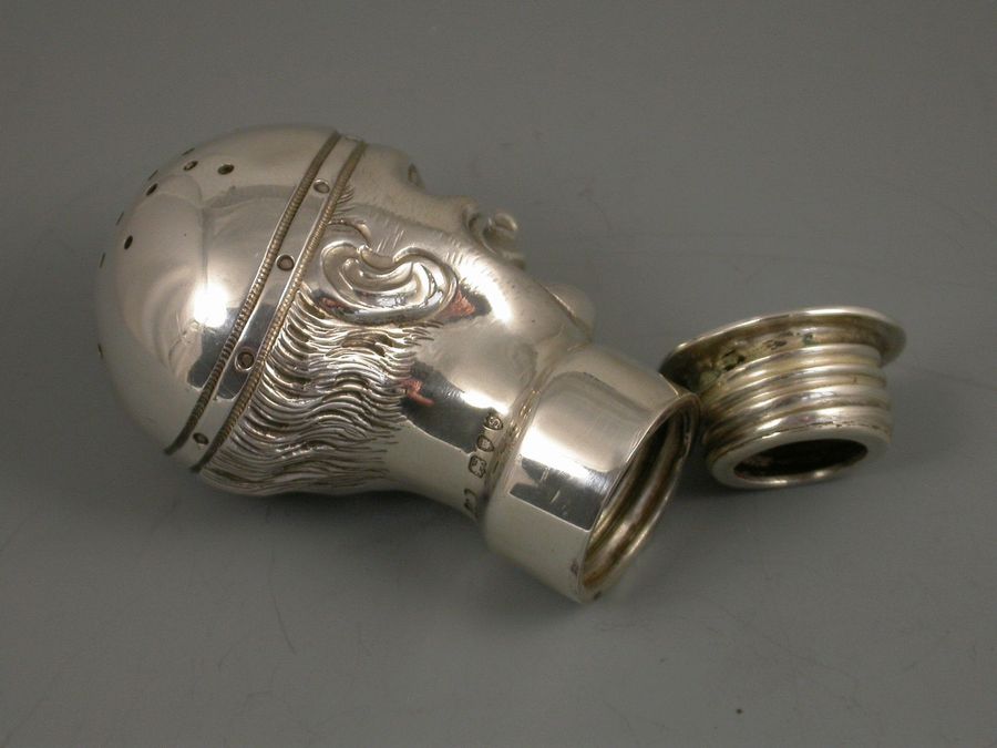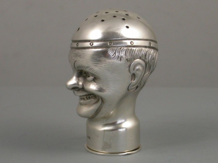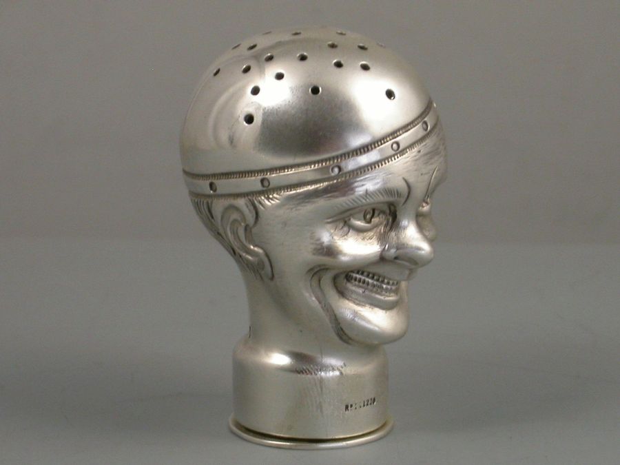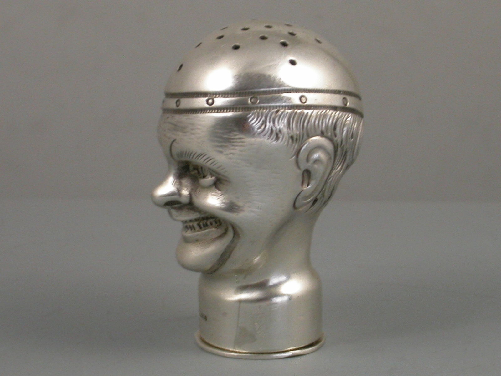 An unusual Victorian novelty silver Pepper formed as a Clown's head or a grinning man wearing a scull cap, with screw off base. Engraved with registered design number.
