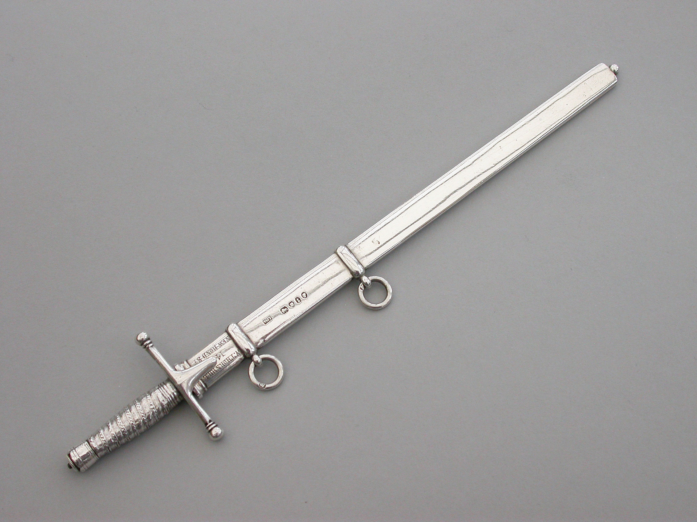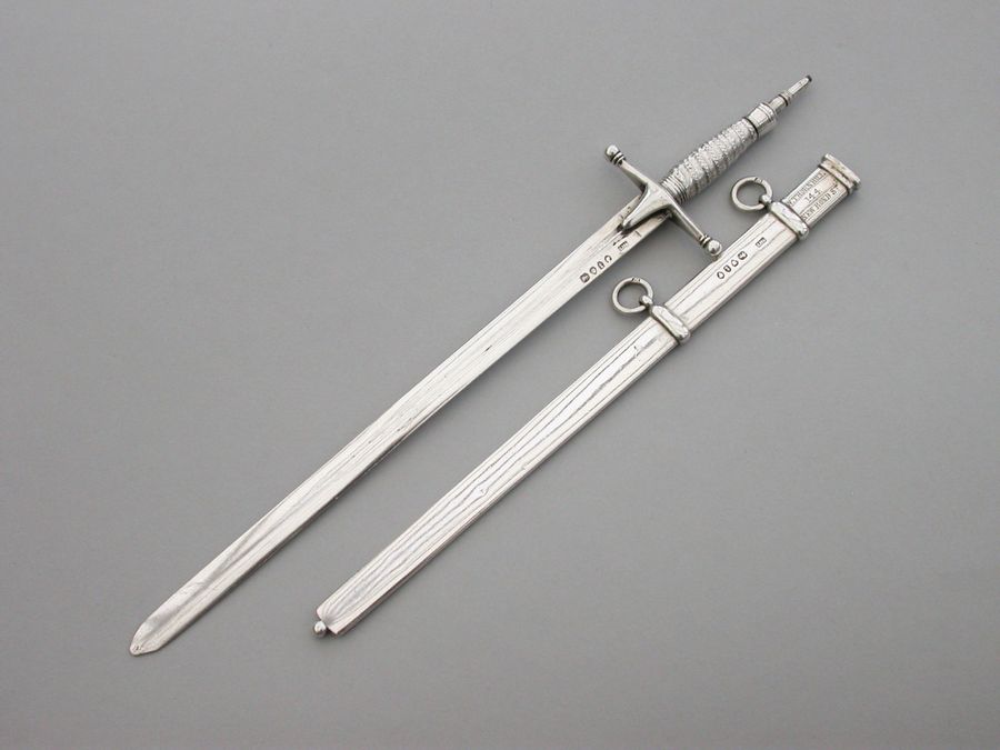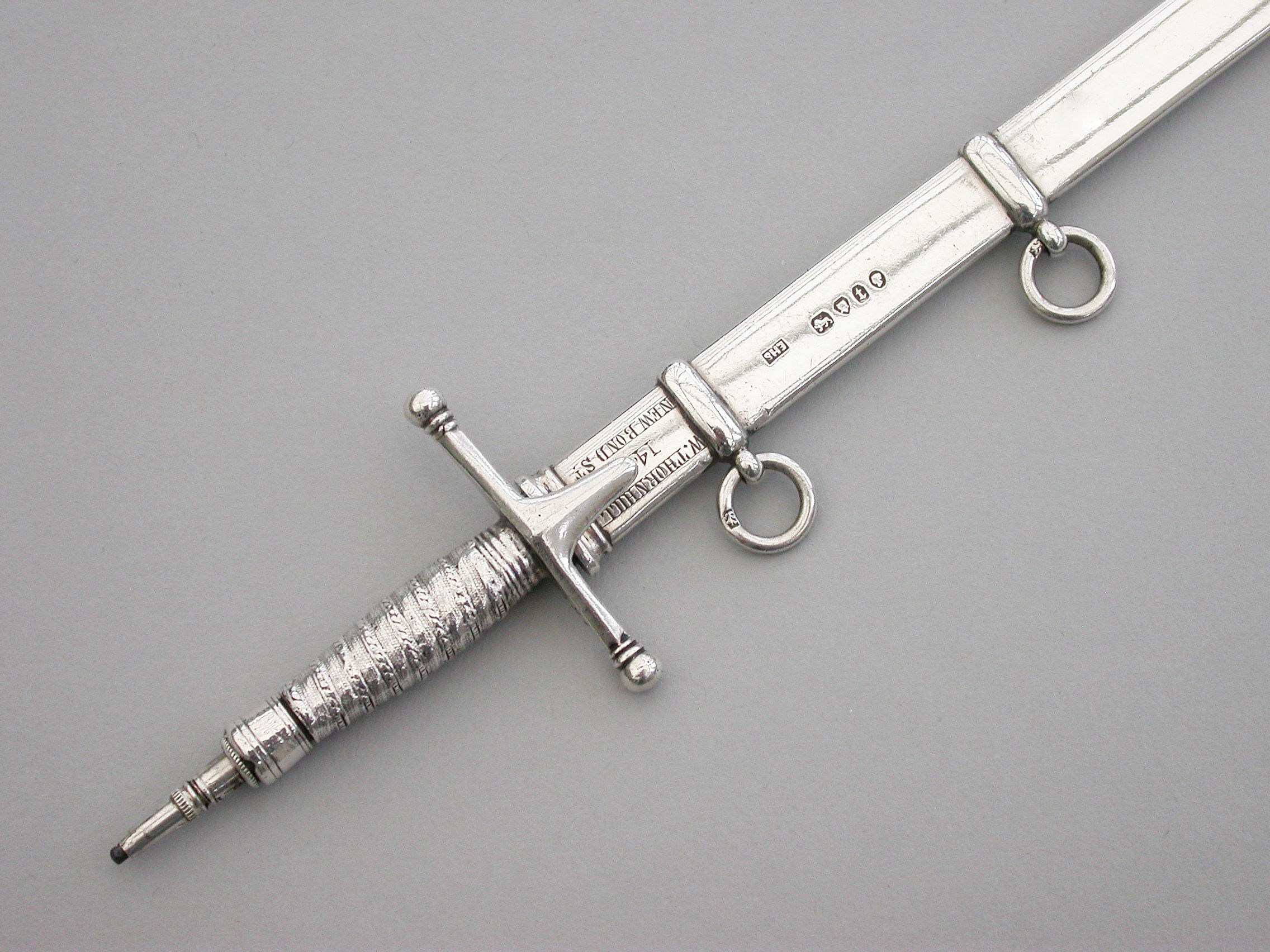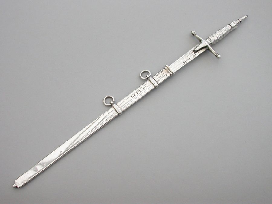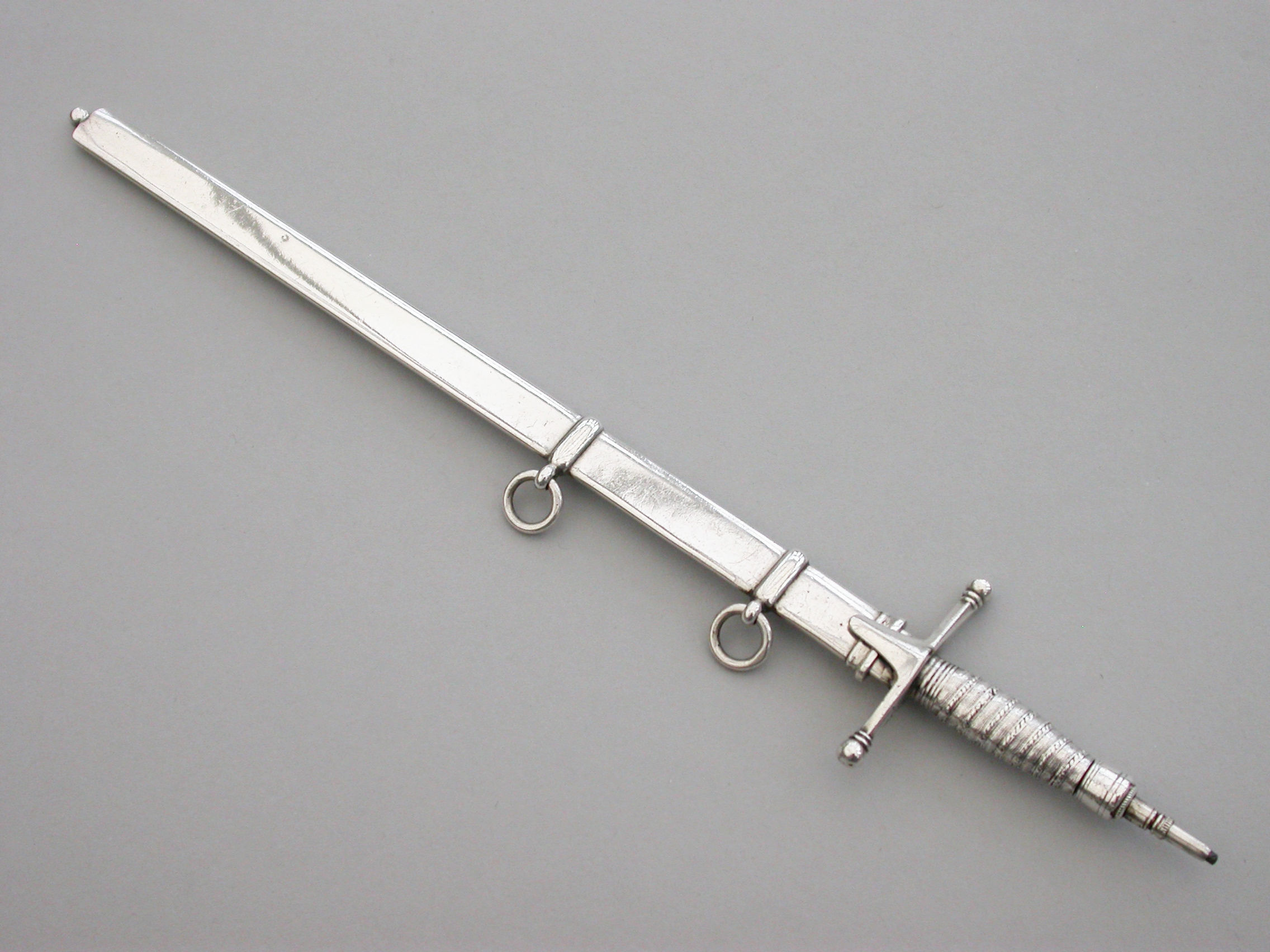 A fine quality and rare Victorian novelty silver combined Propelling Pencil and Paper Knife made in the form of a Officer's Broad Sword, with pull-off scabbard with attached suspension rings, the propelling pencil emerging from the handle on a twist mechanism.