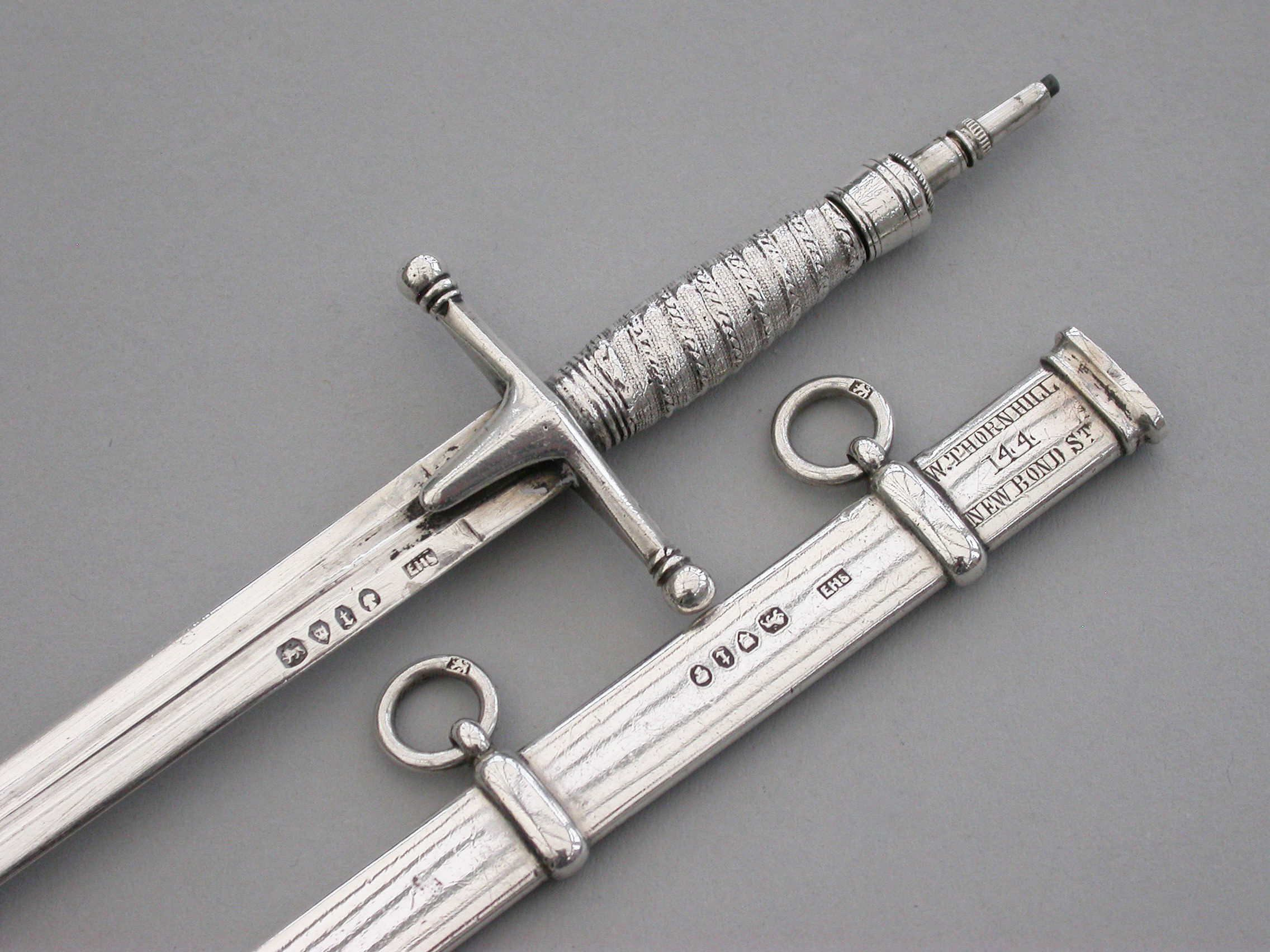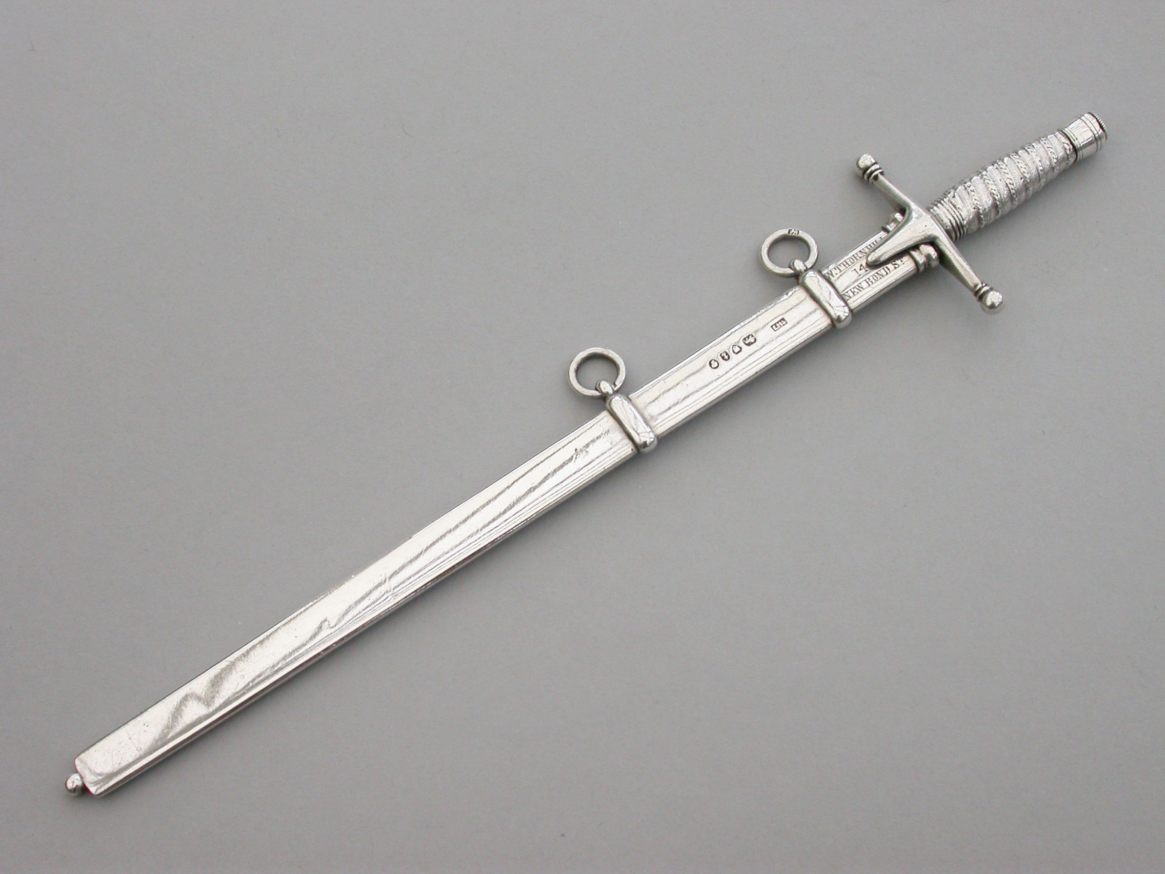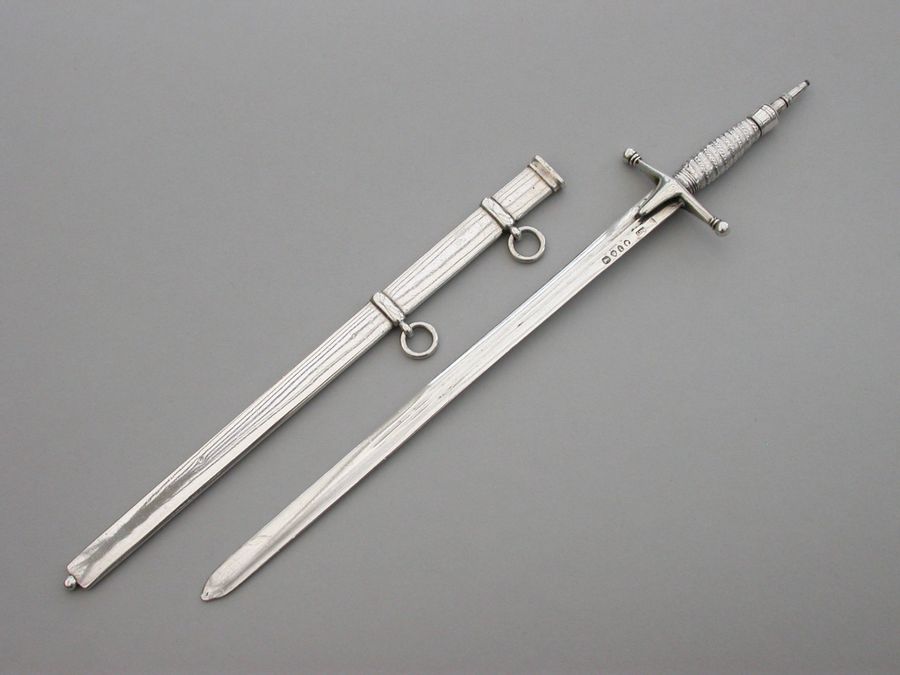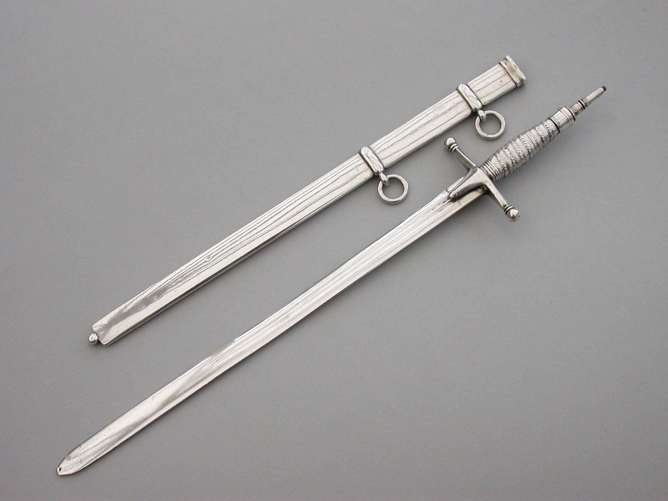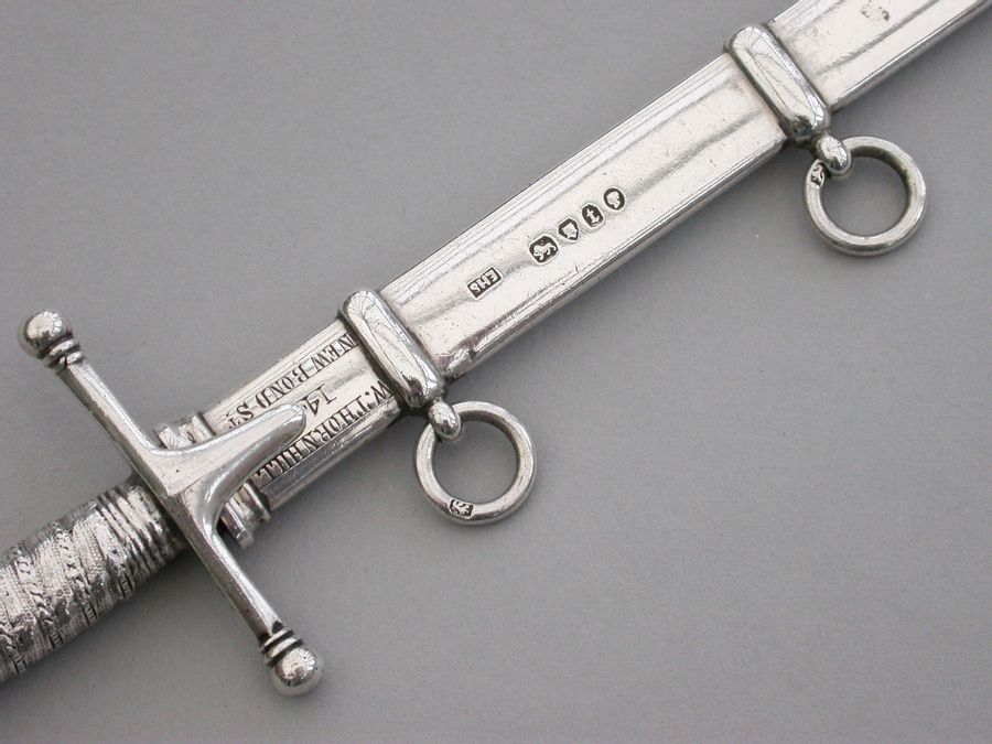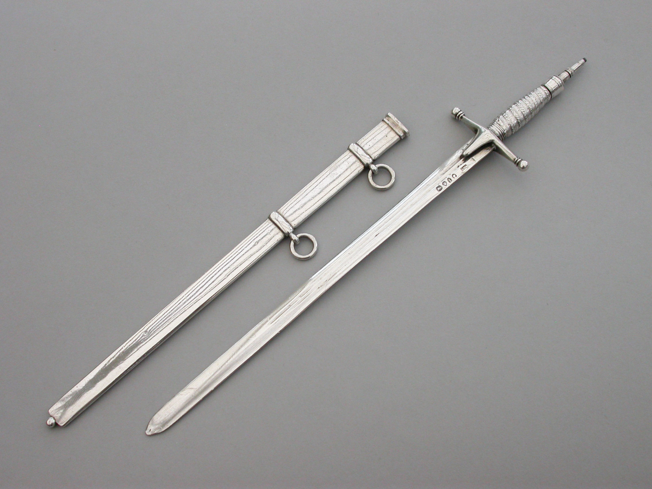 A fine quality and rare Victorian novelty silver combined Propelling Pencil and Paper Knife made in the form of a Officer's Broad Sword, with pull-off scabbard with attached suspension rings, the propelling pencil emerging from the handle on a twist mechanism.