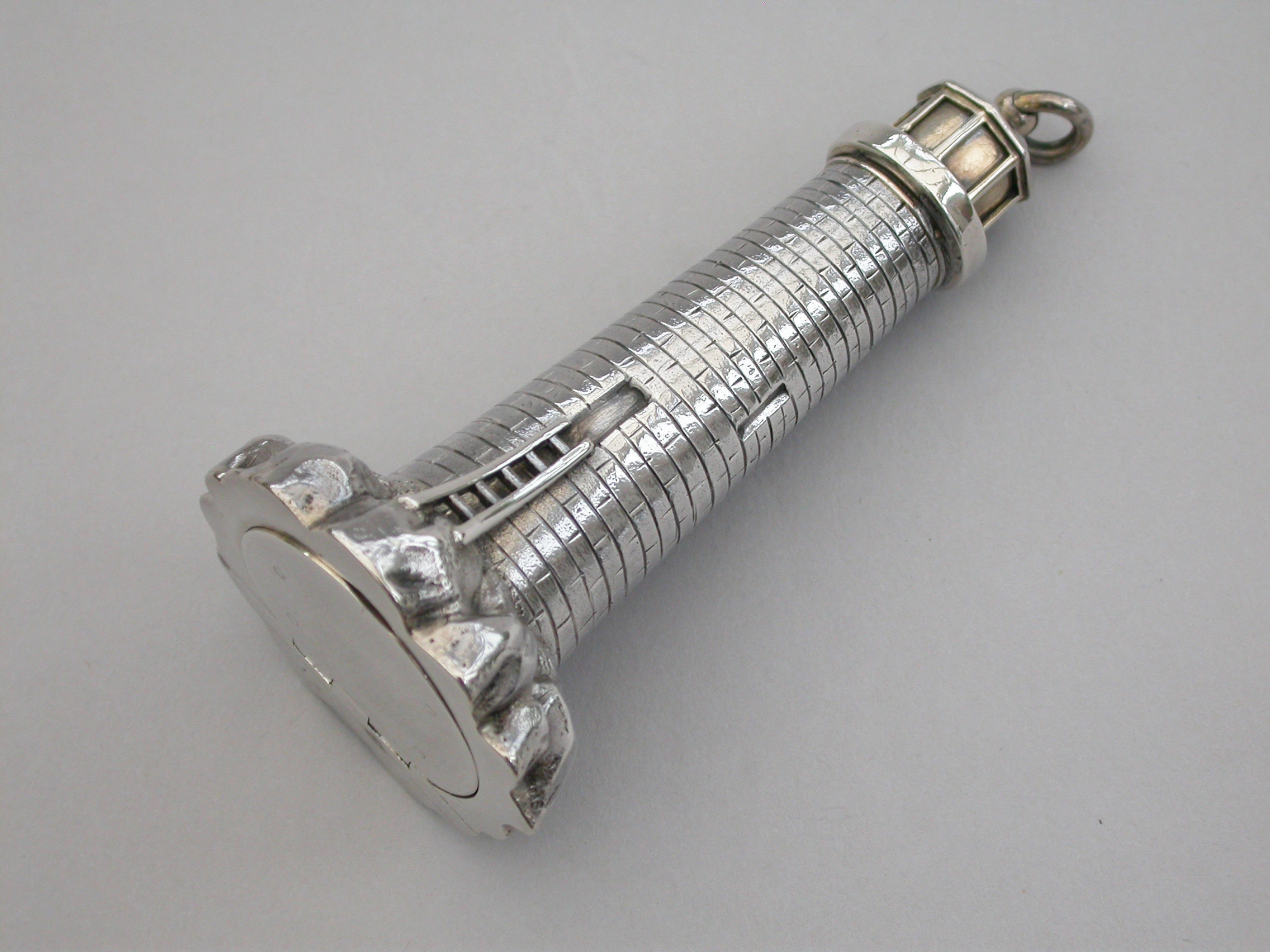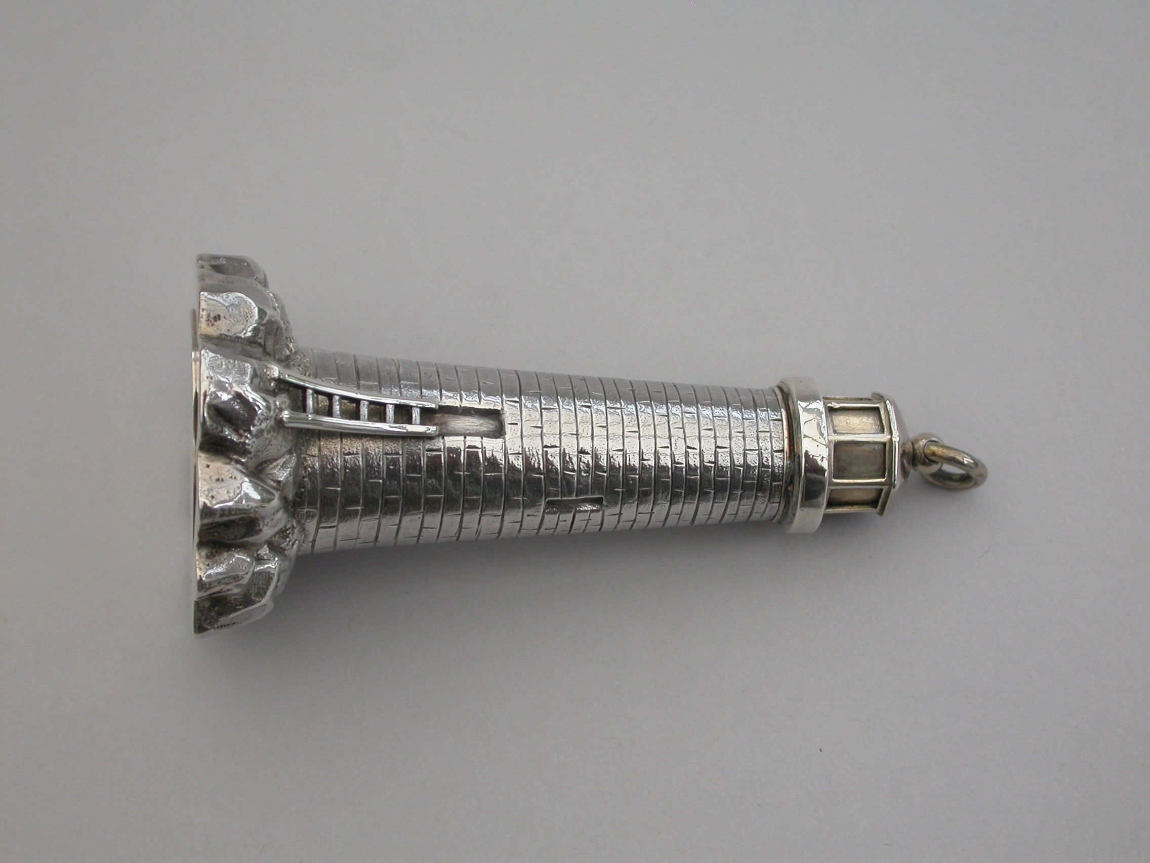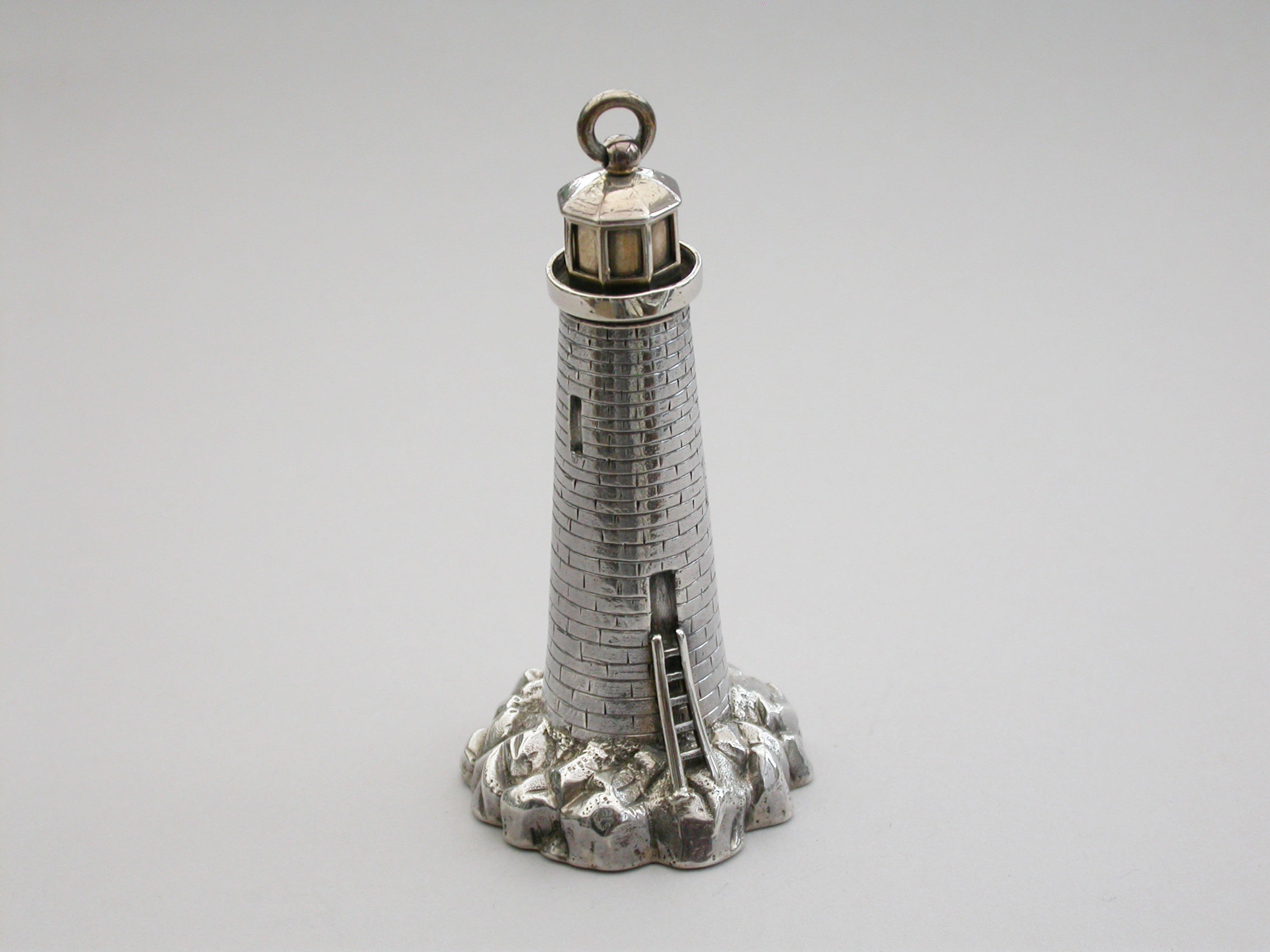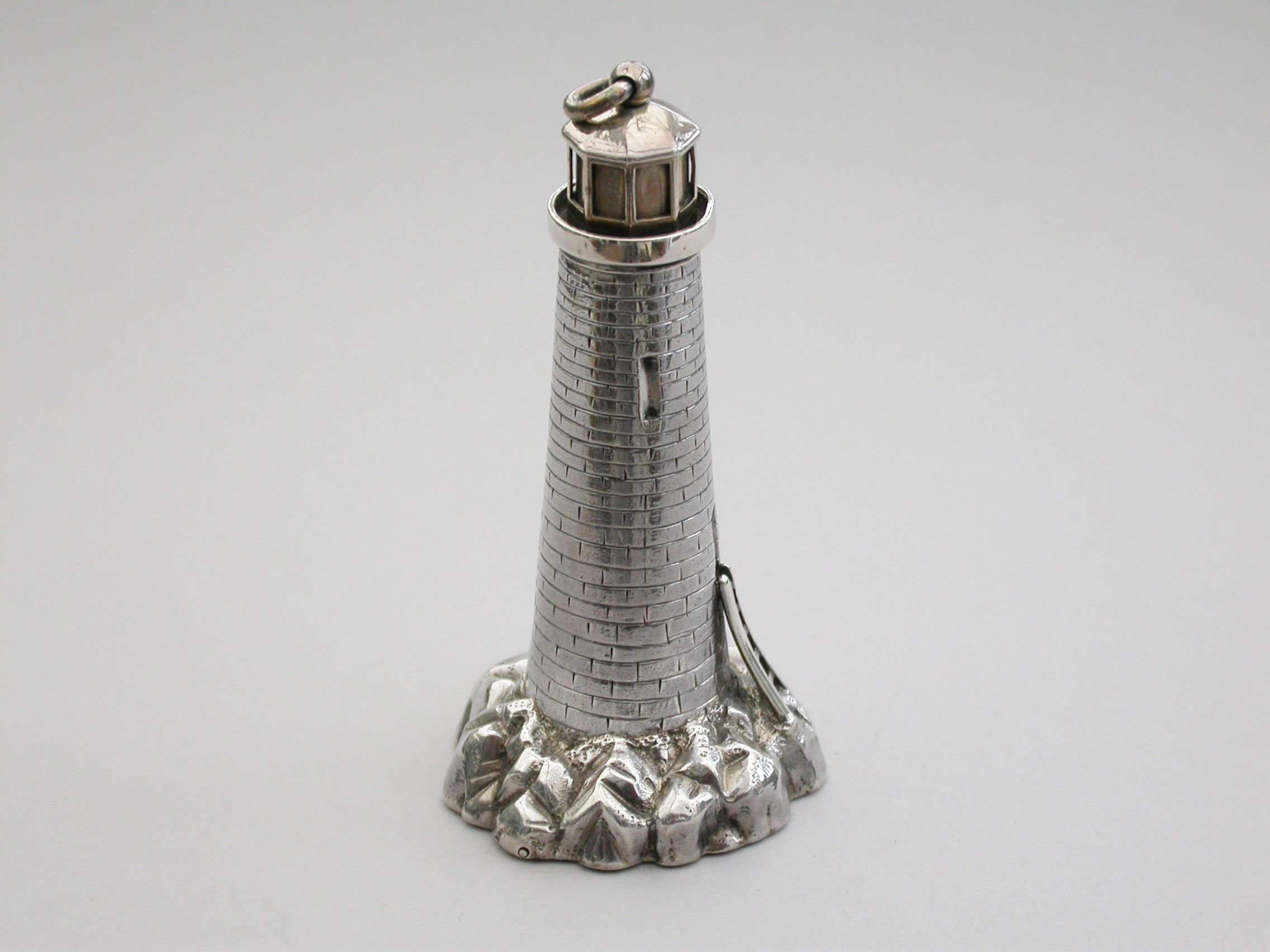 An extremely rare Victorian novelty silver and parcel gilt combination Scent Bottle and Vinaigrette made in the form of Smeaton's Lighthouse (the third Eddystone Lighthouse) standing on rocks, with brick built tower and four windows, a ladder to the doorway. The screw-off light chamber with attached suspension ring forming the lid to the scent bottle. The plain silver base with hinged cover opening to reveal a pull-off grille pierced with a central flower head.