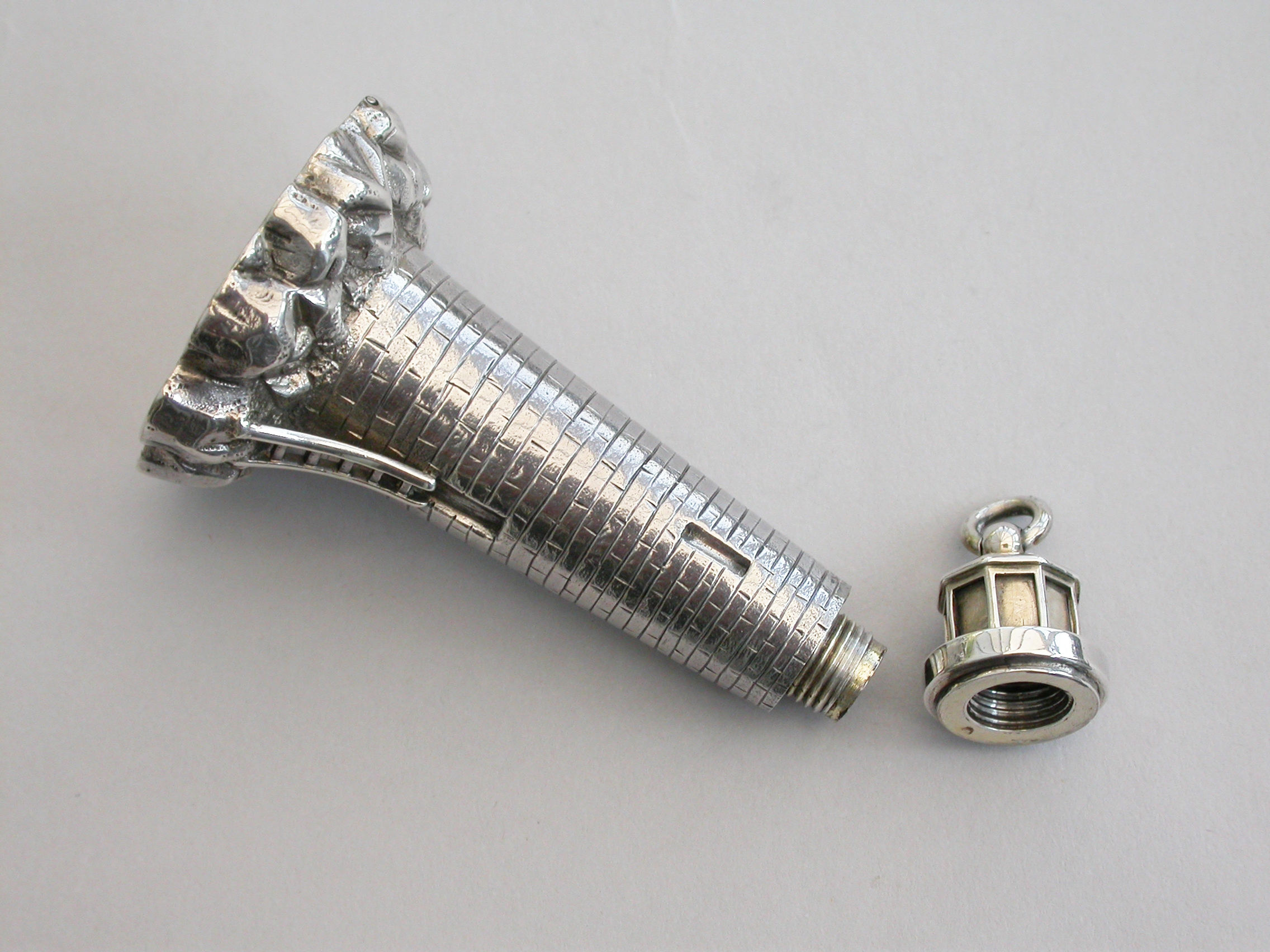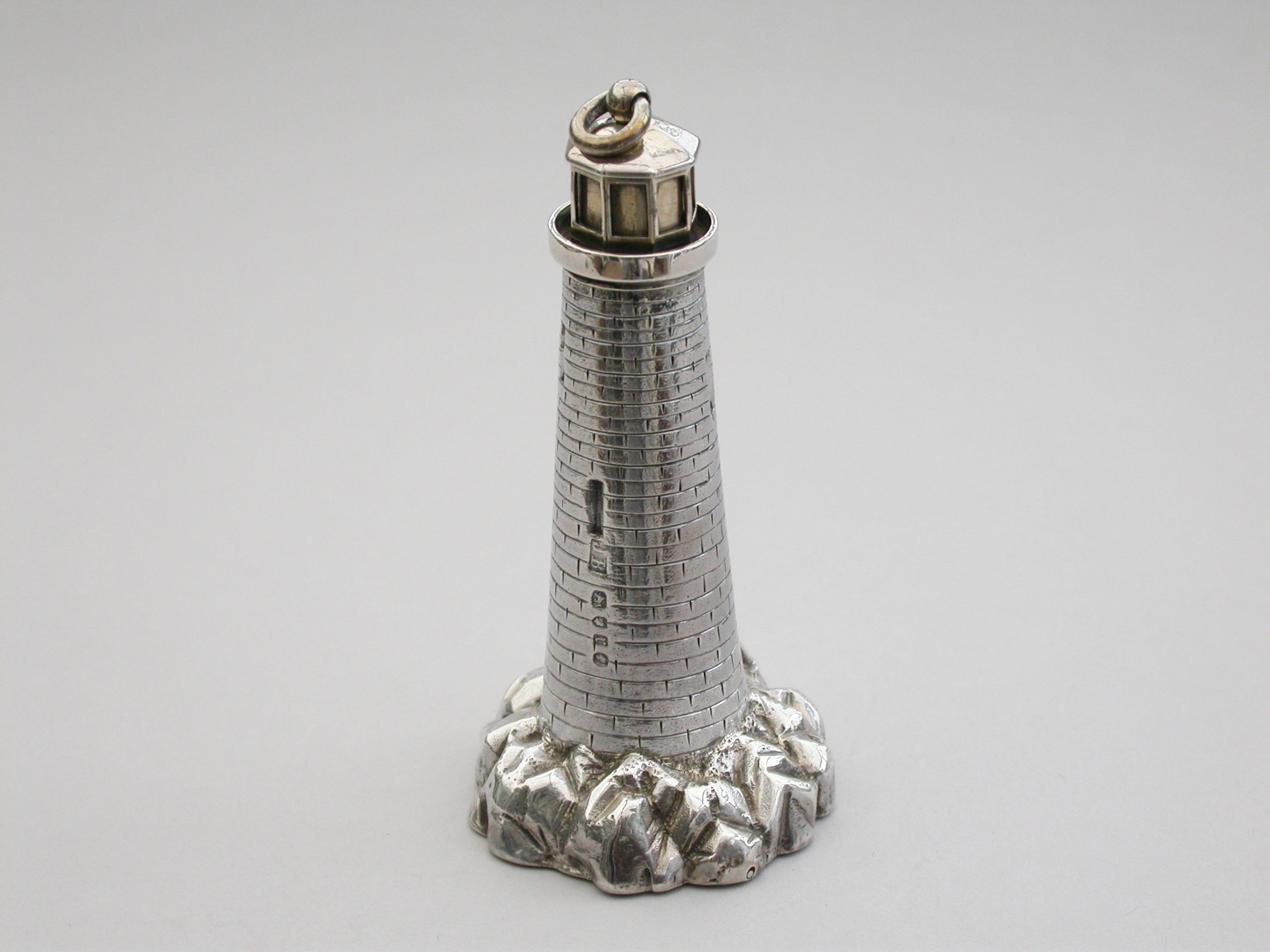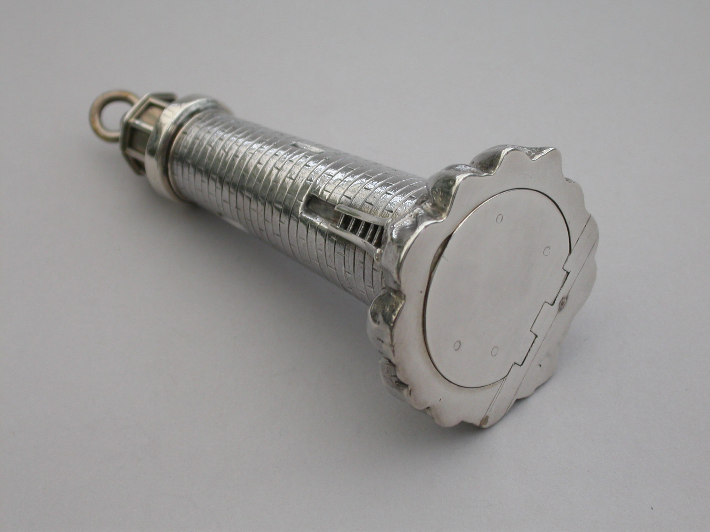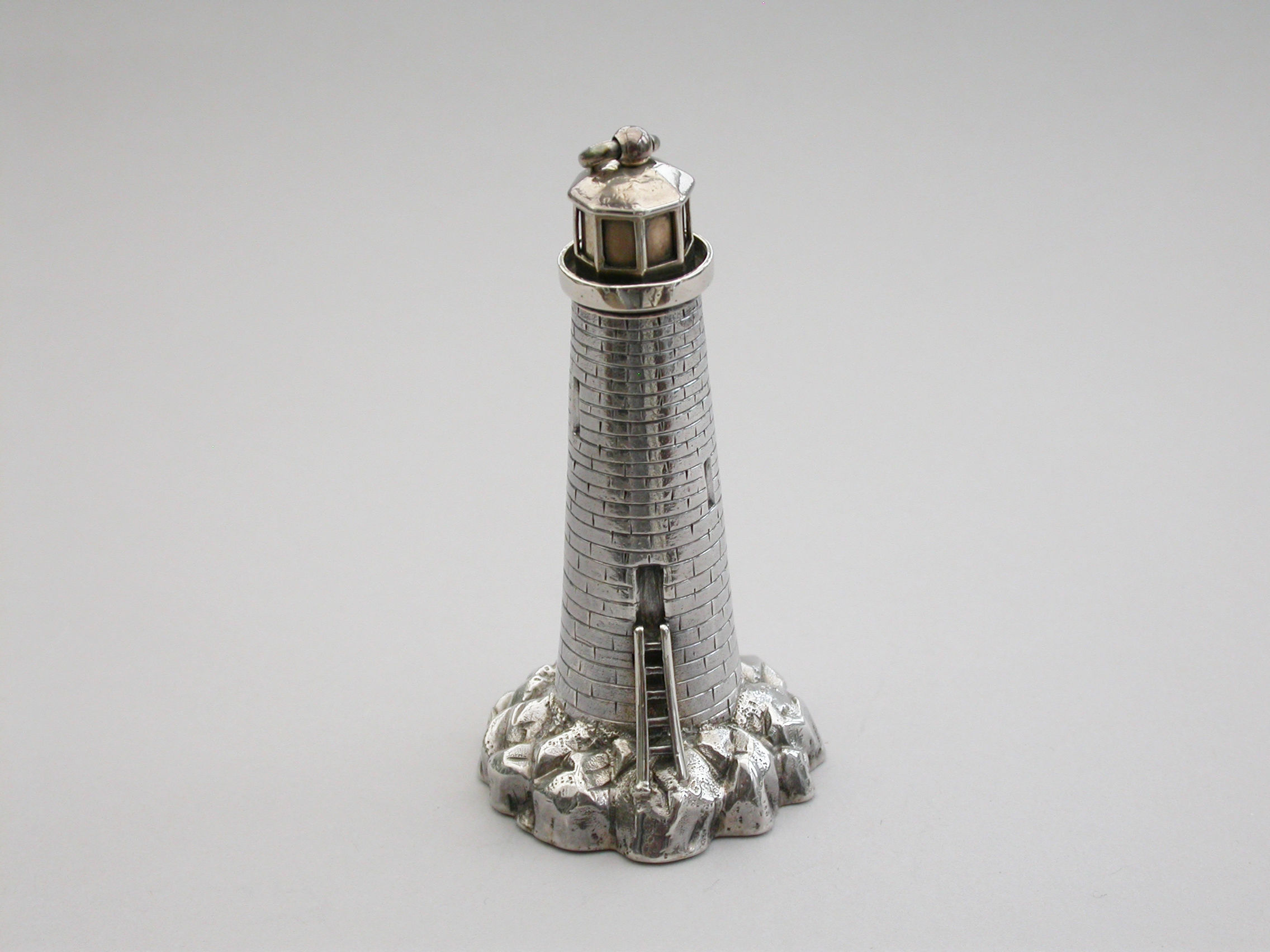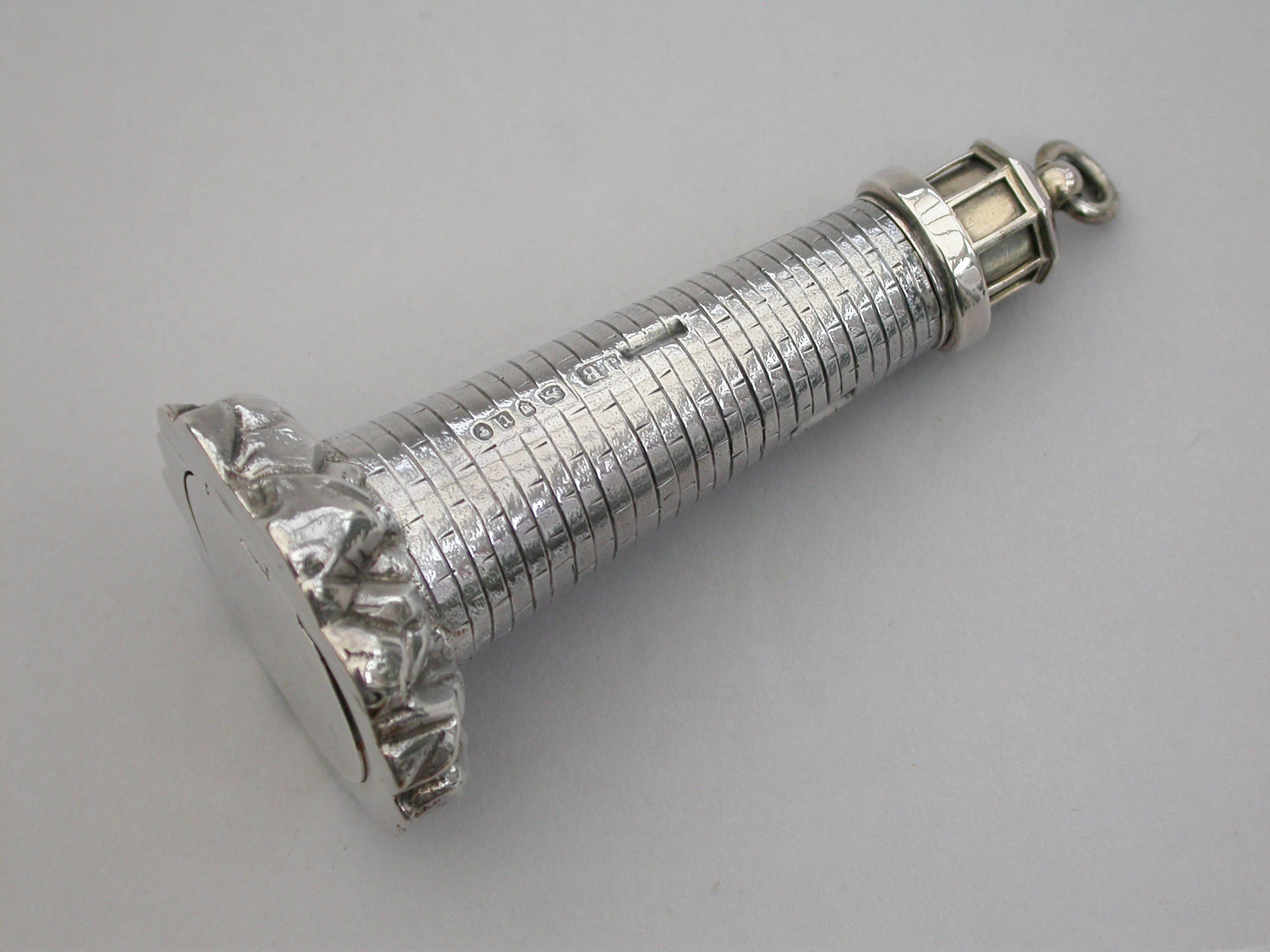 An extremely rare Victorian novelty silver and parcel gilt combination Scent Bottle and Vinaigrette made in the form of Smeaton's Lighthouse (the third Eddystone Lighthouse) standing on rocks, with brick built tower and four windows, a ladder to the doorway. The screw-off light chamber with attached suspension ring forming the lid to the scent bottle. The plain silver base with hinged cover opening to reveal a pull-off grille pierced with a central flower head.