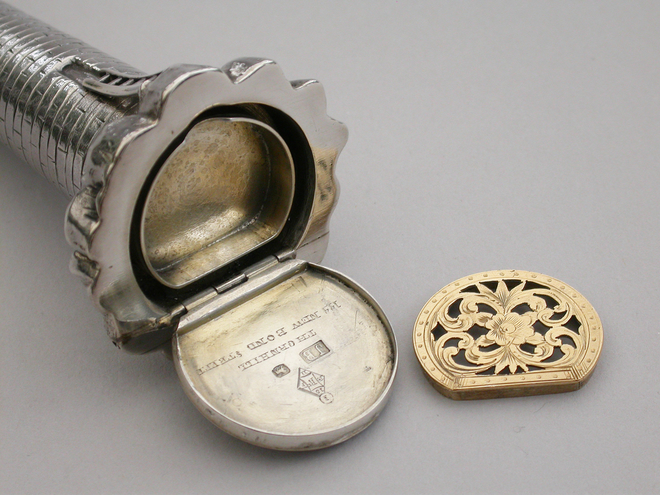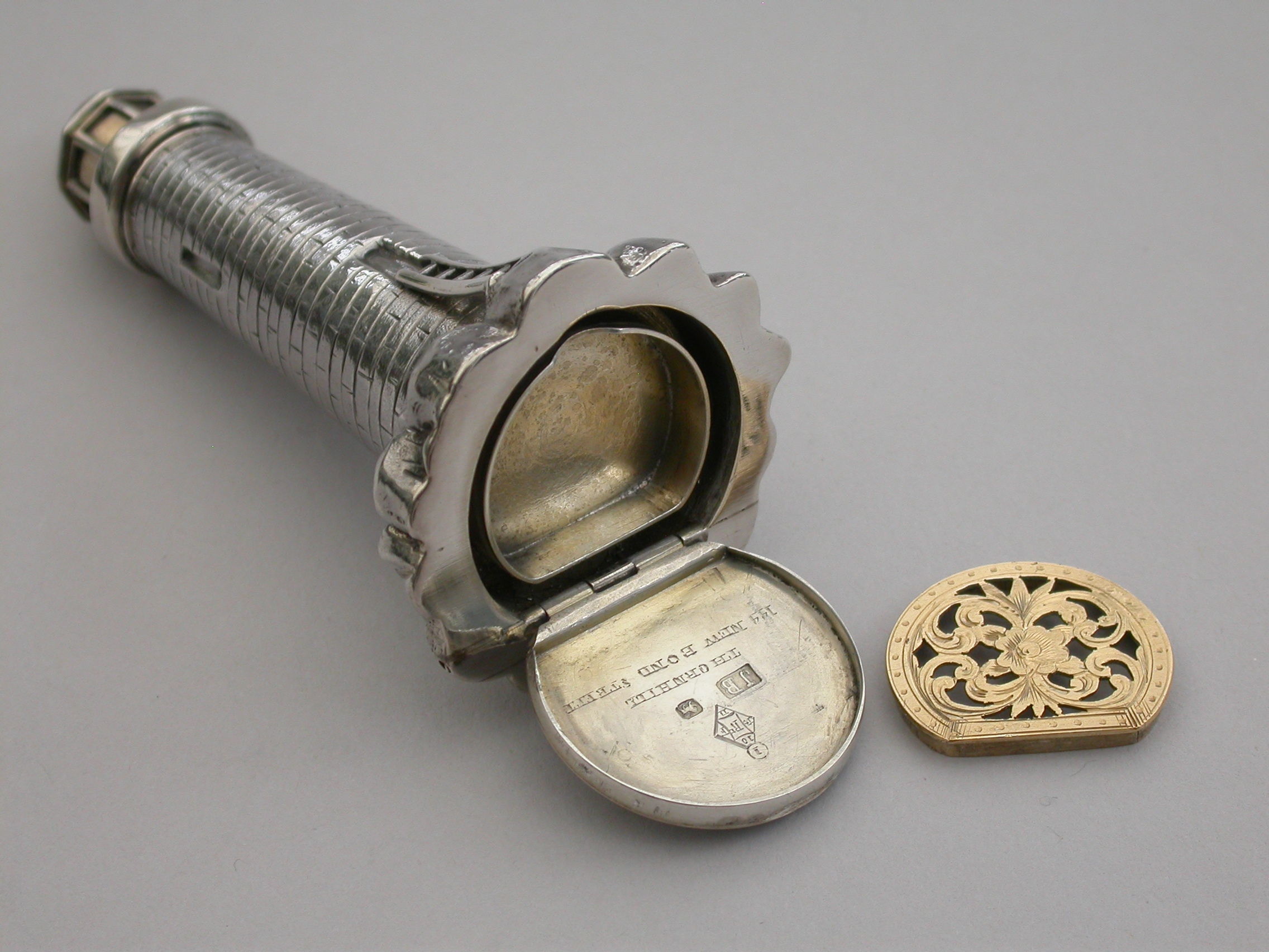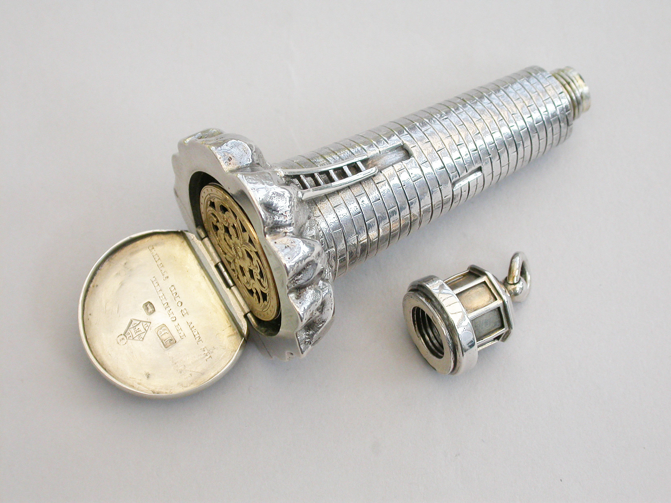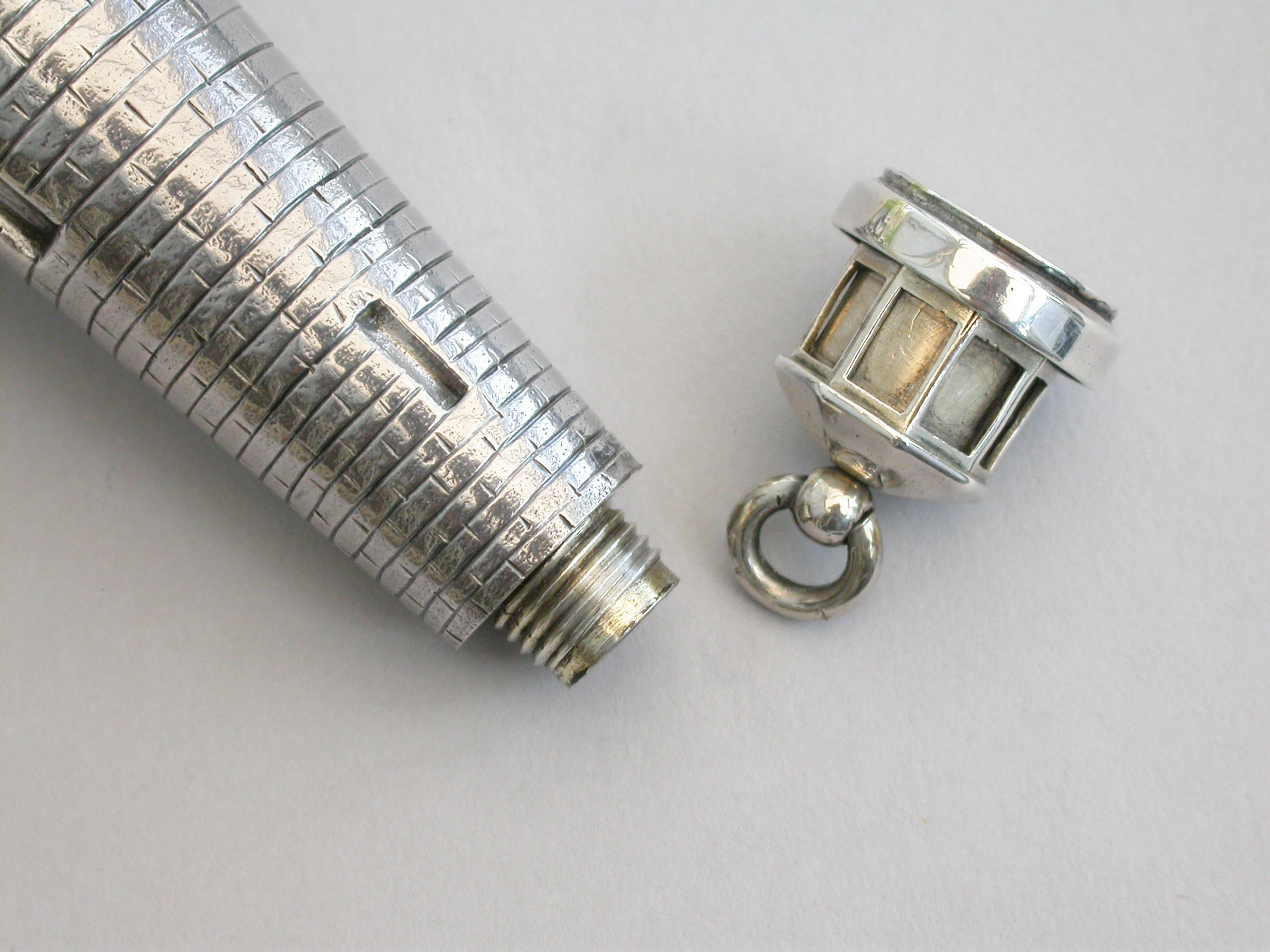 An extremely rare Victorian novelty silver and parcel gilt combination Scent Bottle and Vinaigrette made in the form of Smeaton's Lighthouse (the third Eddystone Lighthouse) standing on rocks, with brick built tower and four windows, a ladder to the doorway. The screw-off light chamber with attached suspension ring forming the lid to the scent bottle. The plain silver base with hinged cover opening to reveal a pull-off grille pierced with a central flower head.