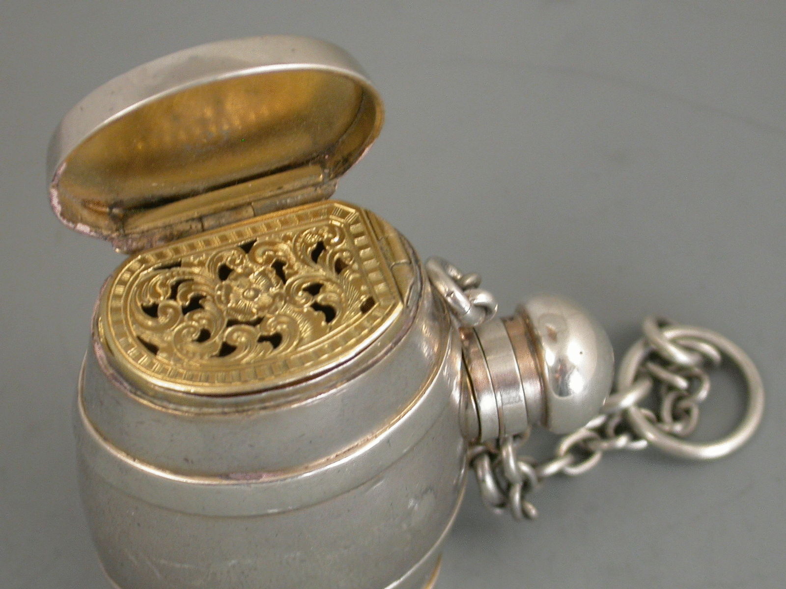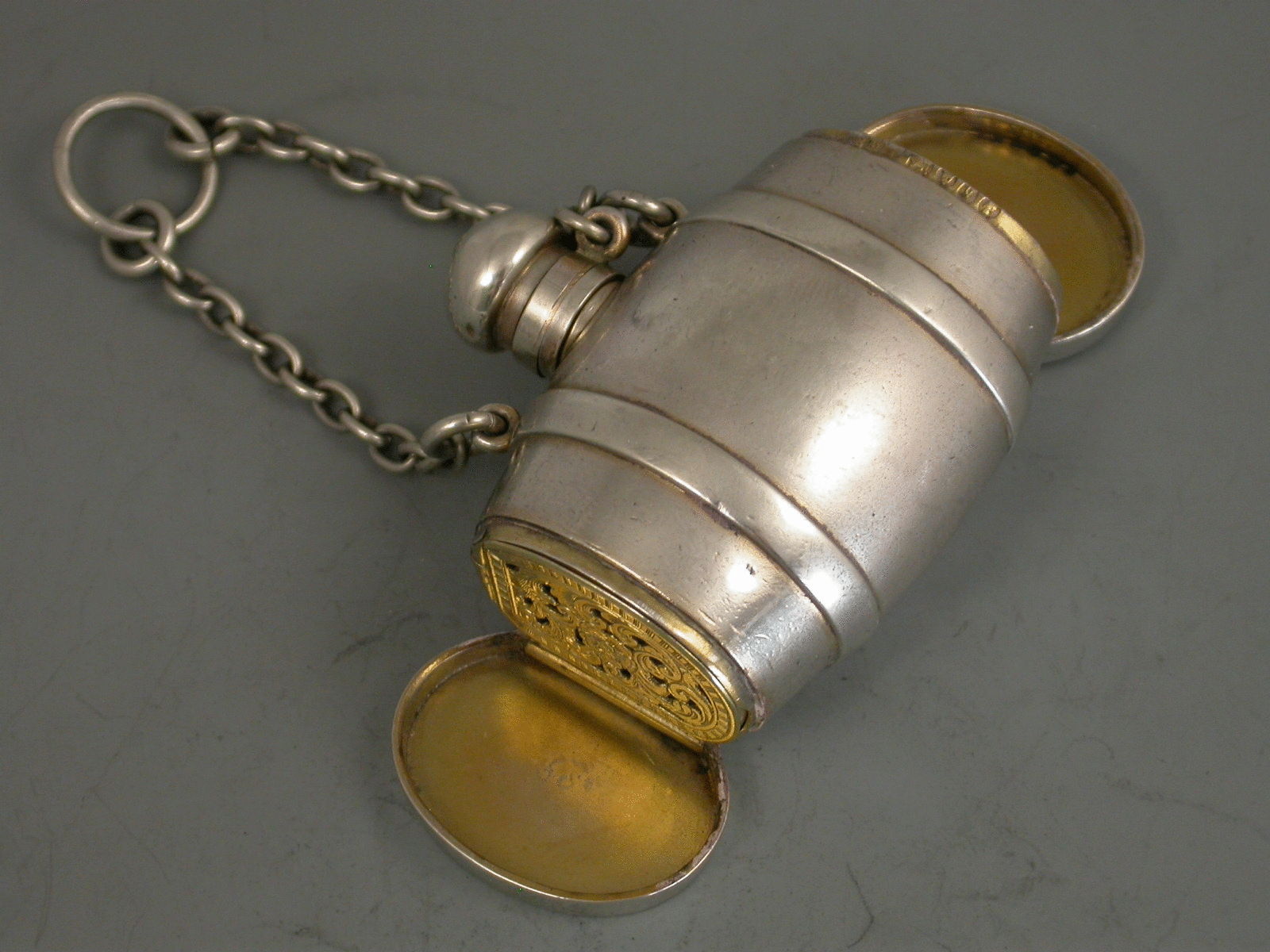 A rare Victorian novelty silver combination Scent Bottle / Vinaigrette / Pill Box, made in the form of a Costrel with screw off cap and suspensory chains, a hinged lid to either end revealing the gilt interiors.