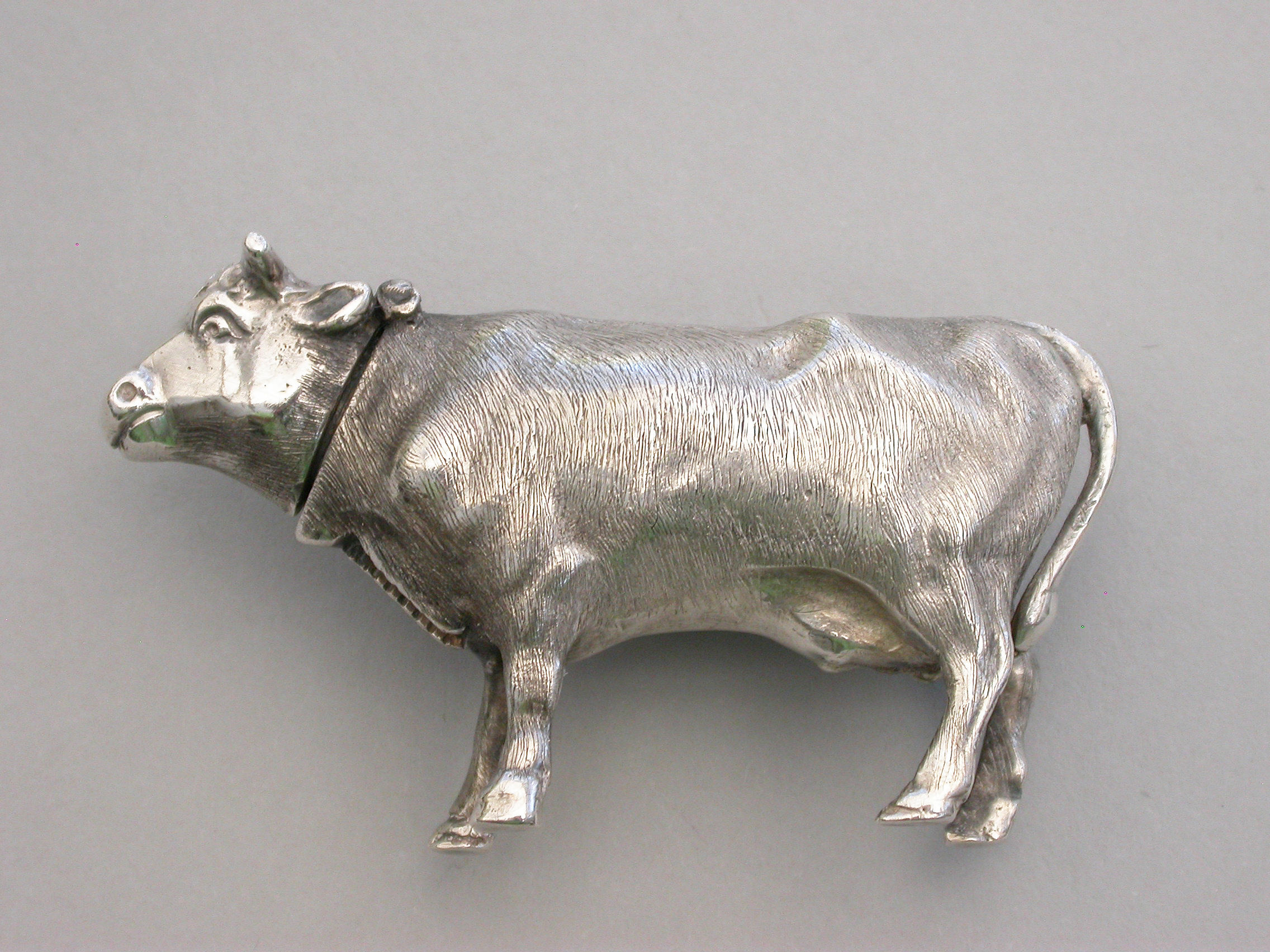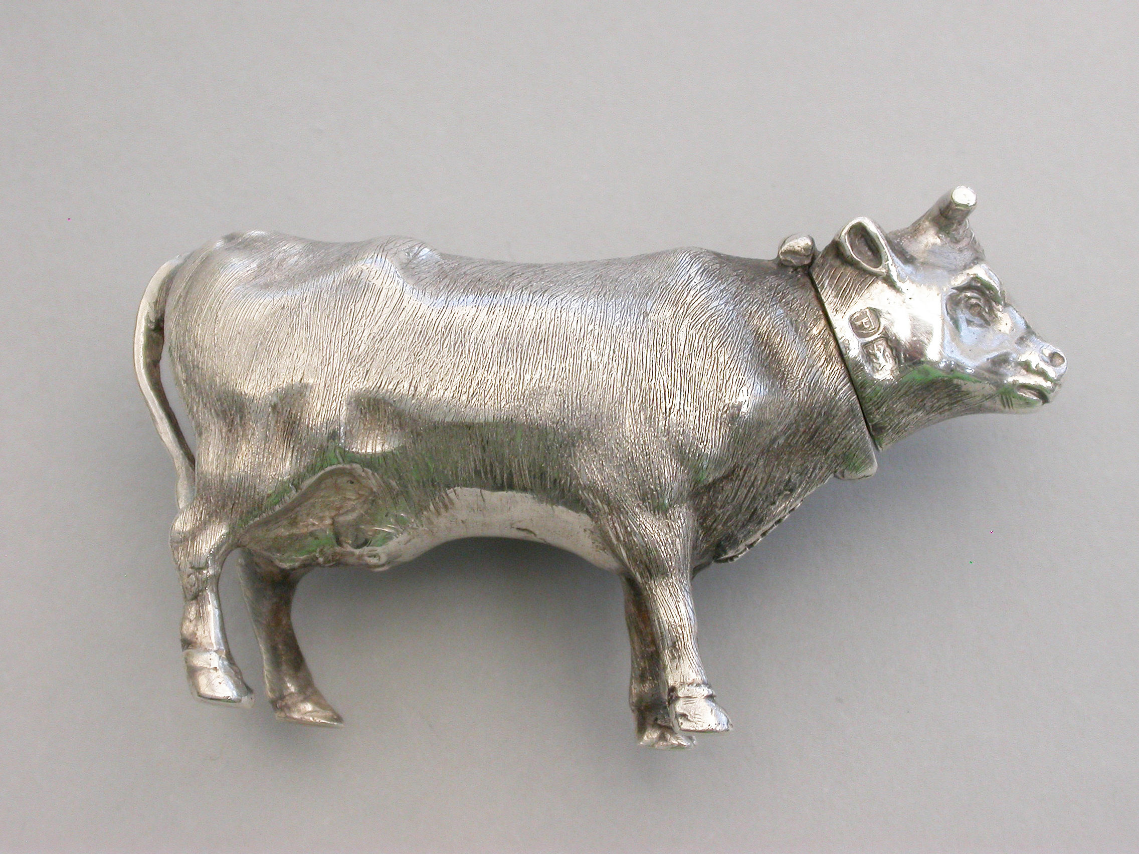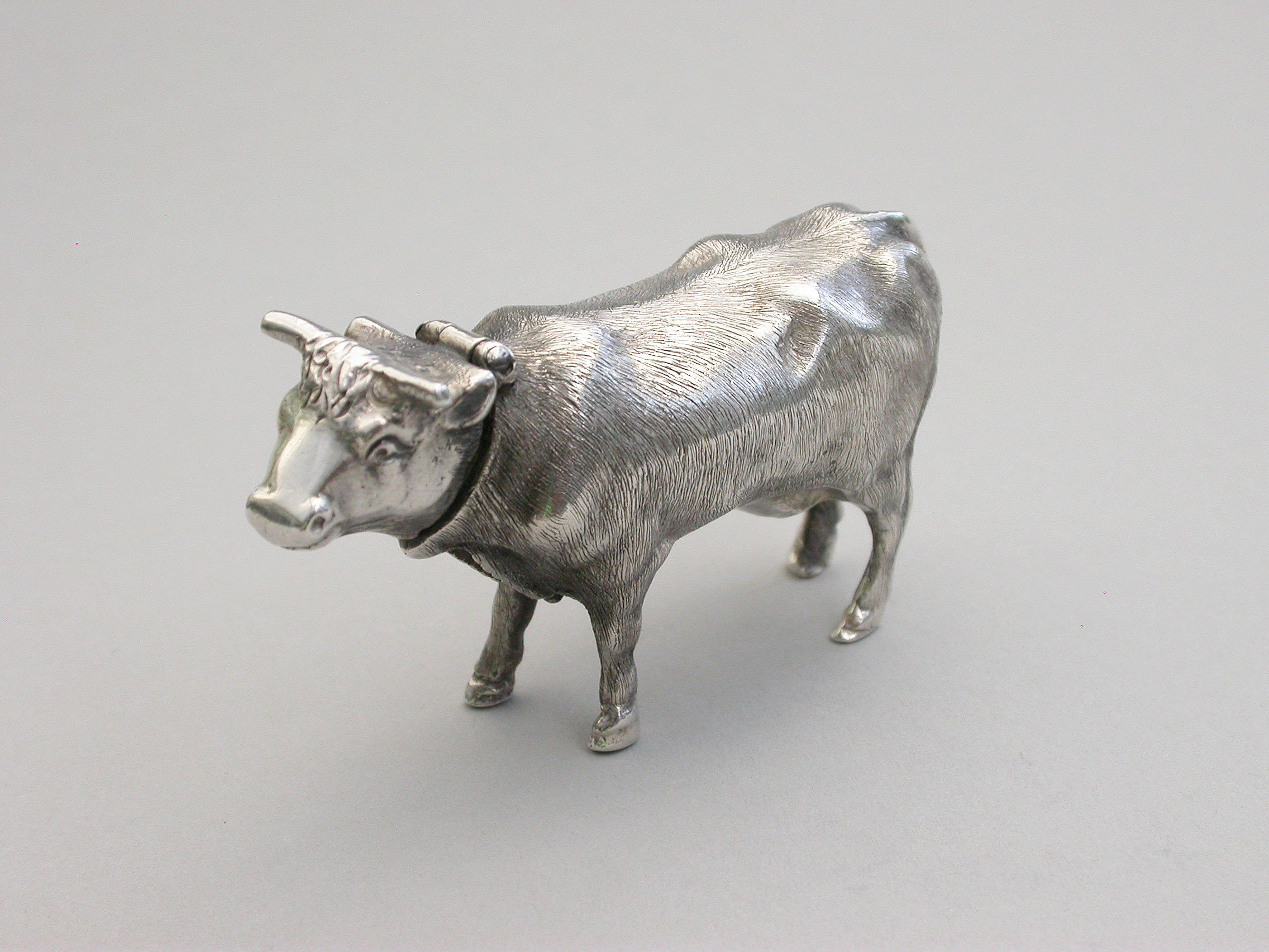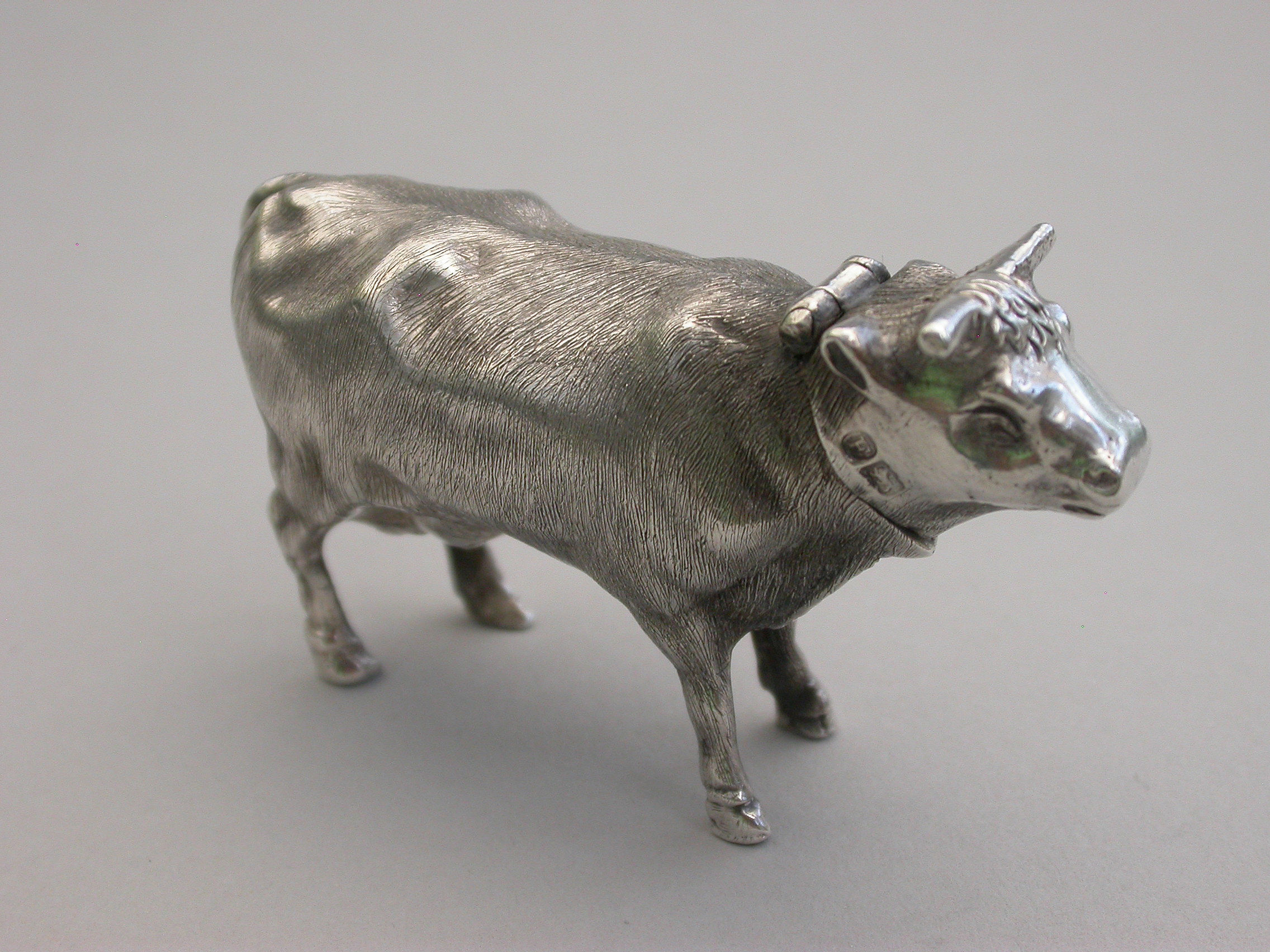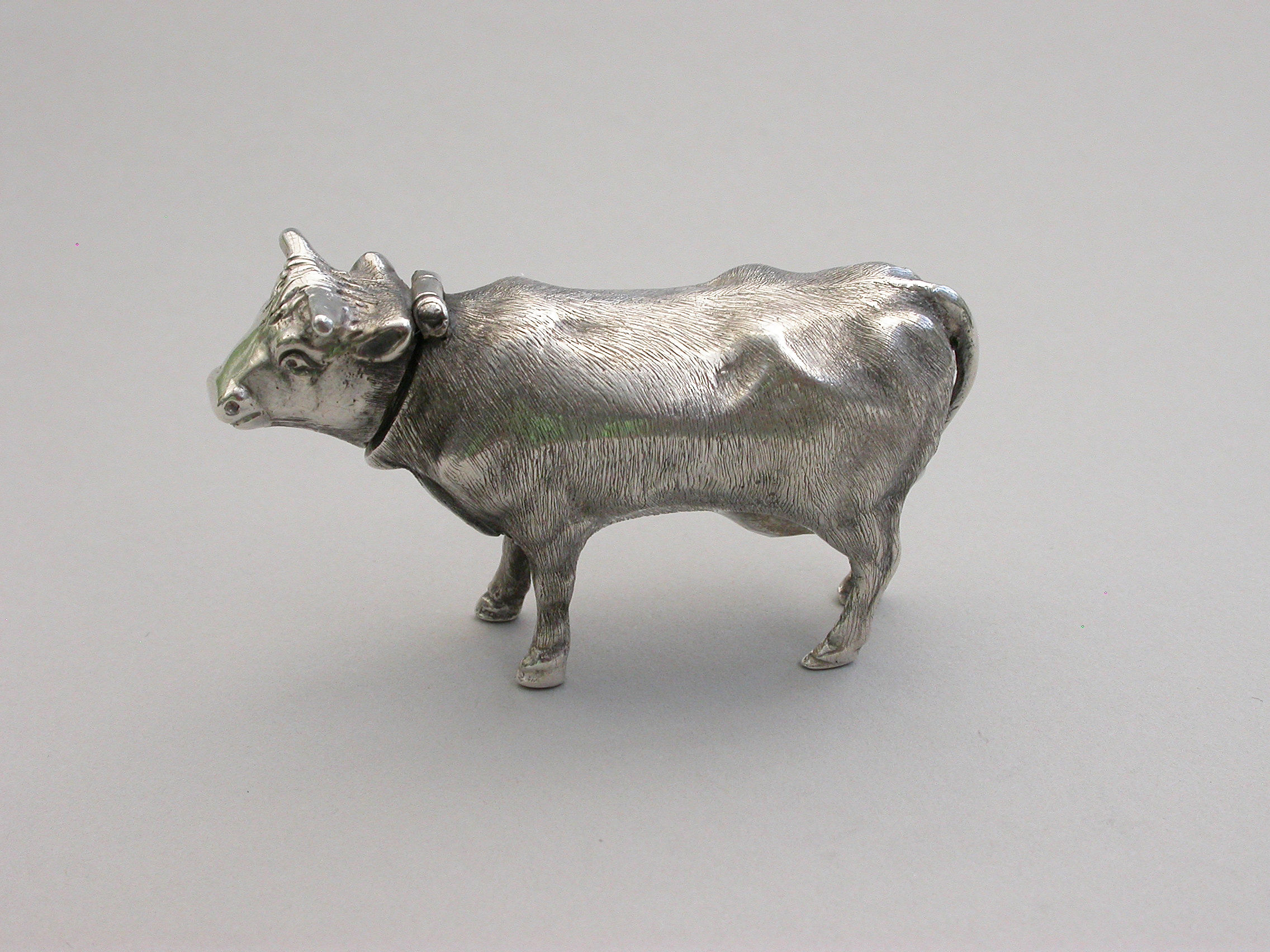 A rare Victorian novelty silver Vesta Case made in the form of a standing Cow, with hinged lid and striker to chest.