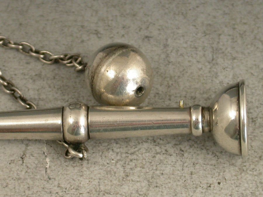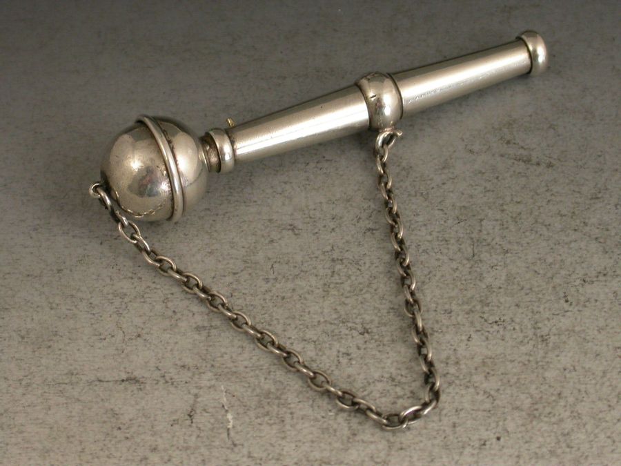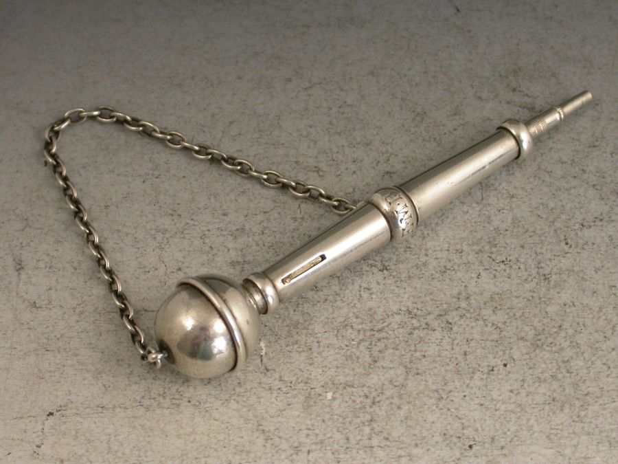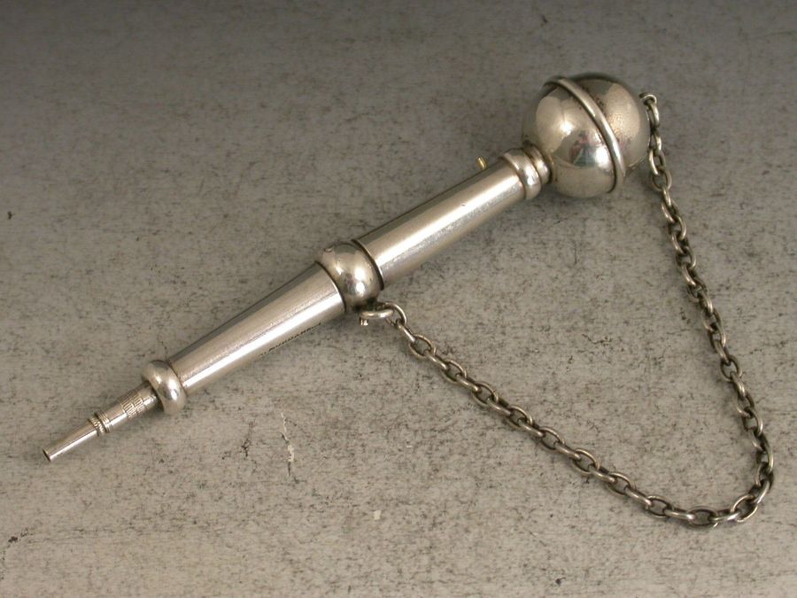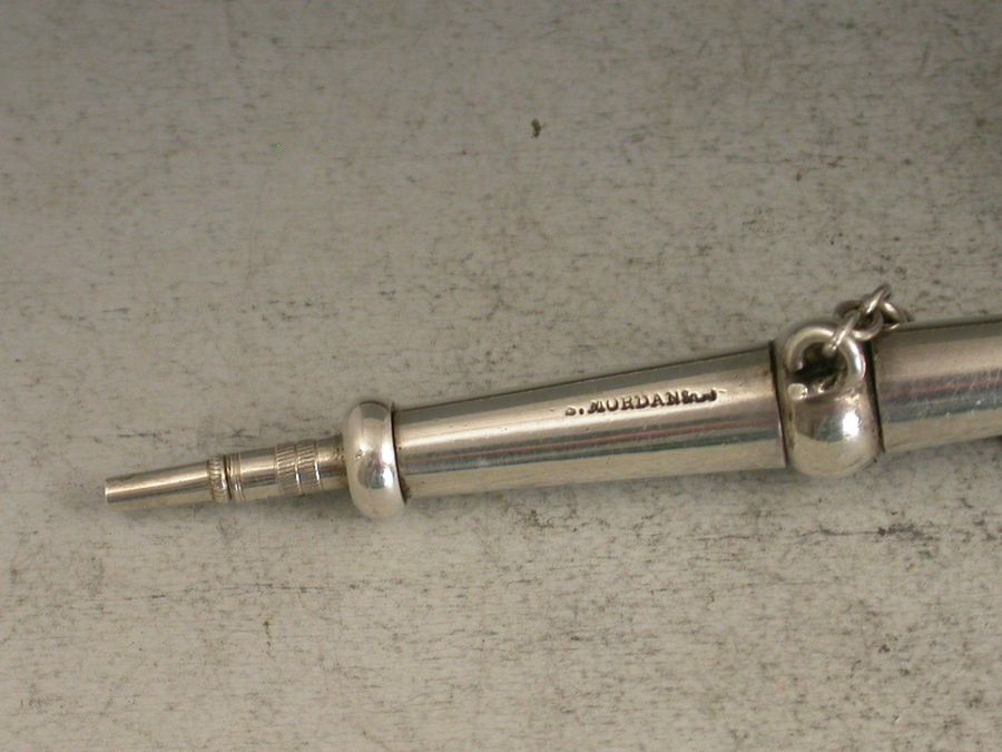 An extremely rare Victorian novelty silver Propelling Pencil incorporating a ""Cup & Ball"" game. The pencil extending via a twist mechanism. The ball is locked in position by a screw thread which can be slid out of the way to play the game. The ball is also attached to the pencil via a link chain. The body engraved with contemporary initials EMB.
