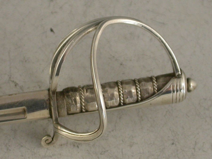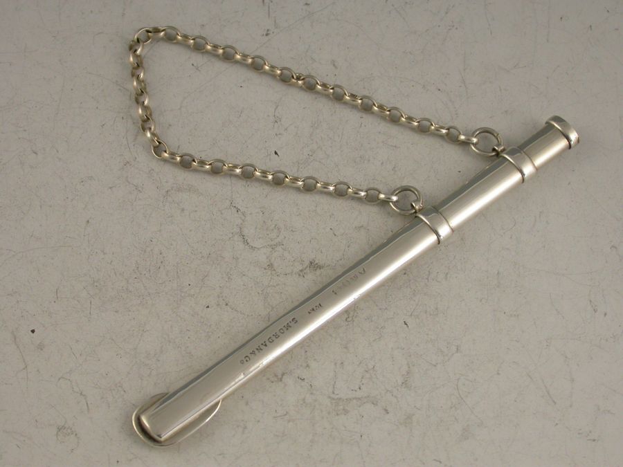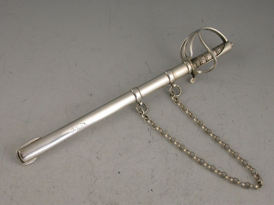 A rare Victorian novelty silver Letter Opener, made in the form of an Officers Dress Sword, complete with scabbard and suspension chain.