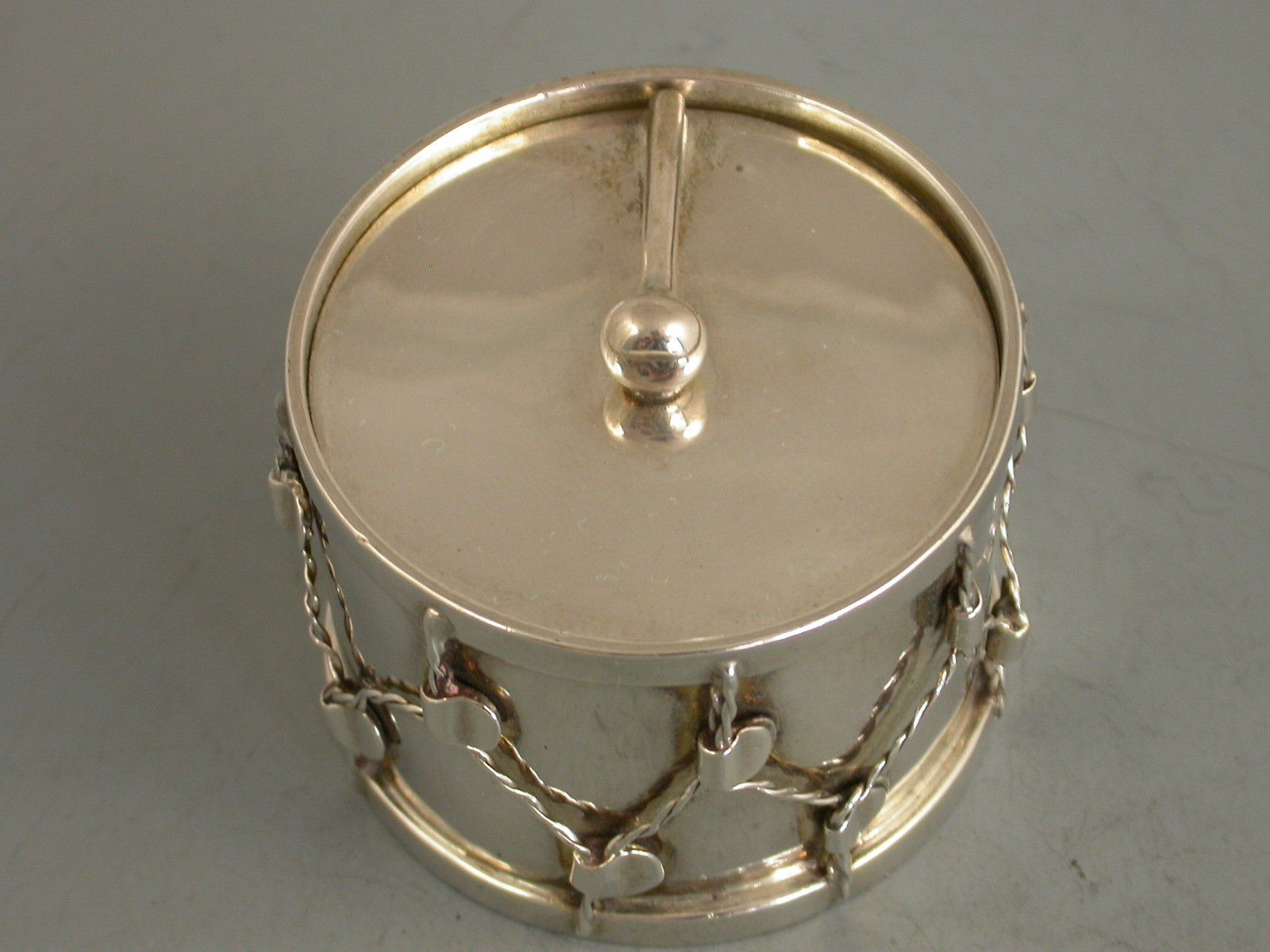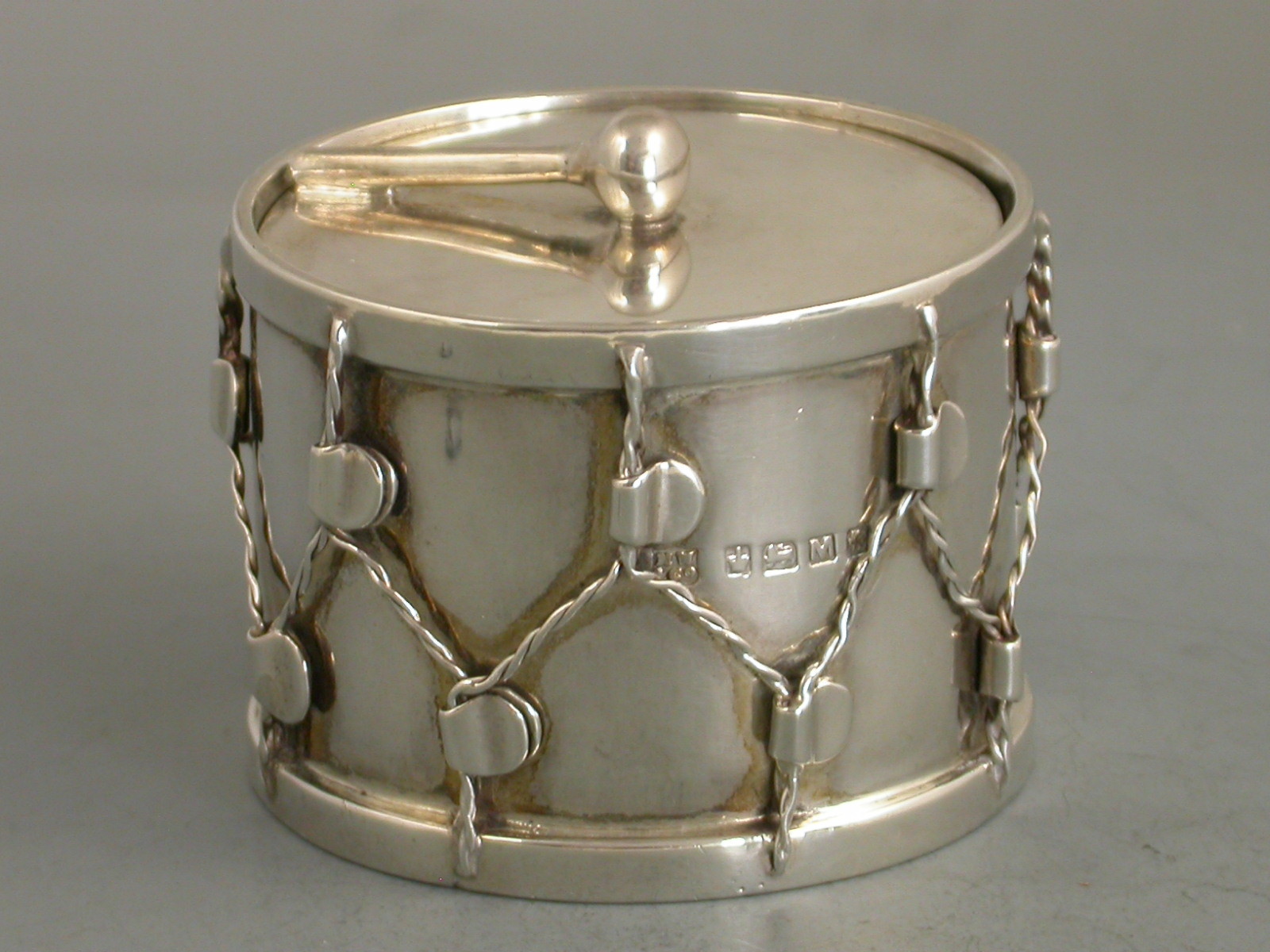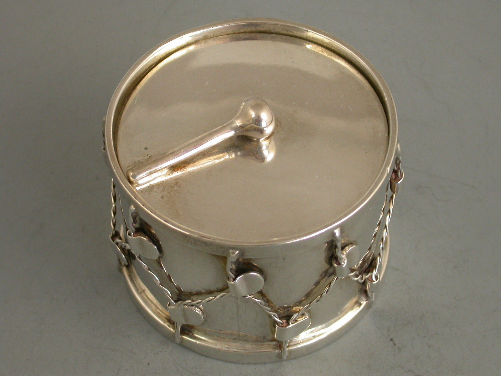 An unusual Victorian novelty silver Box & Cover, made in the form of a military drum, the drum beater forming the handle to the cover, silver gilt interior.