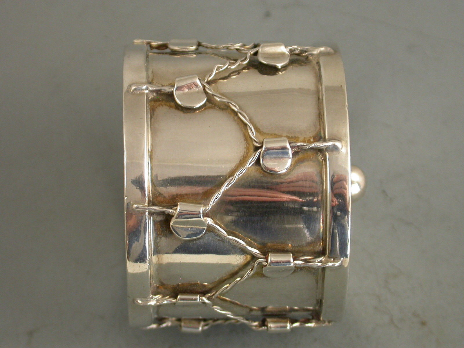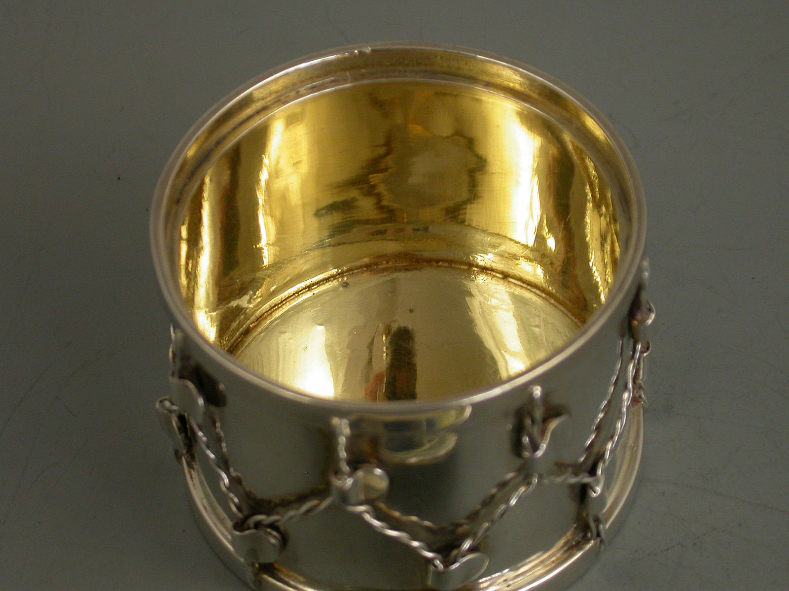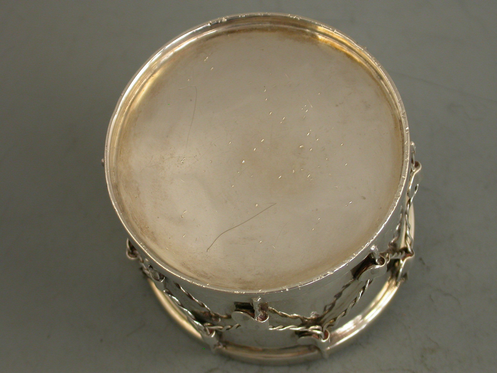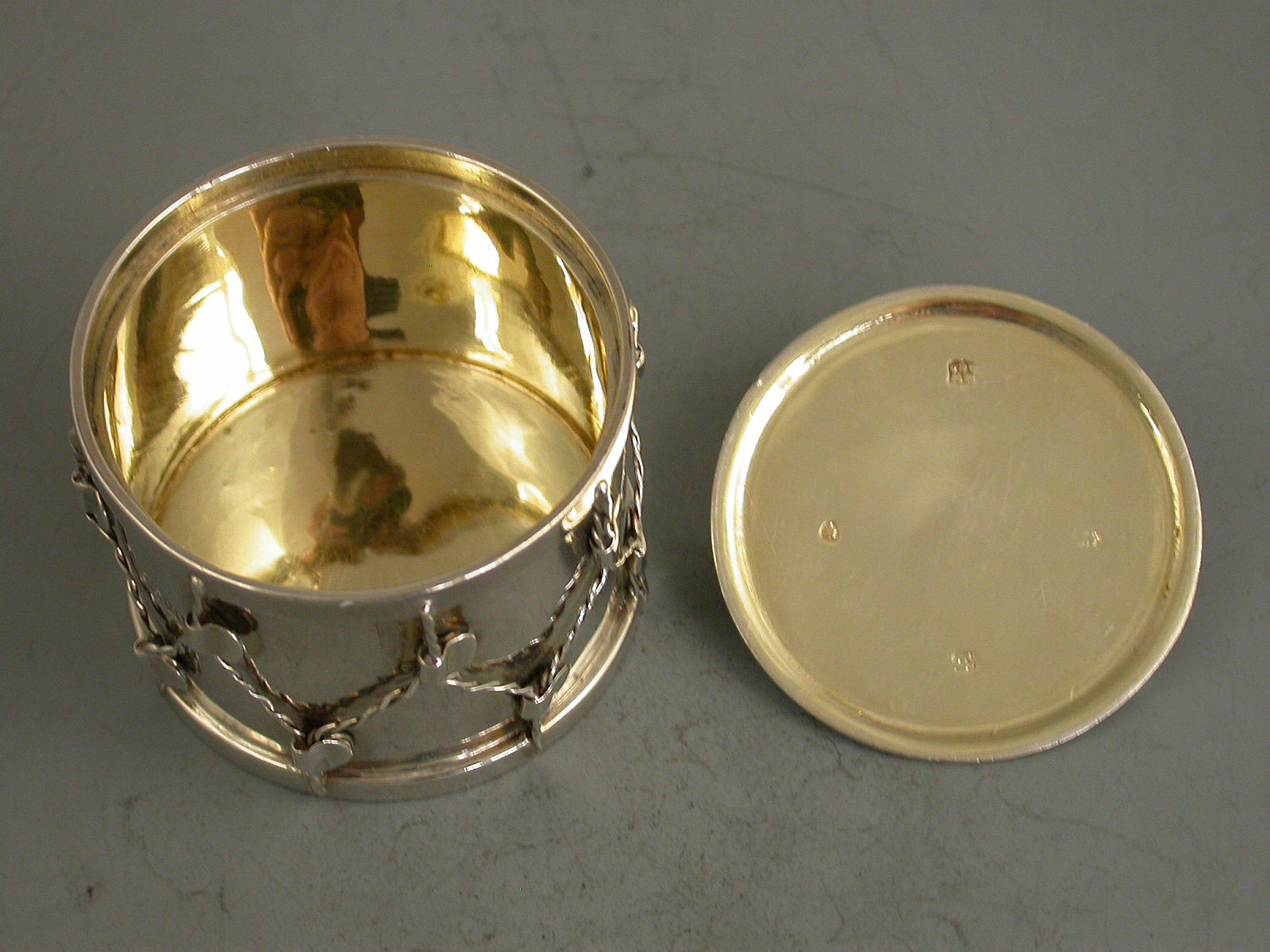 An unusual Victorian novelty silver Box & Cover, made in the form of a military drum, the drum beater forming the handle to the cover, silver gilt interior.