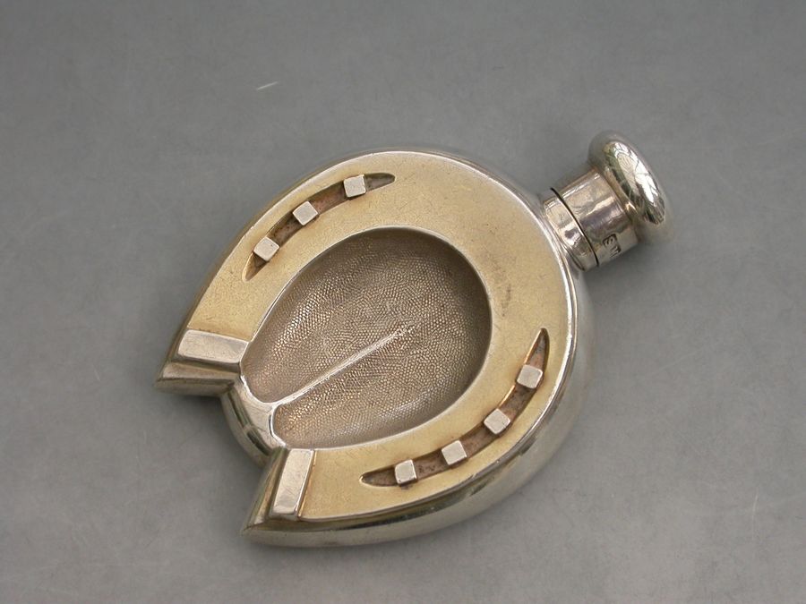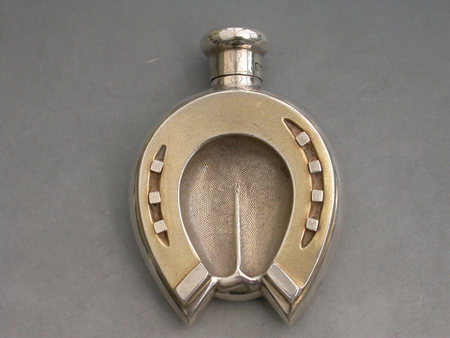 A fine quality Victorian novelty silver, enamel and parcel gilt Scent Bottle of horseshoe shape. The face with royal blue enamel outline and a central panel painted with a hunting scene. The reverse with parcel gilt decoration on a matt background and studded with seven (lucky) nails (repeated on the front in enamel). Screw off lid and silver gilt collar.