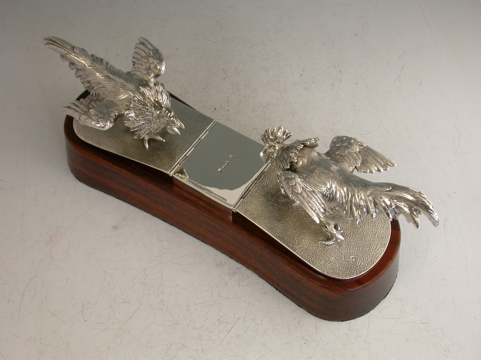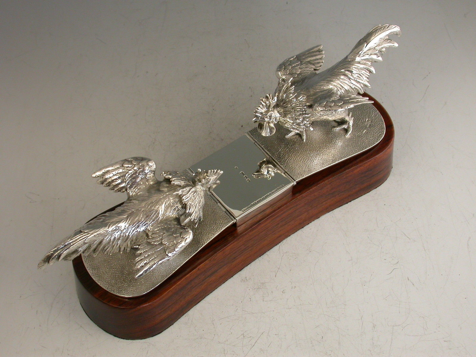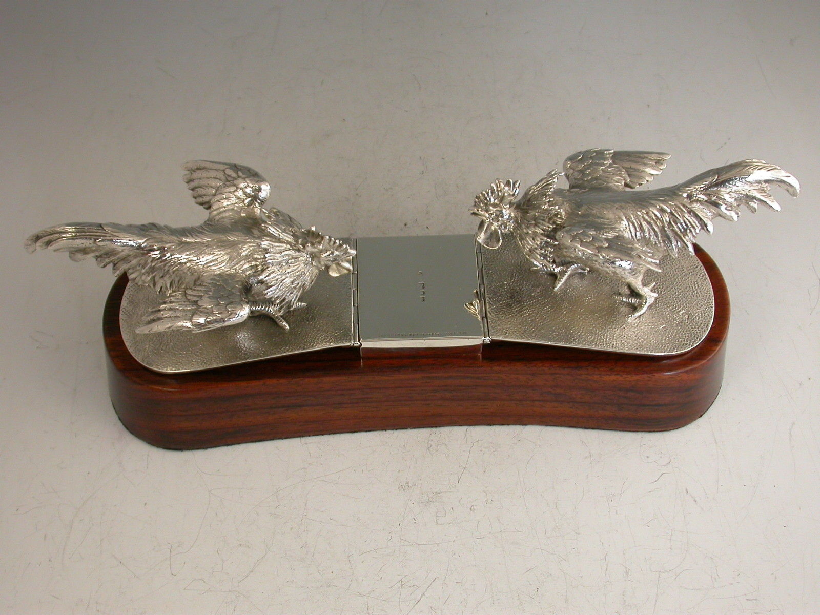 A fine Victorian Novelty Silver Double Letter Clip / Desk Tidy, made in the form of two cast silver Cockerels or Fighting Cocks facing each other and standing on flat hinged clips and set on a shaped rosewood base.