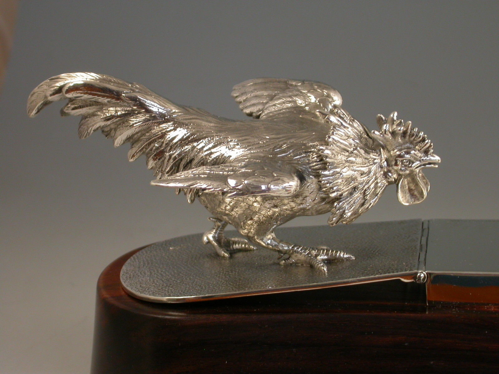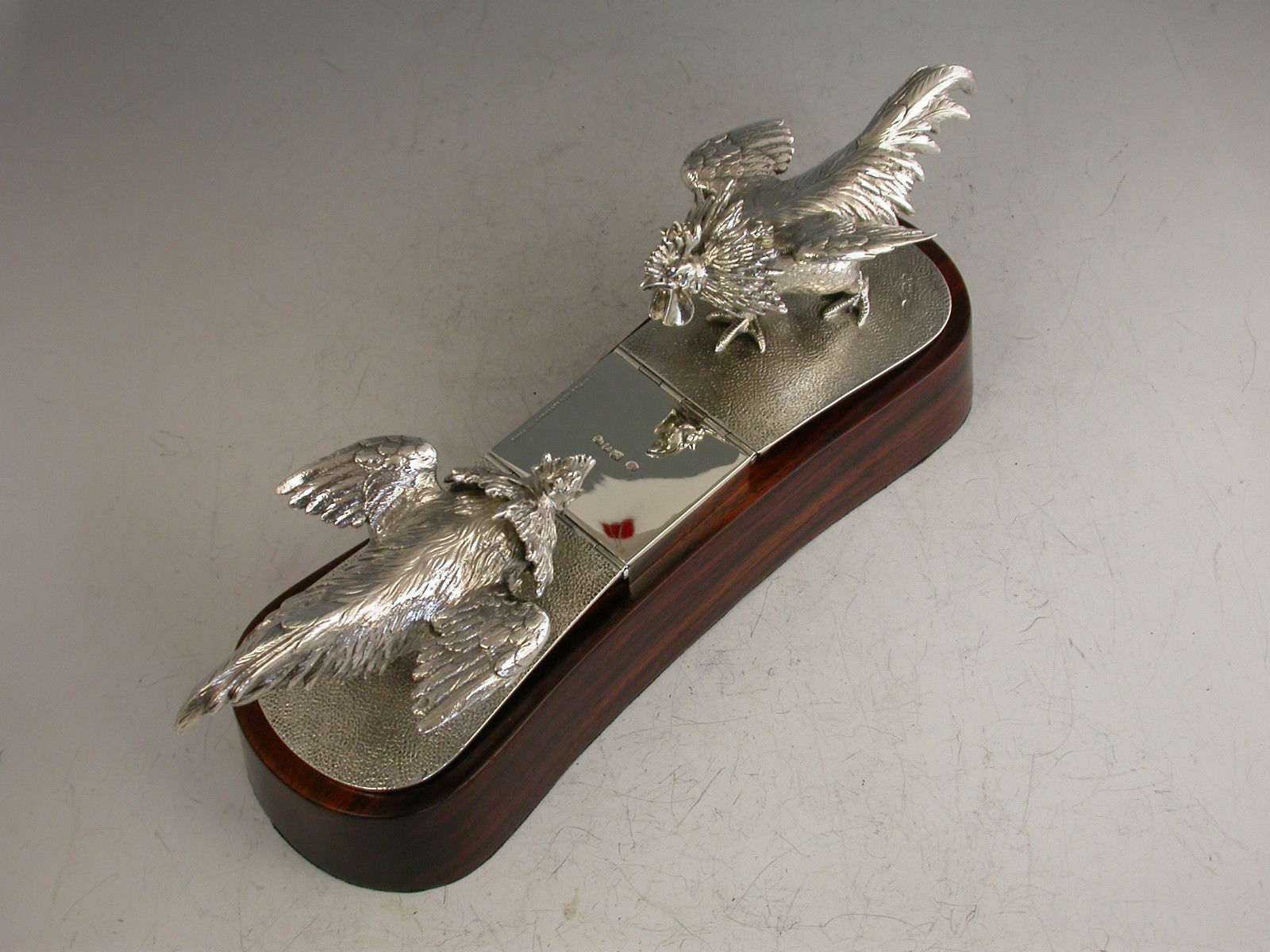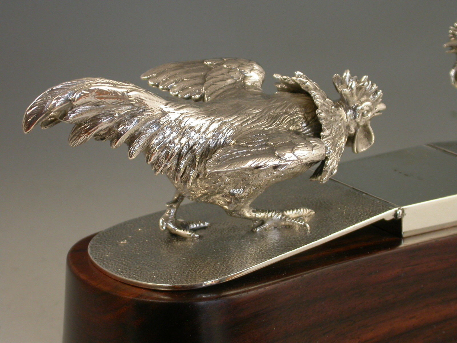 A fine Victorian Novelty Silver Double Letter Clip / Desk Tidy, made in the form of two cast silver Cockerels or Fighting Cocks facing each other and standing on flat hinged clips and set on a shaped rosewood base.