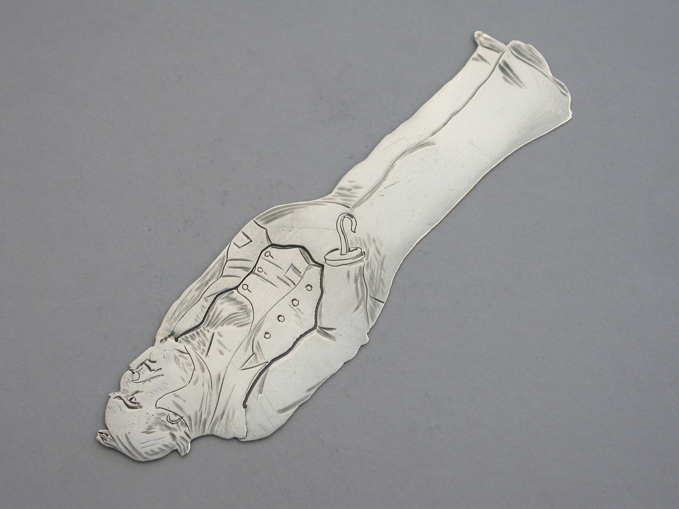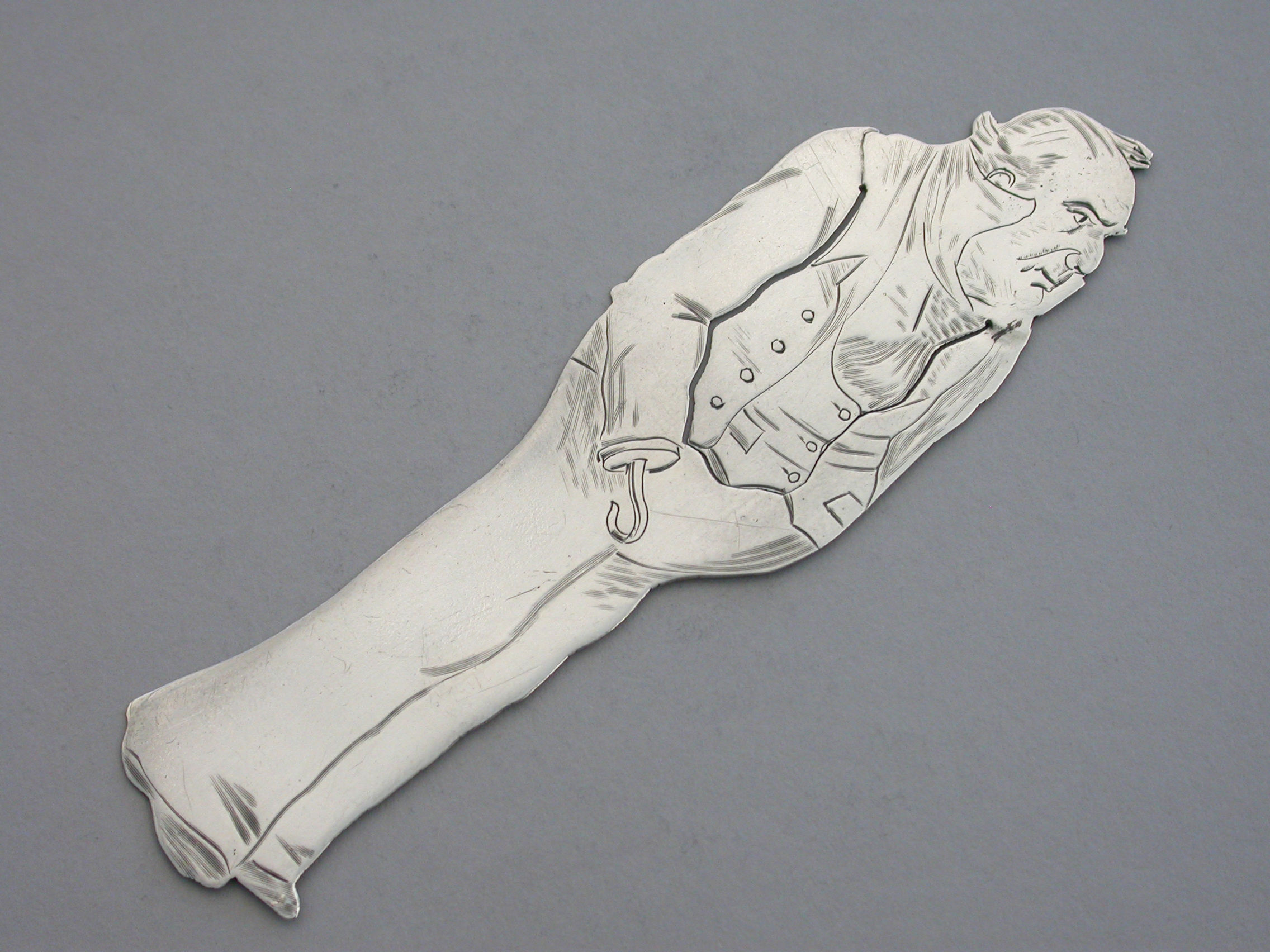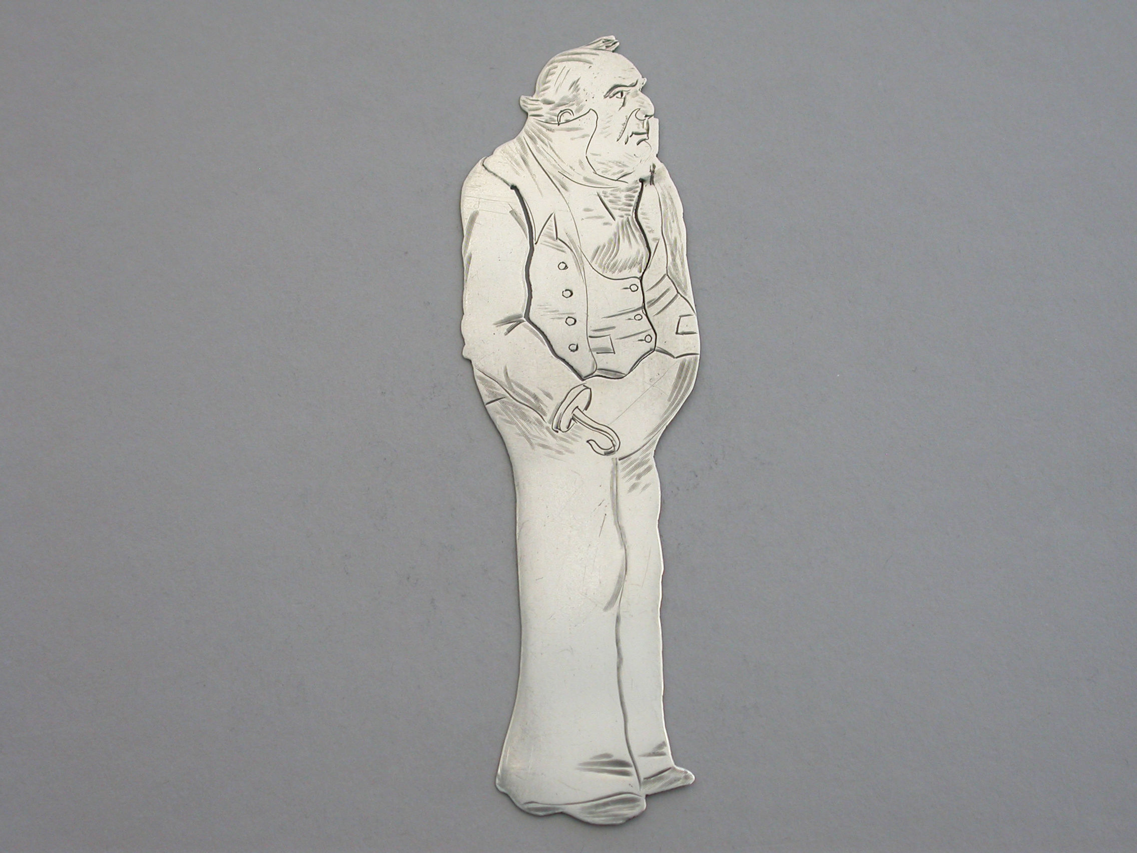 A rare Victorian novelty silver figural Bookmark depicting the character of Captain Cuttle from Charles Dickens's novel 'Domby & Son', of flat cut-out form with engraved decoration depicting the Captain in his blue coat with a hook instead of his right hand. Engraved to the reverse with his famous quote - ""When Found Make a Note Of't"".