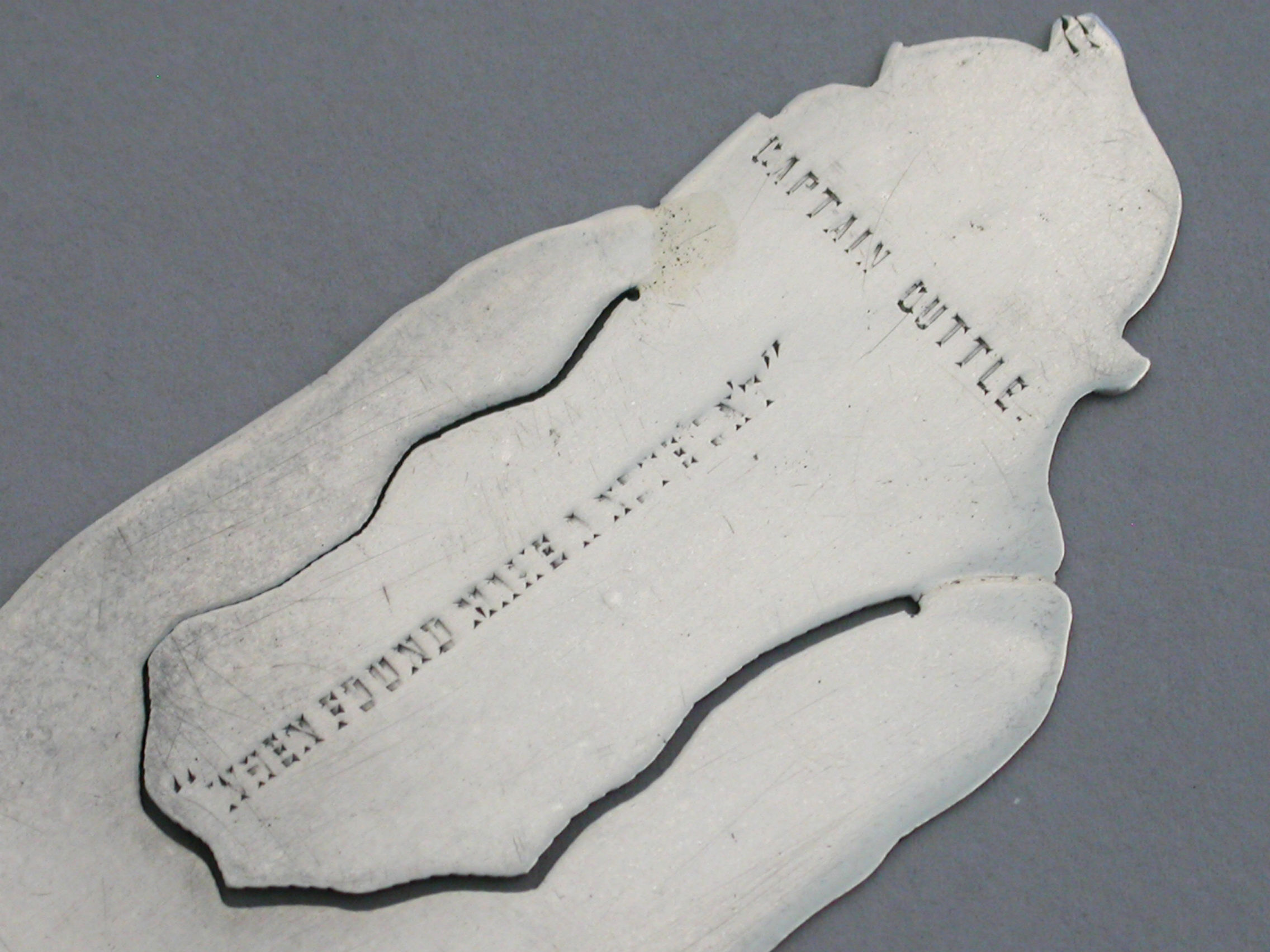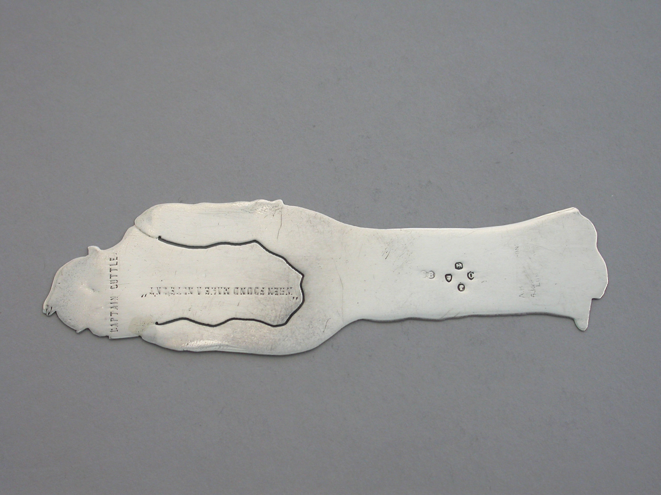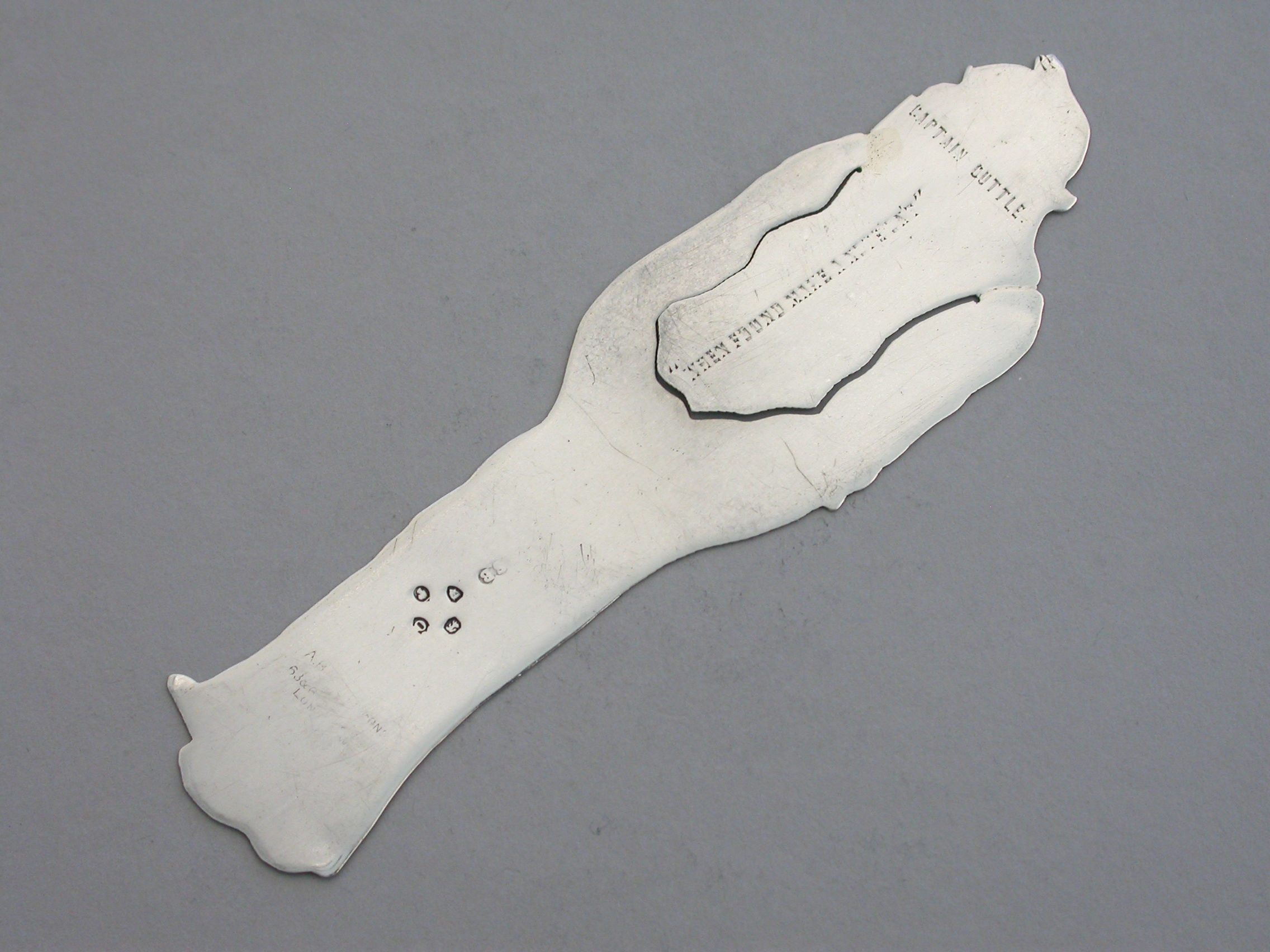 A rare Victorian novelty silver figural Bookmark depicting the character of Captain Cuttle from Charles Dickens's novel 'Domby & Son', of flat cut-out form with engraved decoration depicting the Captain in his blue coat with a hook instead of his right hand. Engraved to the reverse with his famous quote - ""When Found Make a Note Of't"".