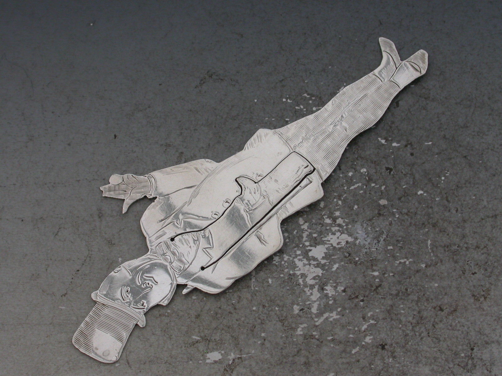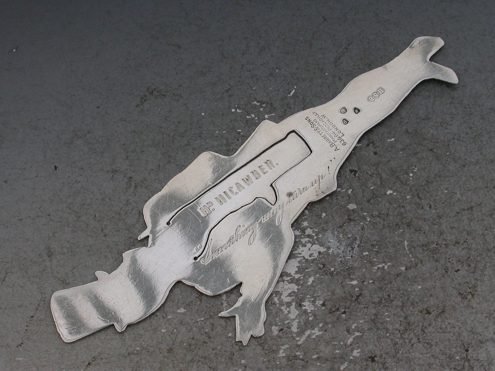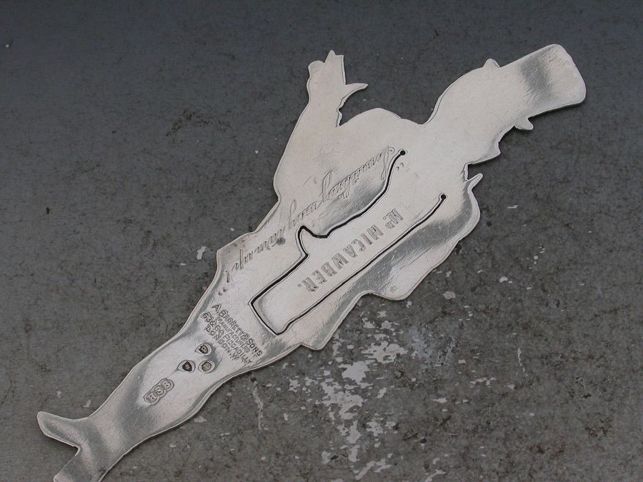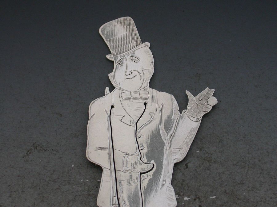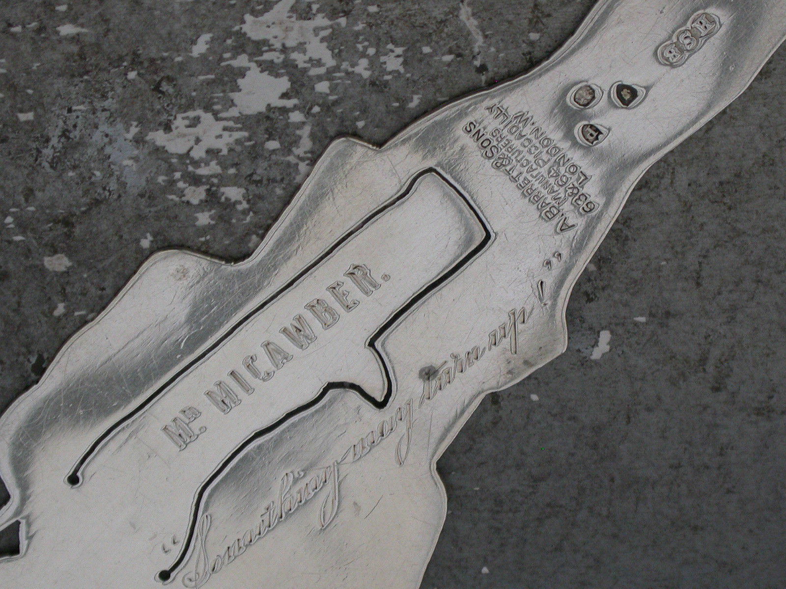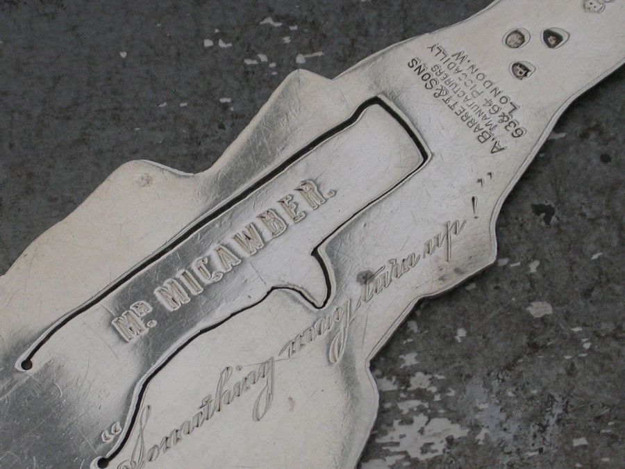 A rare Victorian novelty silver figural Bookmark depicting the character Mr Micawber from Charles Dickens's novel David Copperfield. Of flat cut-out form with engraved decoration depicting the character Wilkins Micawber wearing his top hat and bow tie with his cane under his arm and his monocle in his left hand. Engraved to the reverse with his famous quote - ""Something may turn up!"".