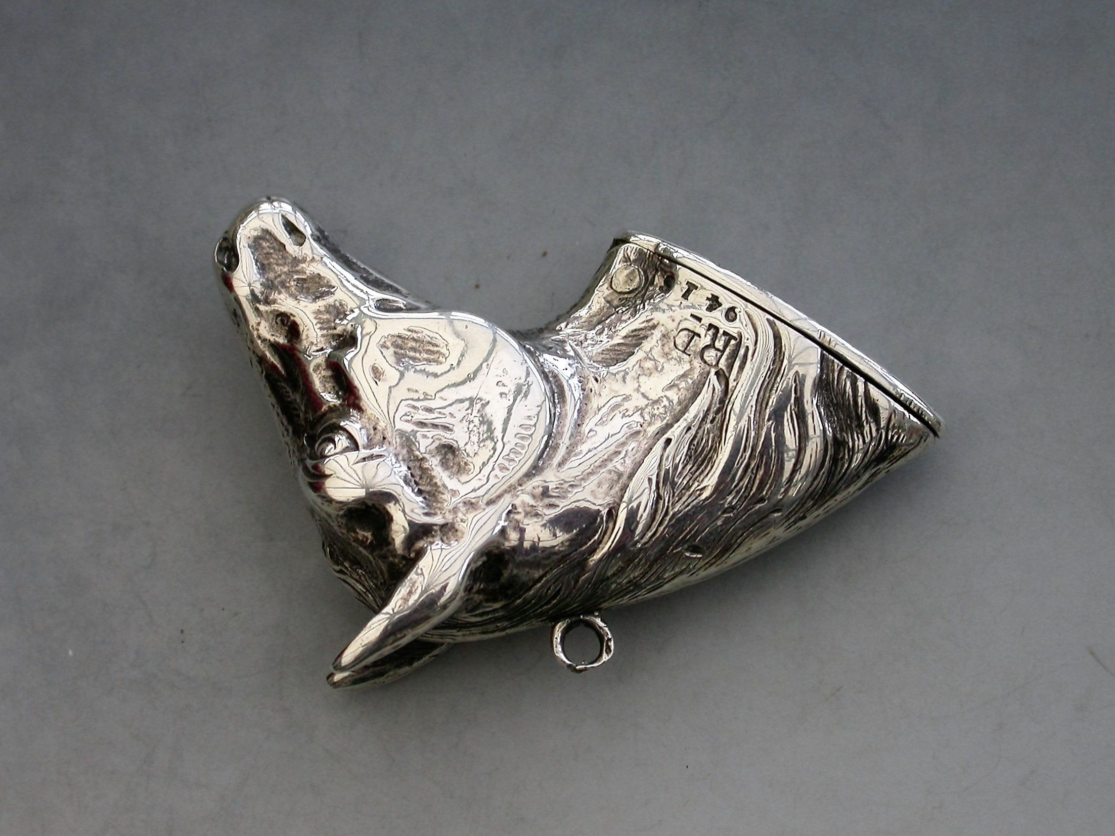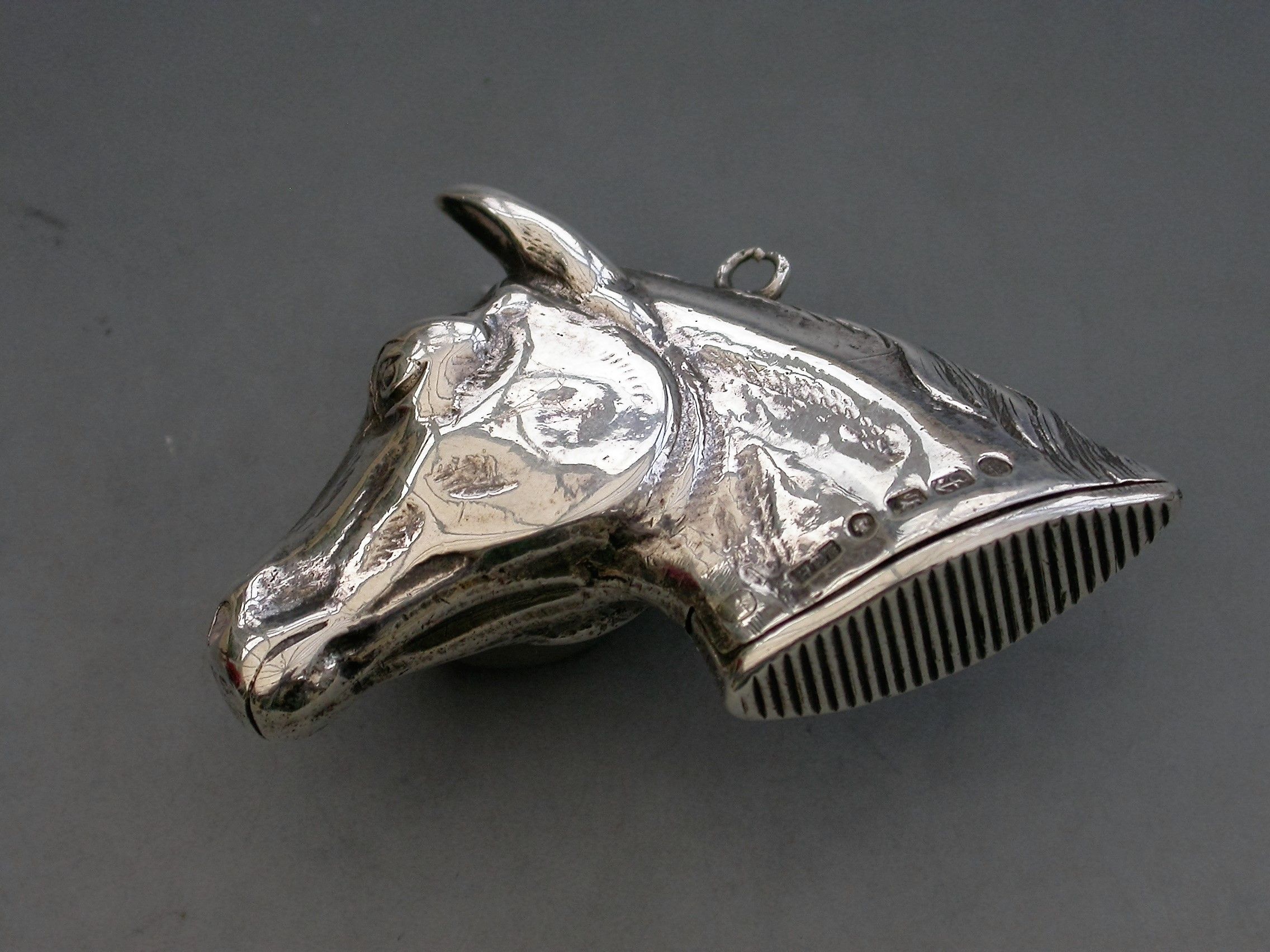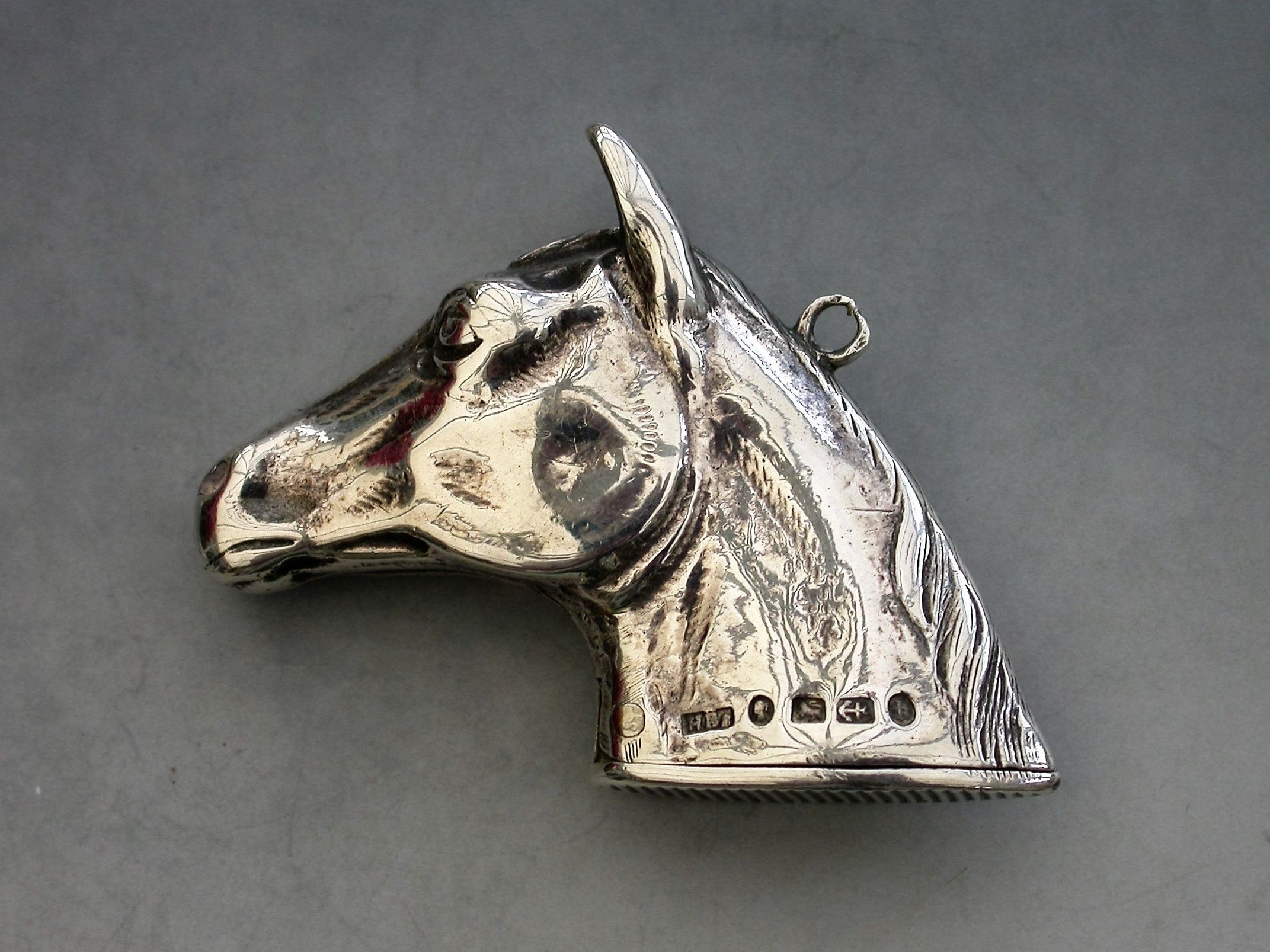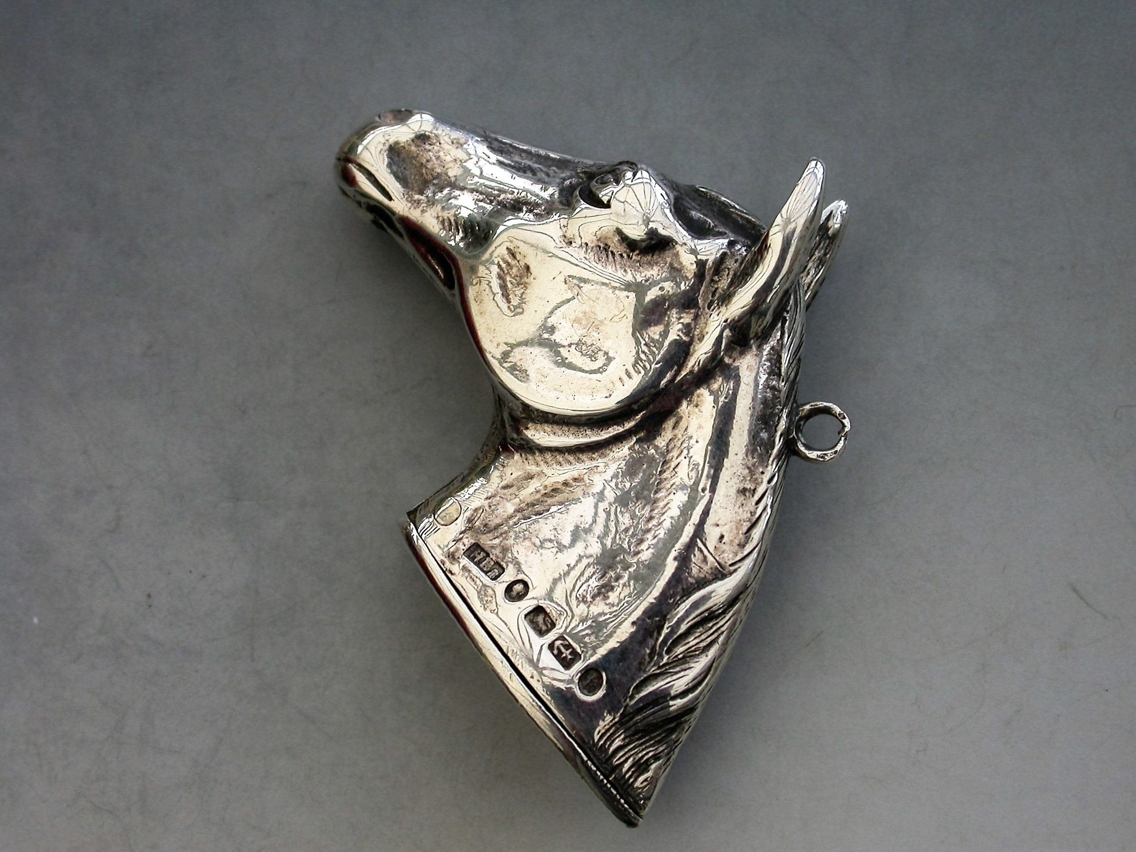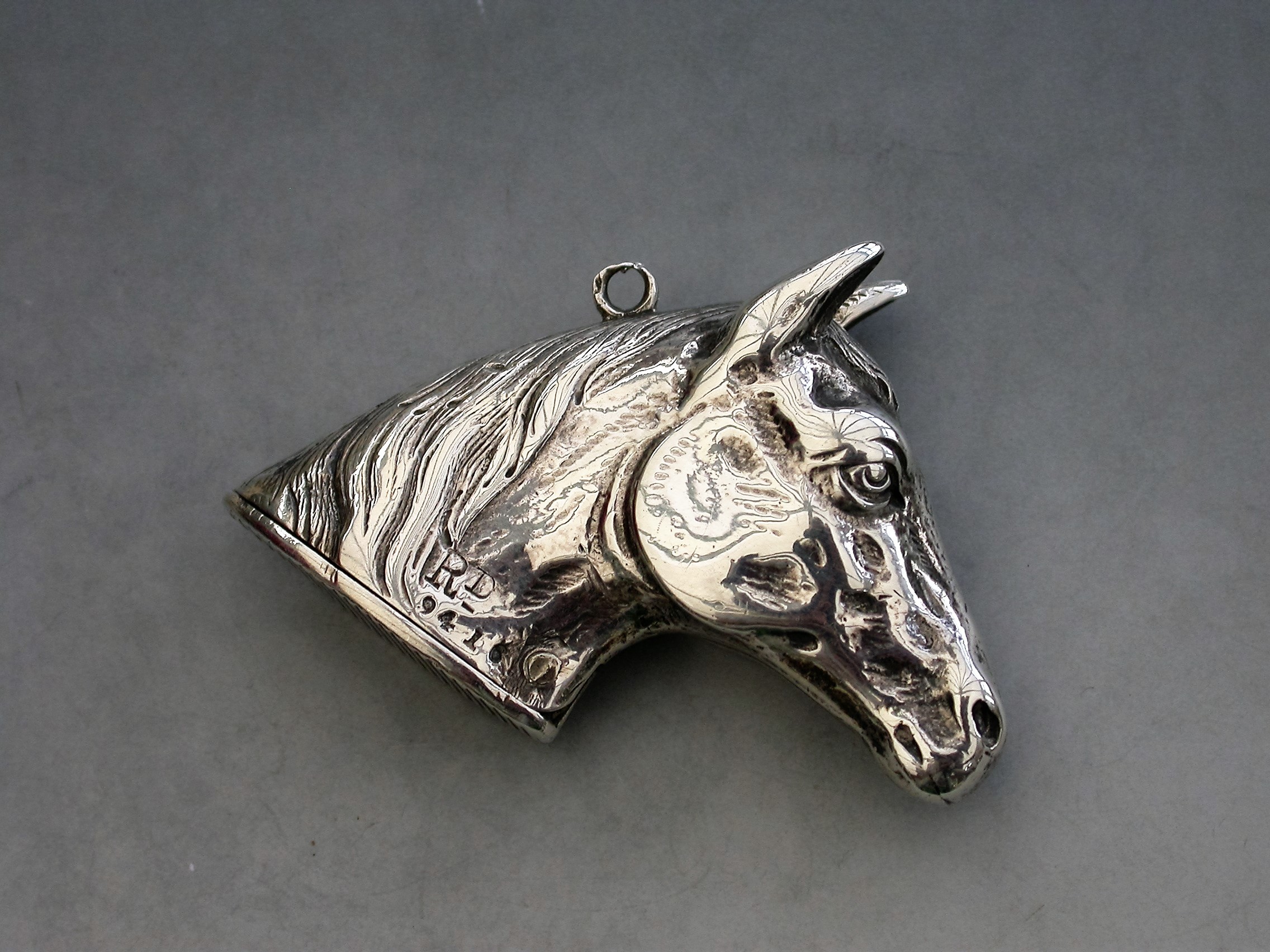 A rare Victorian novelty cast silver Vesta Case made in the form of a Horses Head with hinged lid and striker to the base, attached suspension ring.