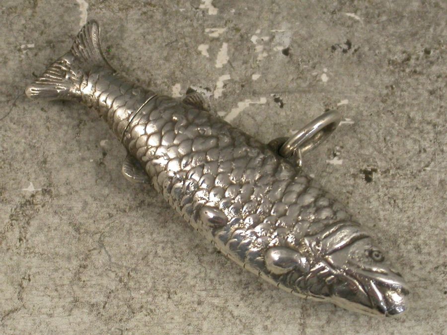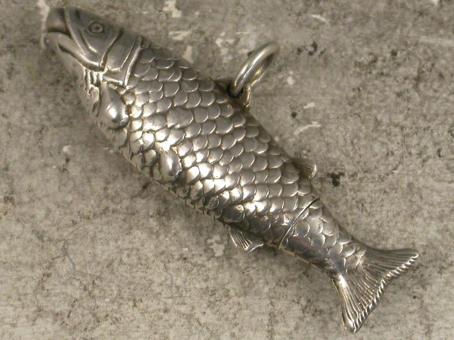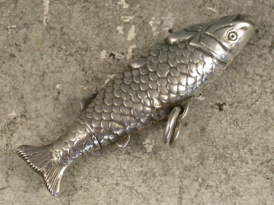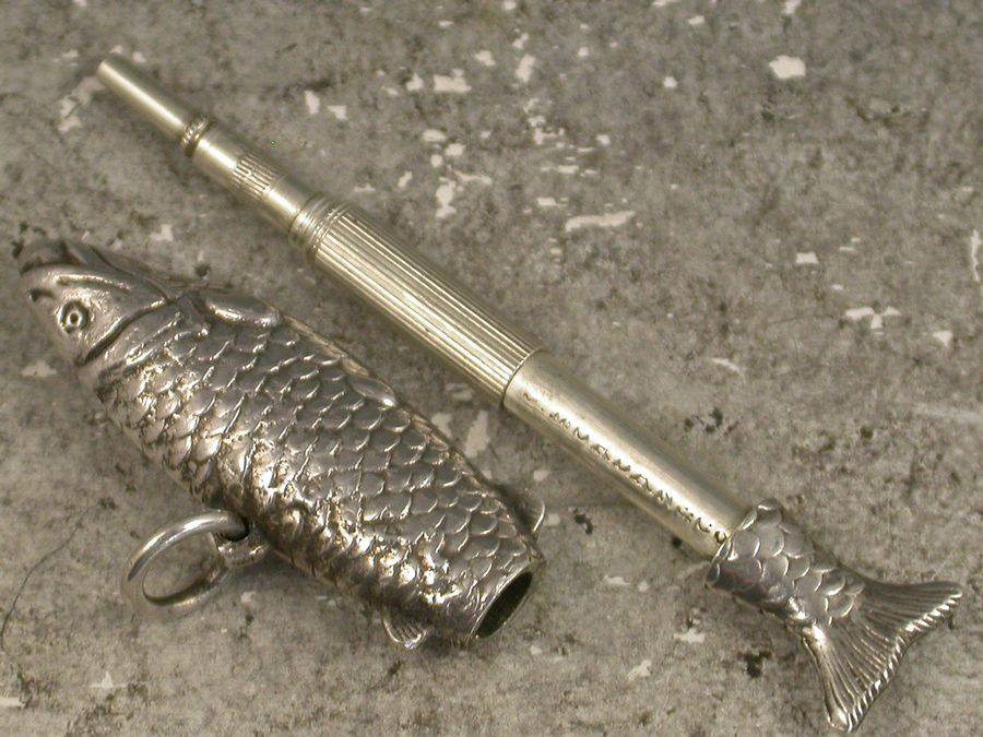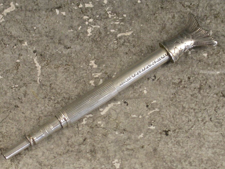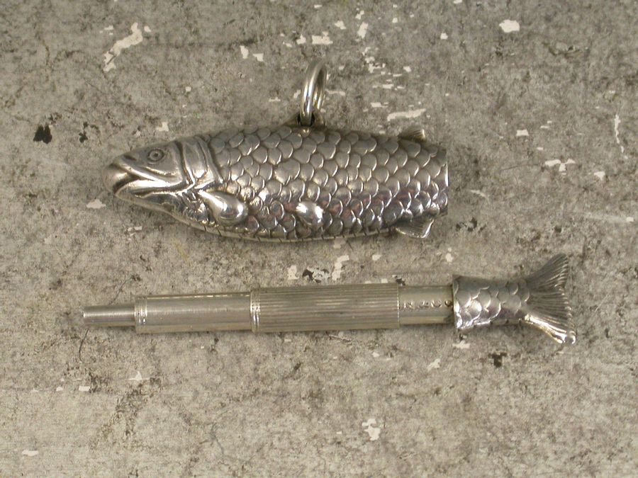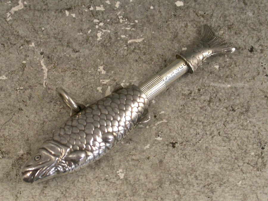A rare Victorian novelty silver Propelling Pencil made in the form of a Salmon, the pencil pulling out from the tail of the fish and automatically extending.