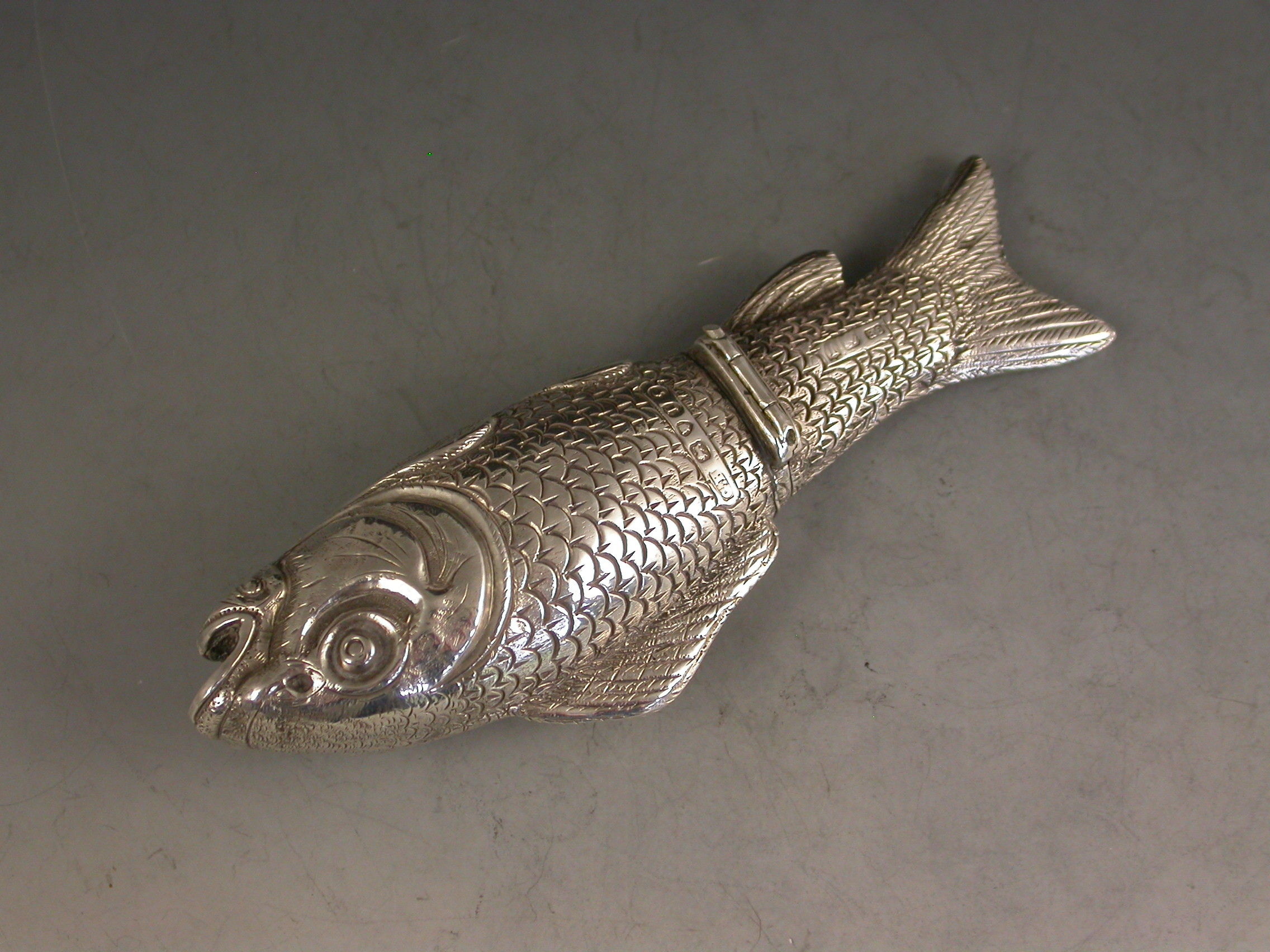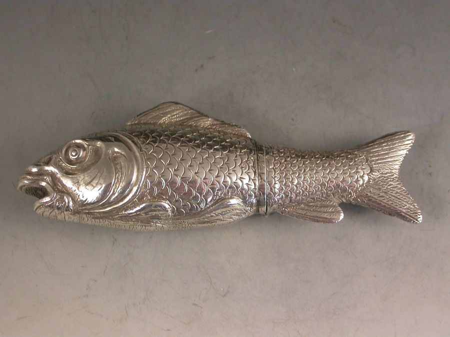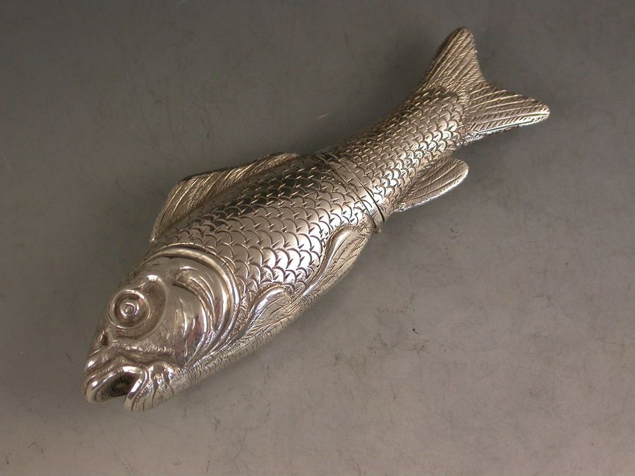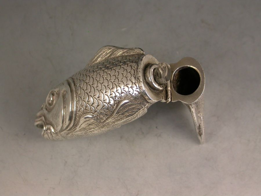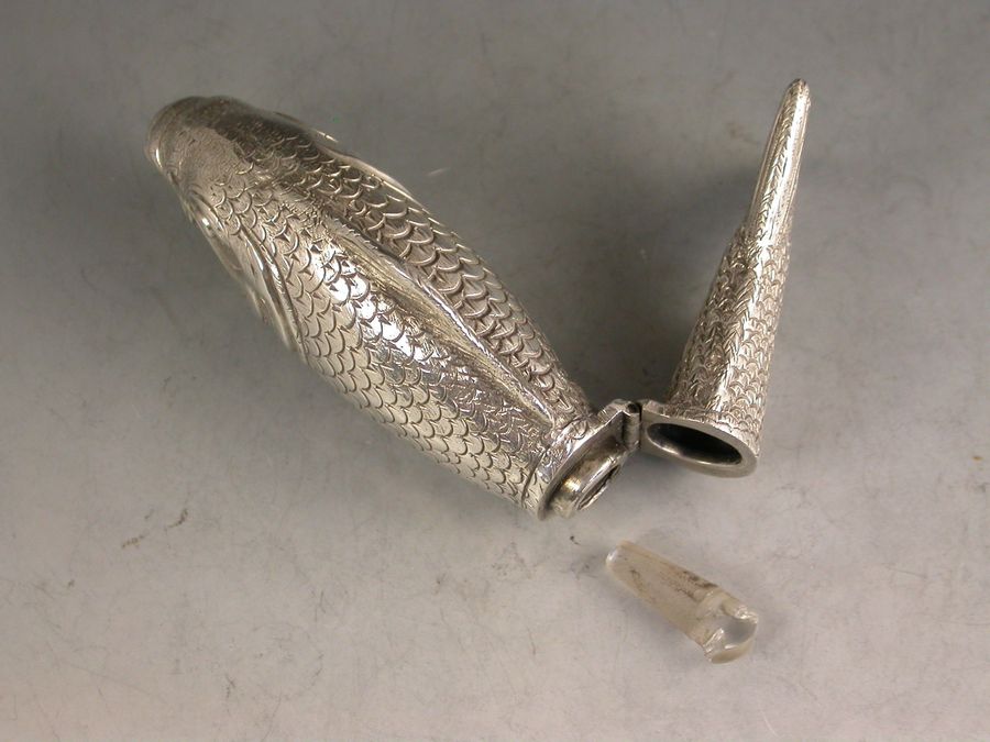 A rare Victorian novelty silver Scent Bottle made in the form of a Fish (probably a Carp), nationalistically engraved detail and scales. Hinged at the centre with silver gilt interior and glass stopper.