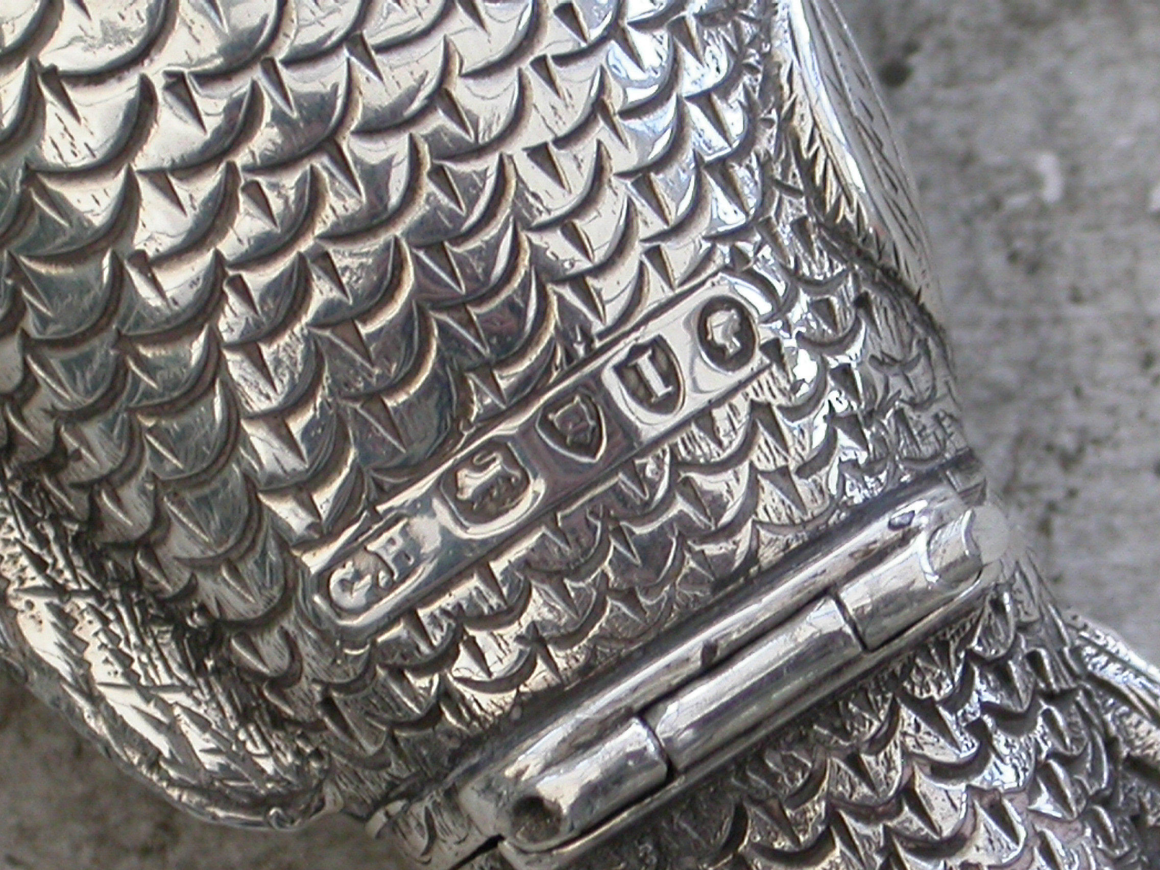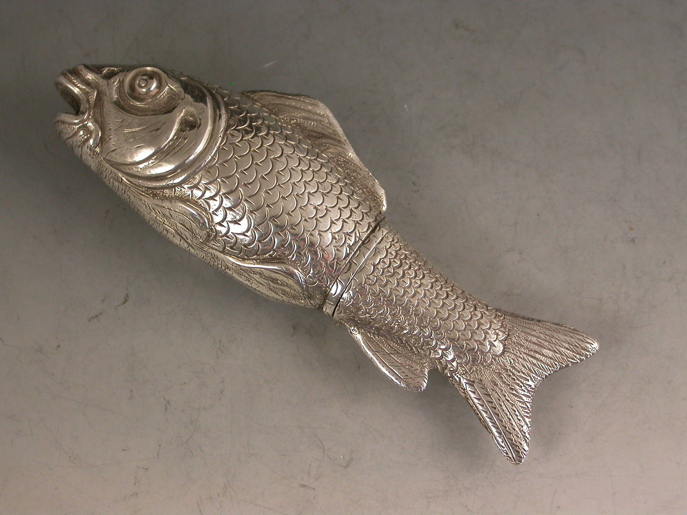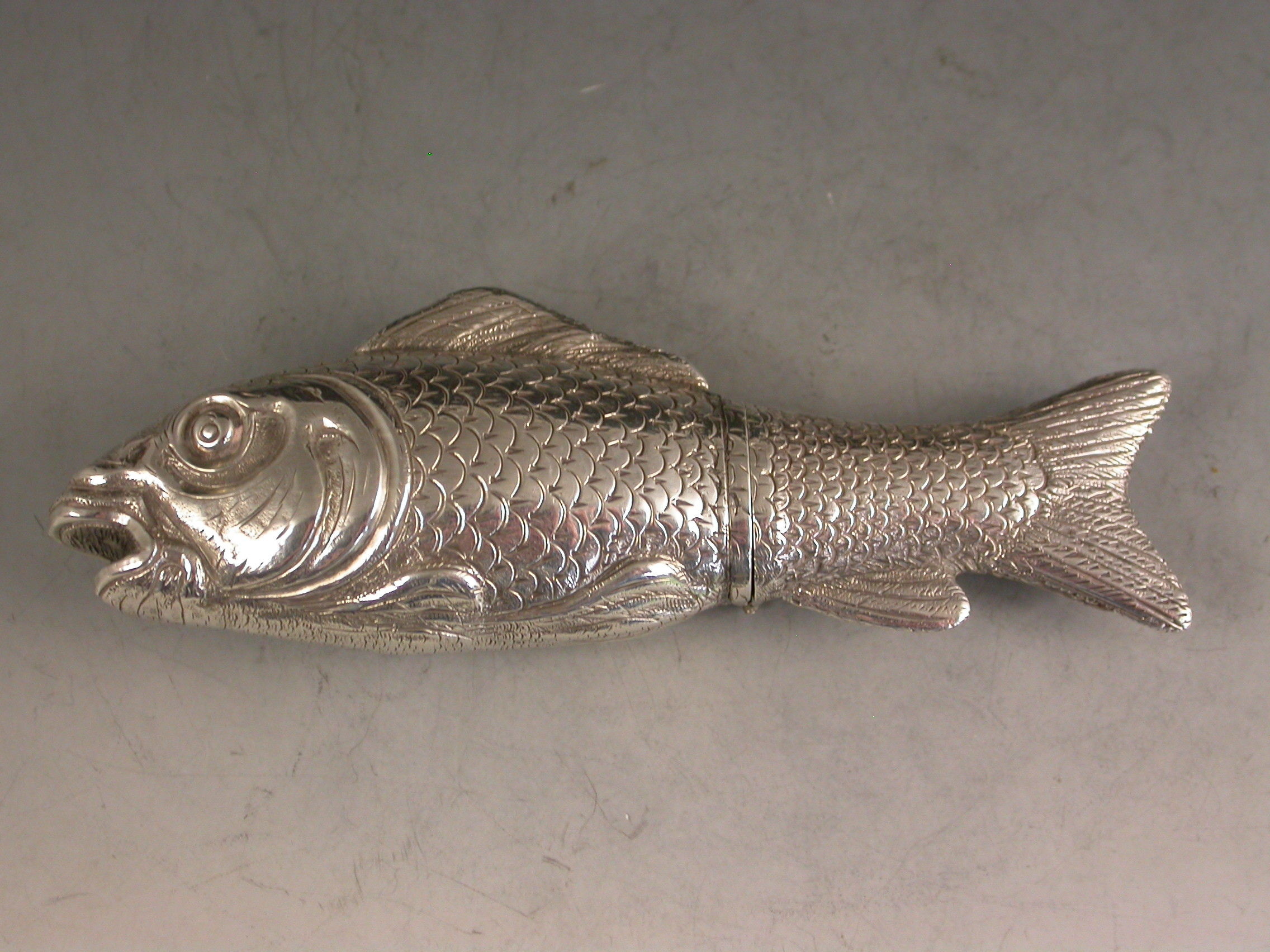 A rare Victorian novelty silver Scent Bottle made in the form of a Fish (probably a Carp), nationalistically engraved detail and scales. Hinged at the centre with silver gilt interior and glass stopper.