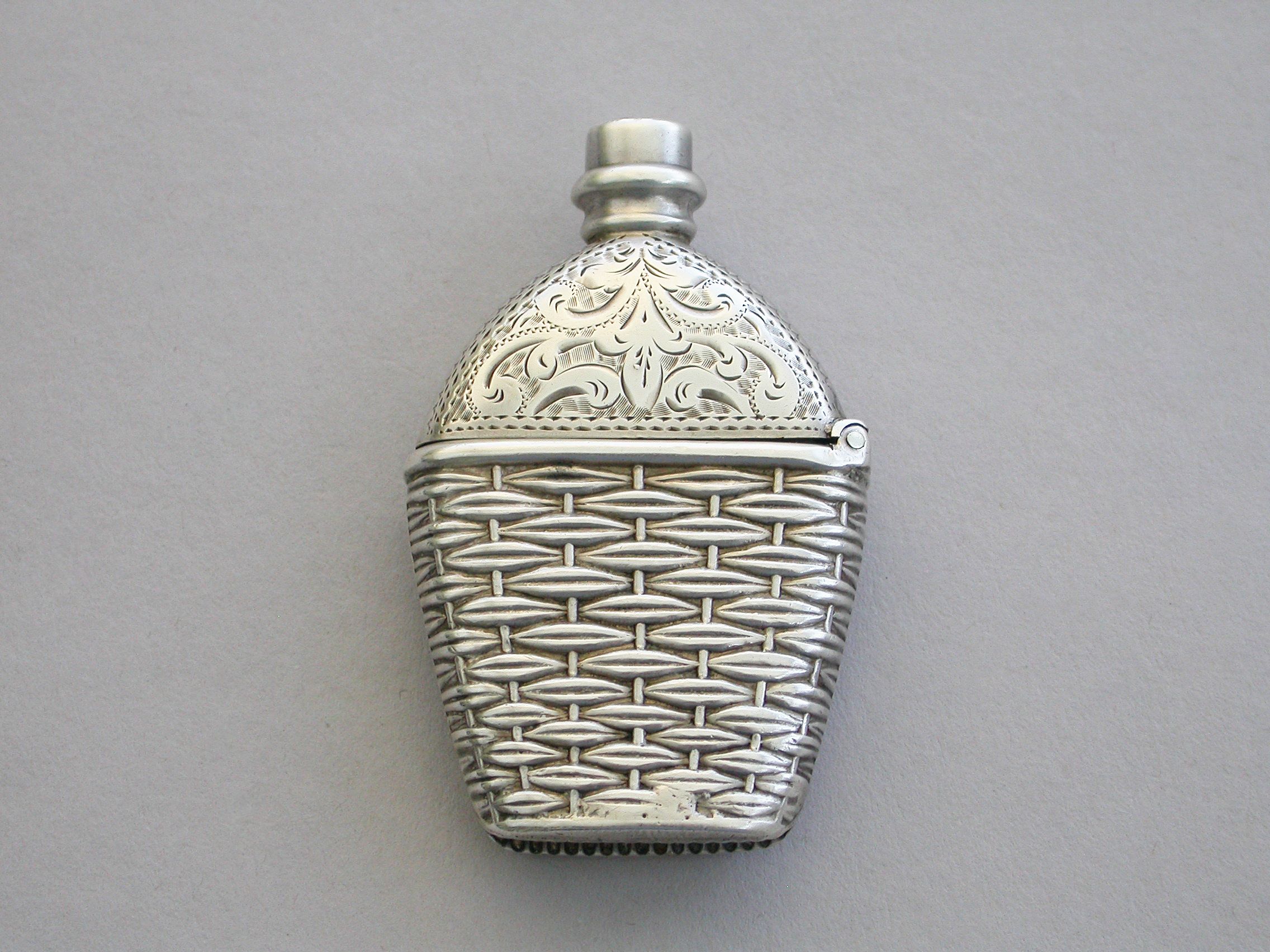 A Victorian novelty silver Vesta Case modelled as a flask in a wicker basket, with bright-cut engraved decoration to the lid, sprung hinged flip-top lid.