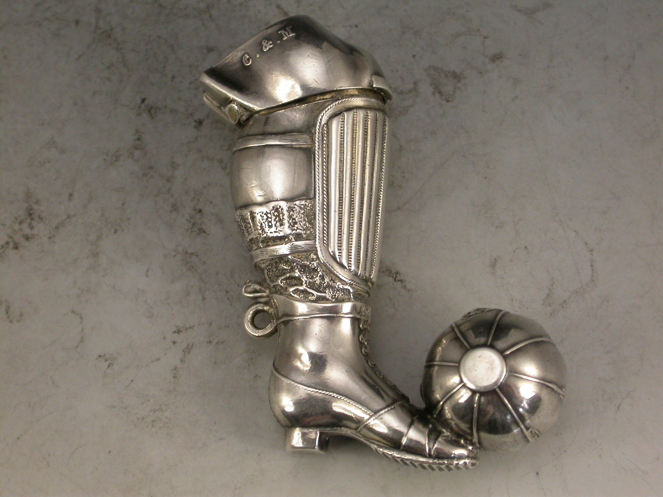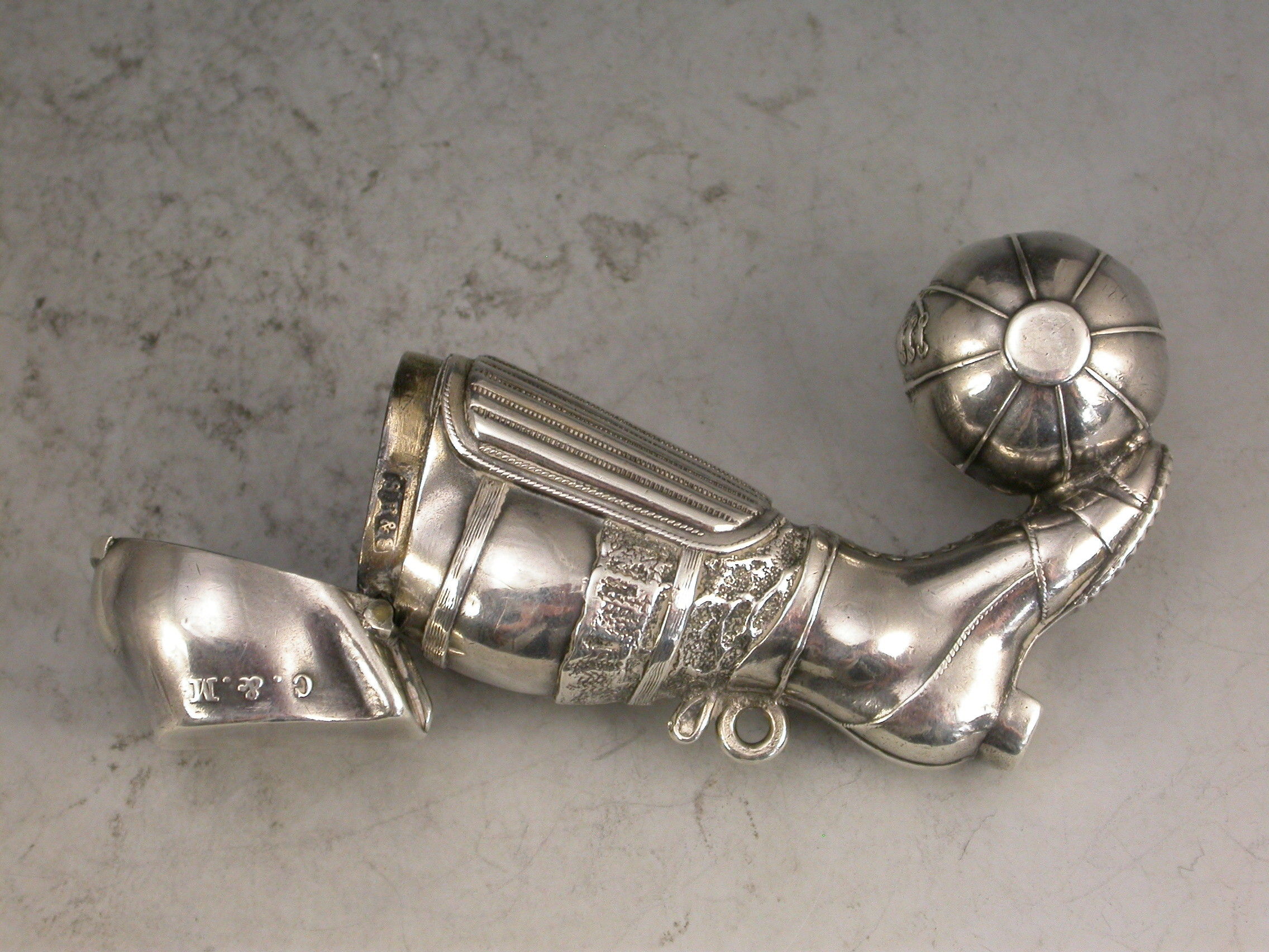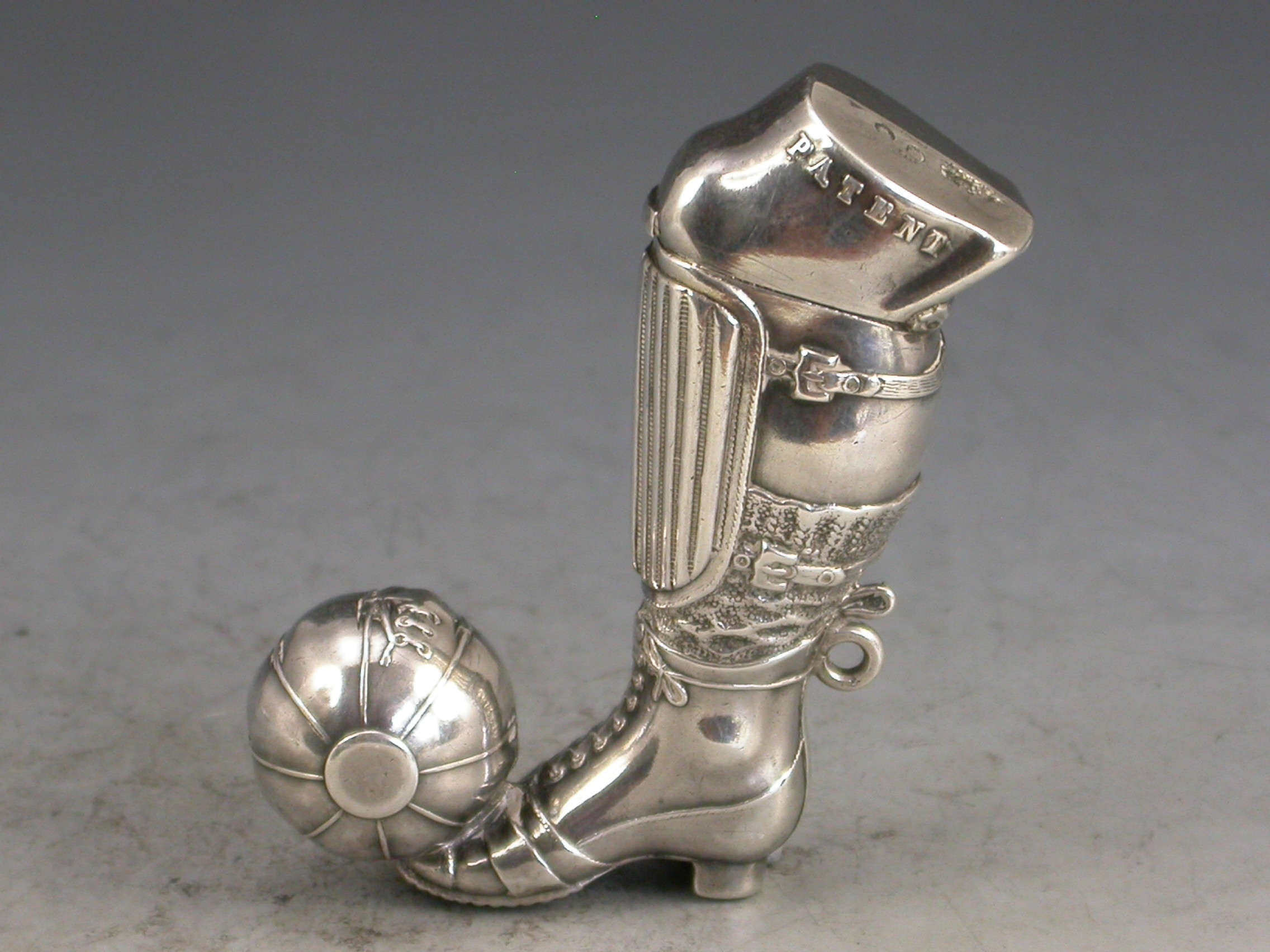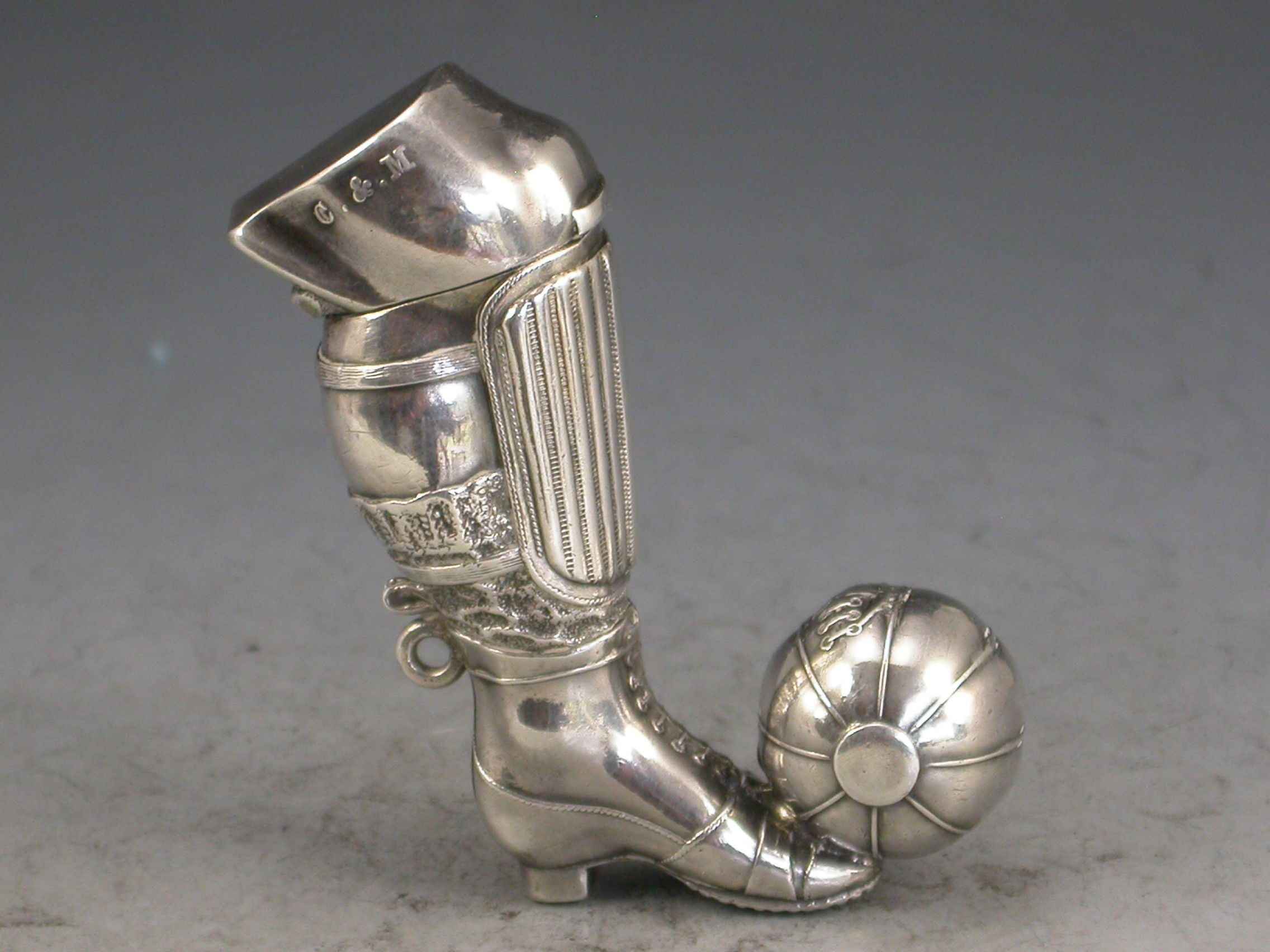 An extremely rare Victorian patented novelty silver Vesta Case made in the form of a Footballers Leg kicking a football and wearing an early leather shin guard, the hinged top stamped: ""C & M Patent"".