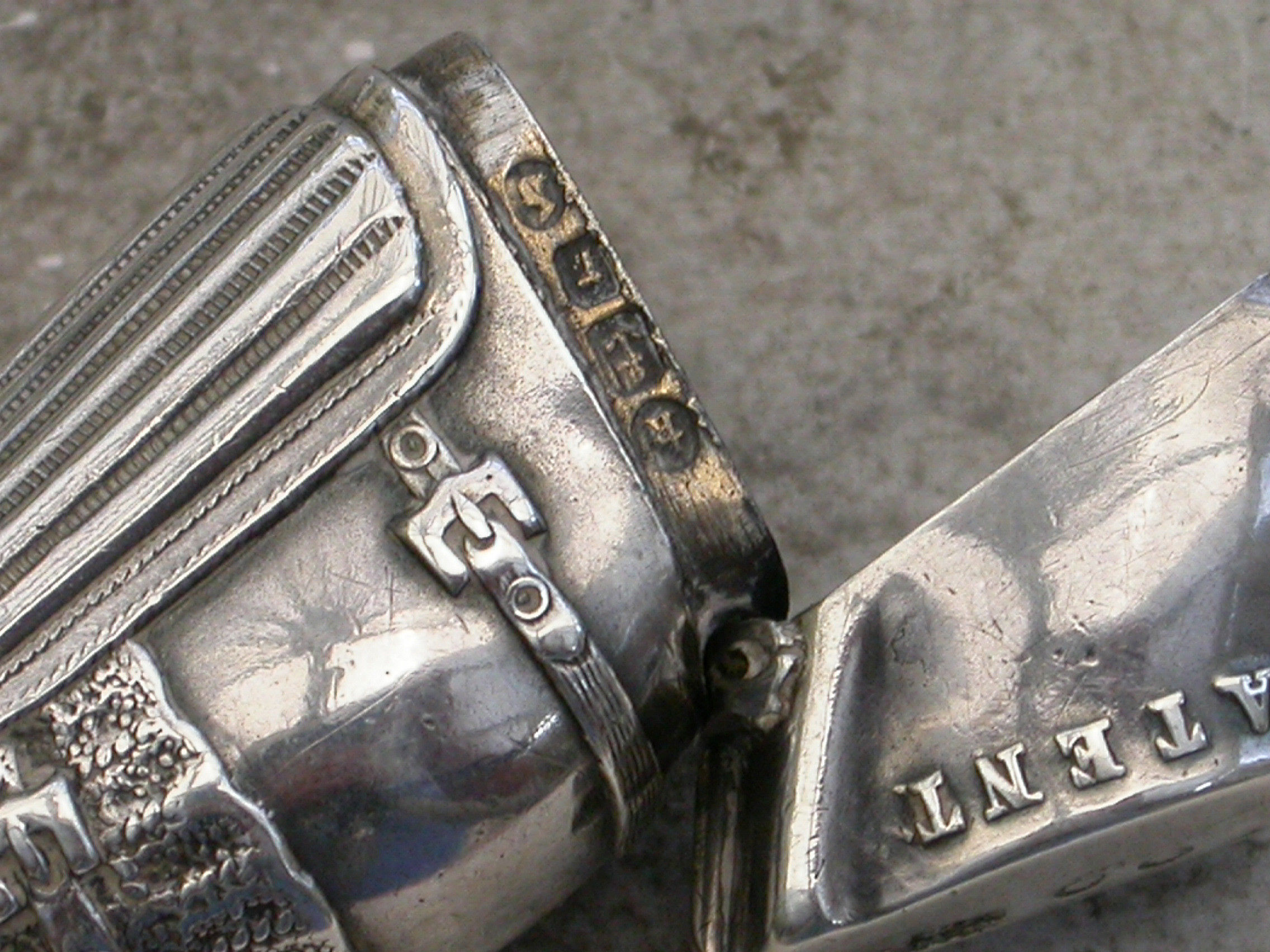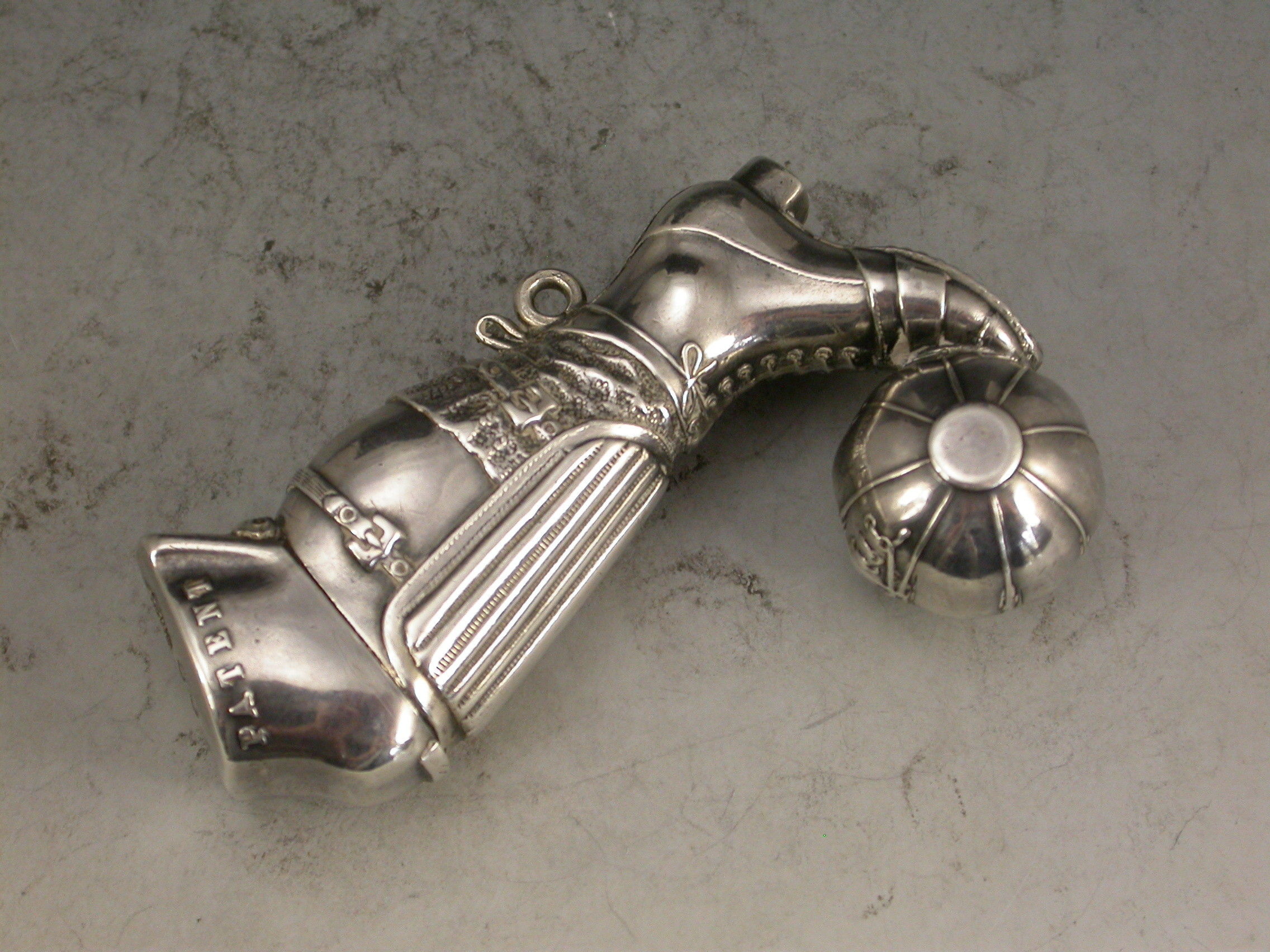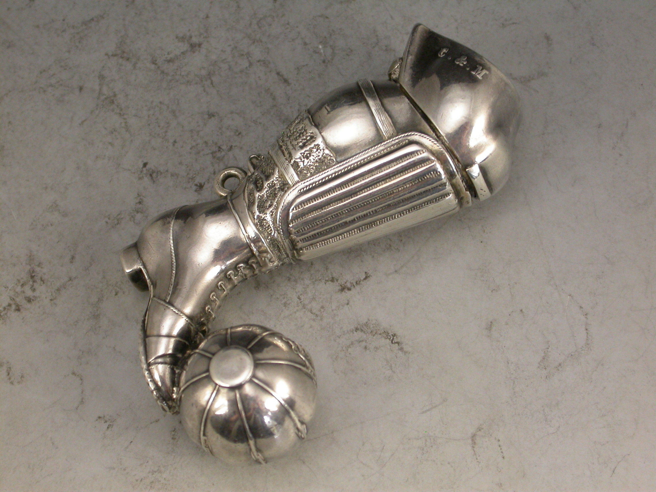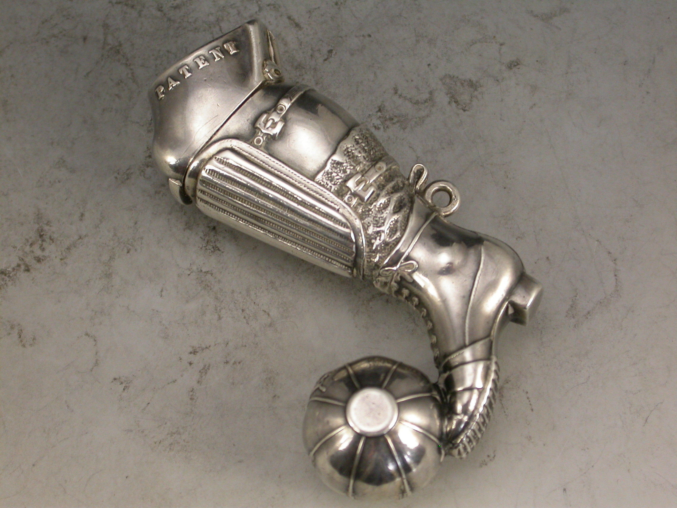 An extremely rare Victorian patented novelty silver Vesta Case made in the form of a Footballers Leg kicking a football and wearing an early leather shin guard, the hinged top stamped: ""C & M Patent"".