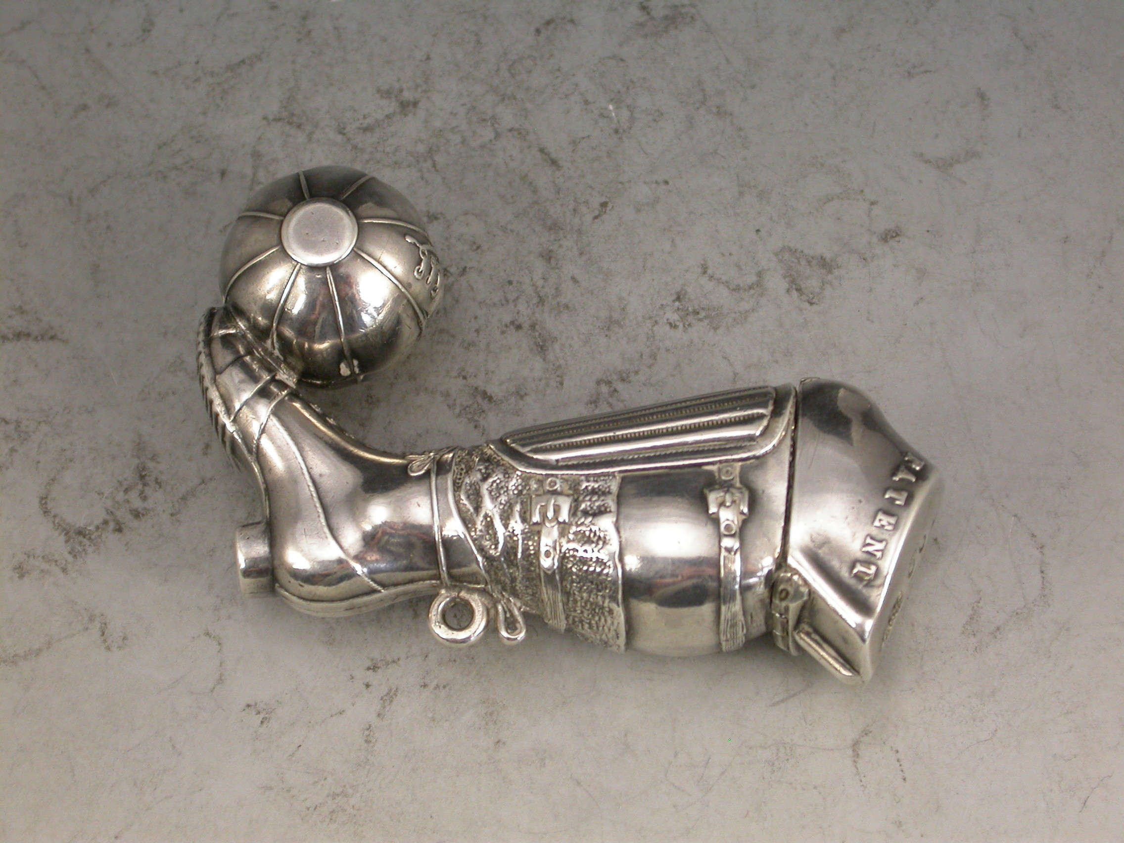Victorian Novelty Silver Footballers Leg, Ball & Shin Guard Vesta Case