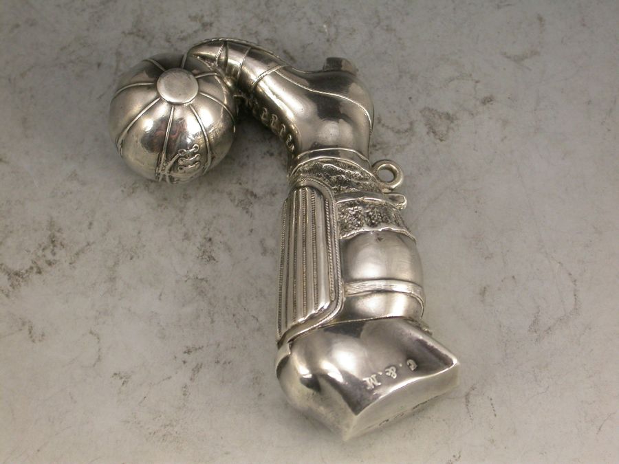 An extremely rare Victorian patented novelty silver Vesta Case made in the form of a Footballers Leg kicking a football and wearing an early leather shin guard, the hinged top stamped: ""C & M Patent"".