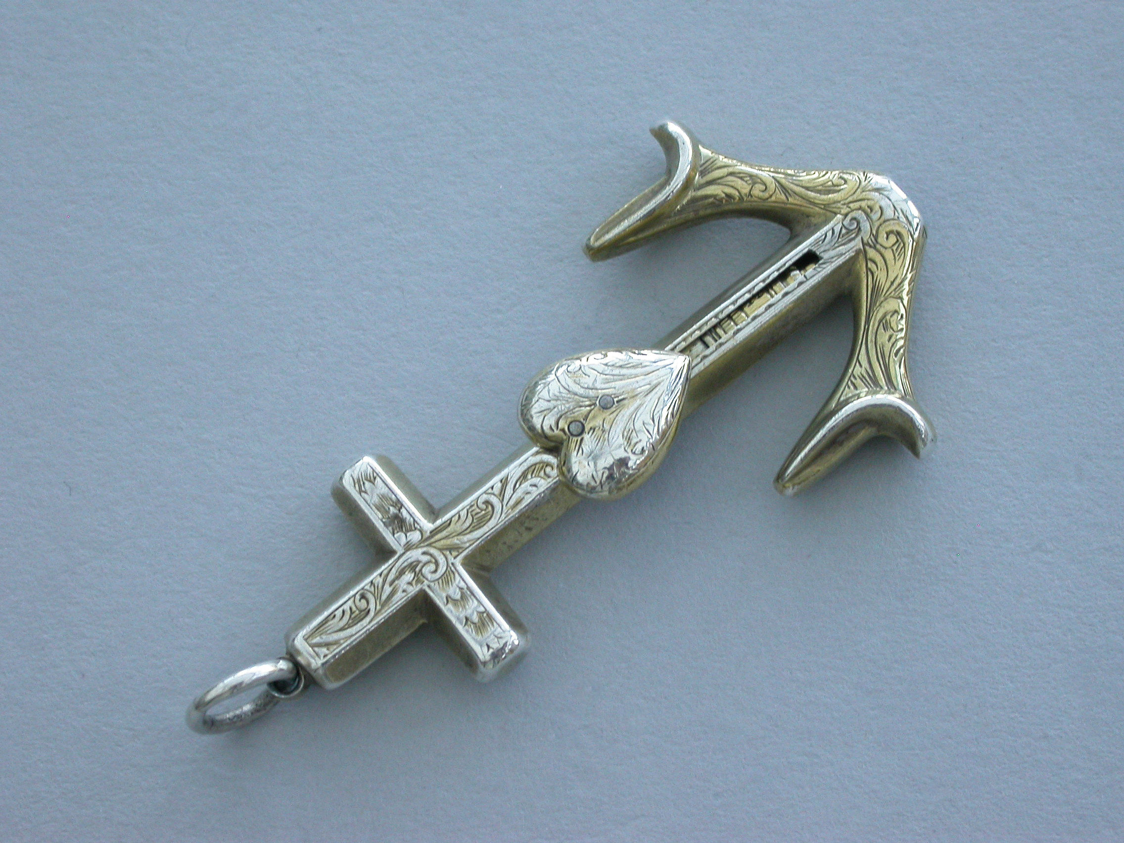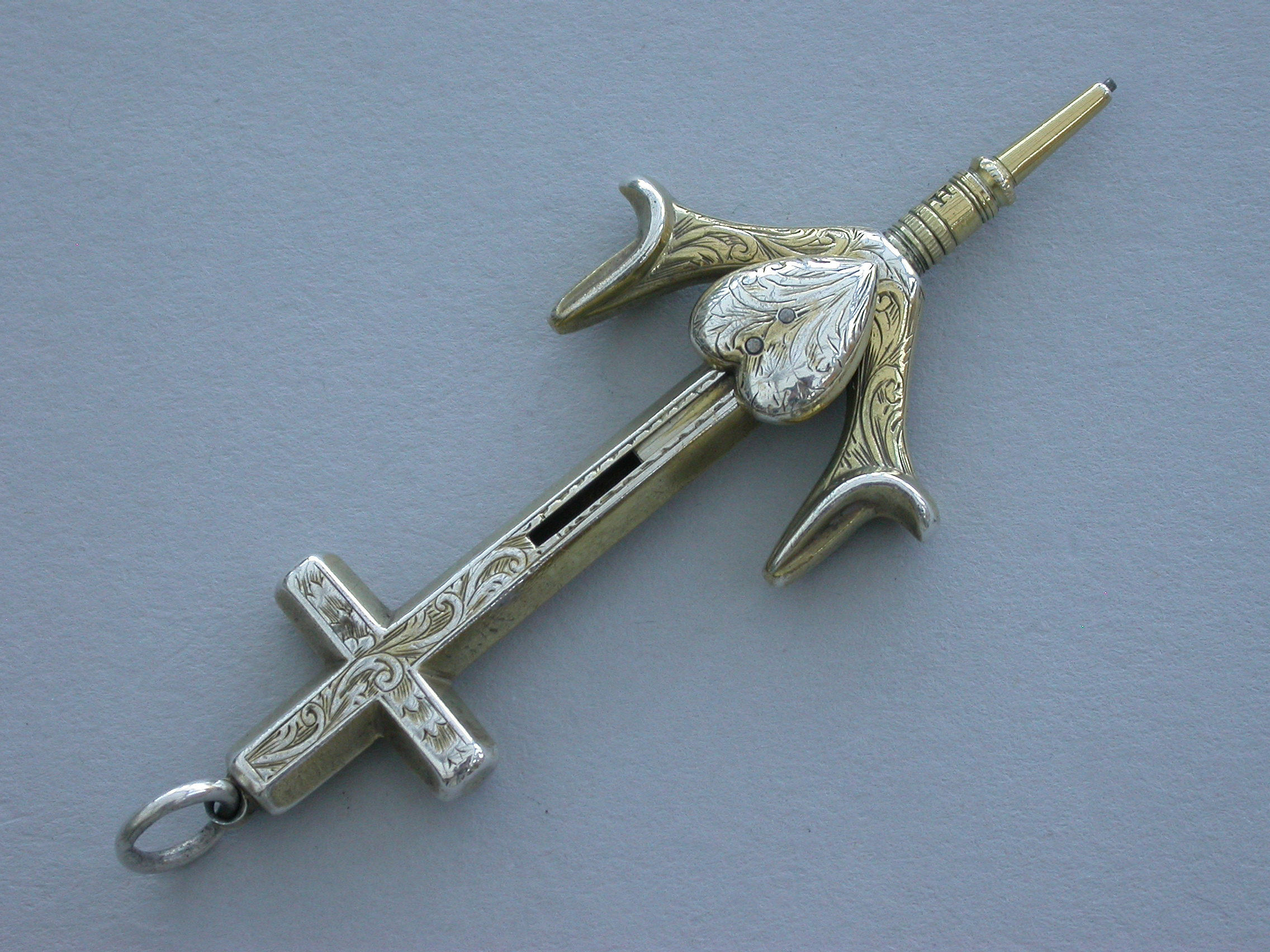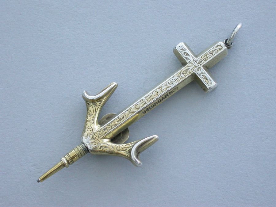 A rare Victorian novelty silver gilt Propelling Pencil made in the form of an anchor/cross/heart (the symbols of Faith, Hope and Charity) with engraved decoration and attached suspension ring. A slide-action mechanism to open.