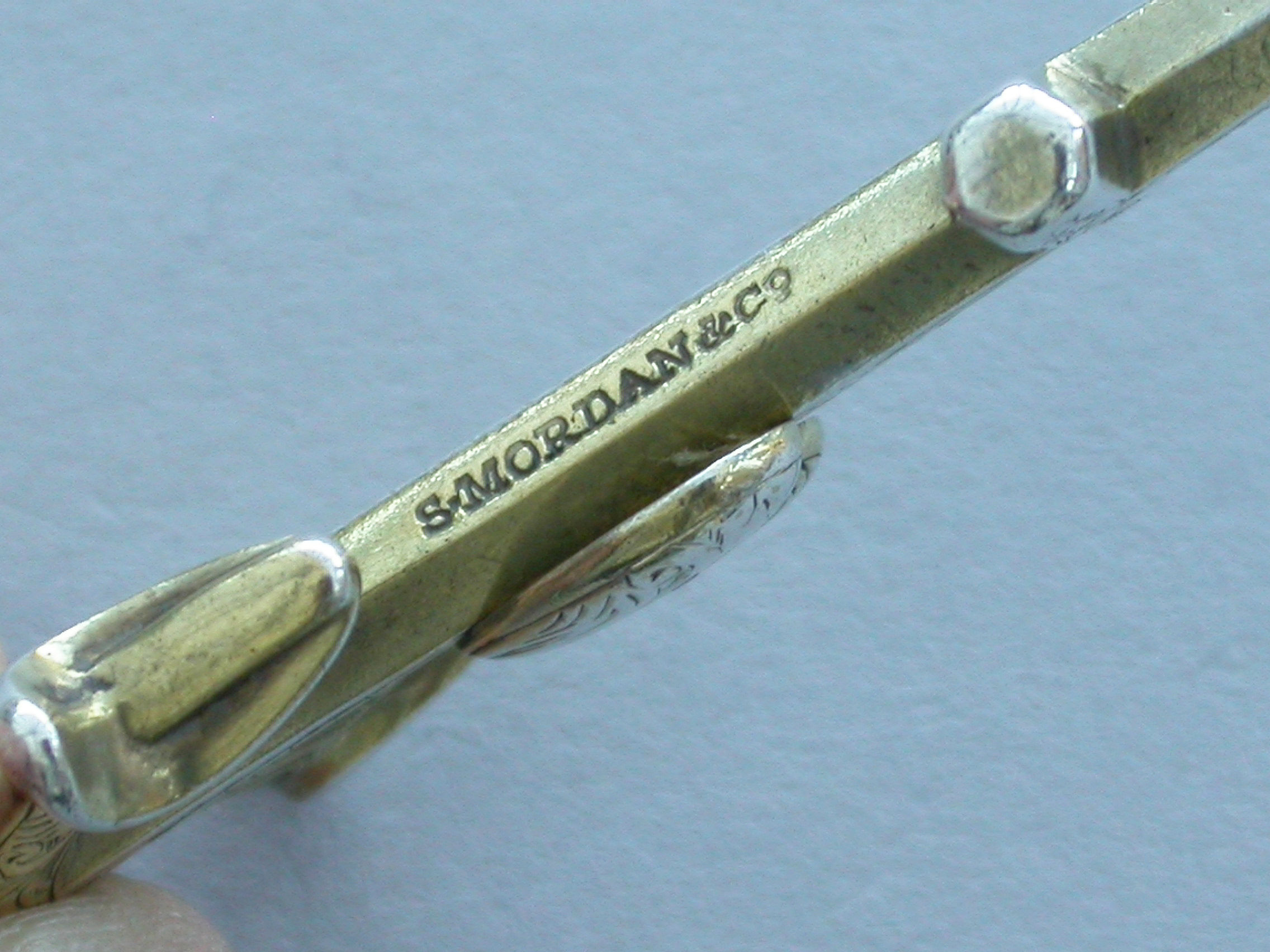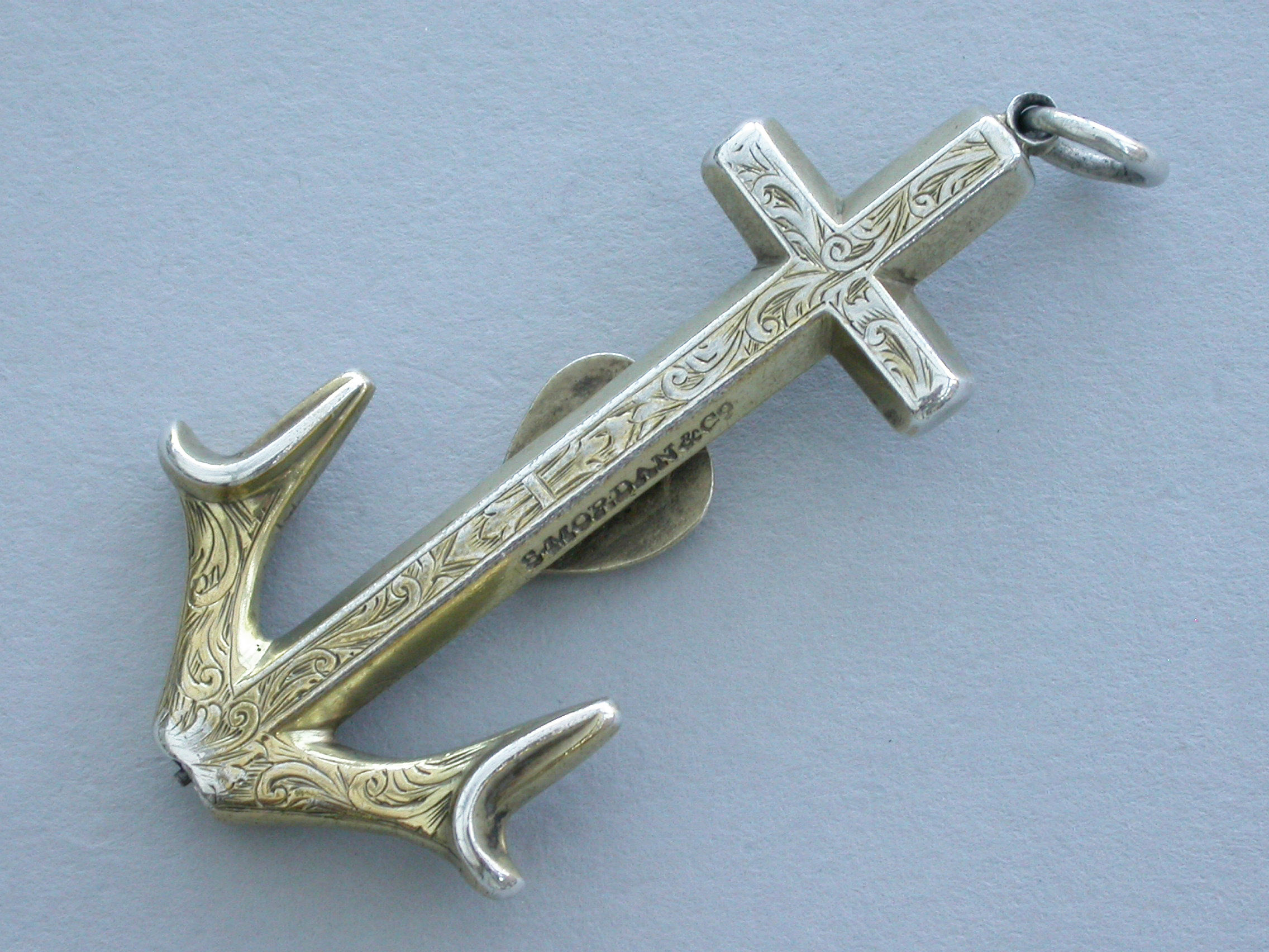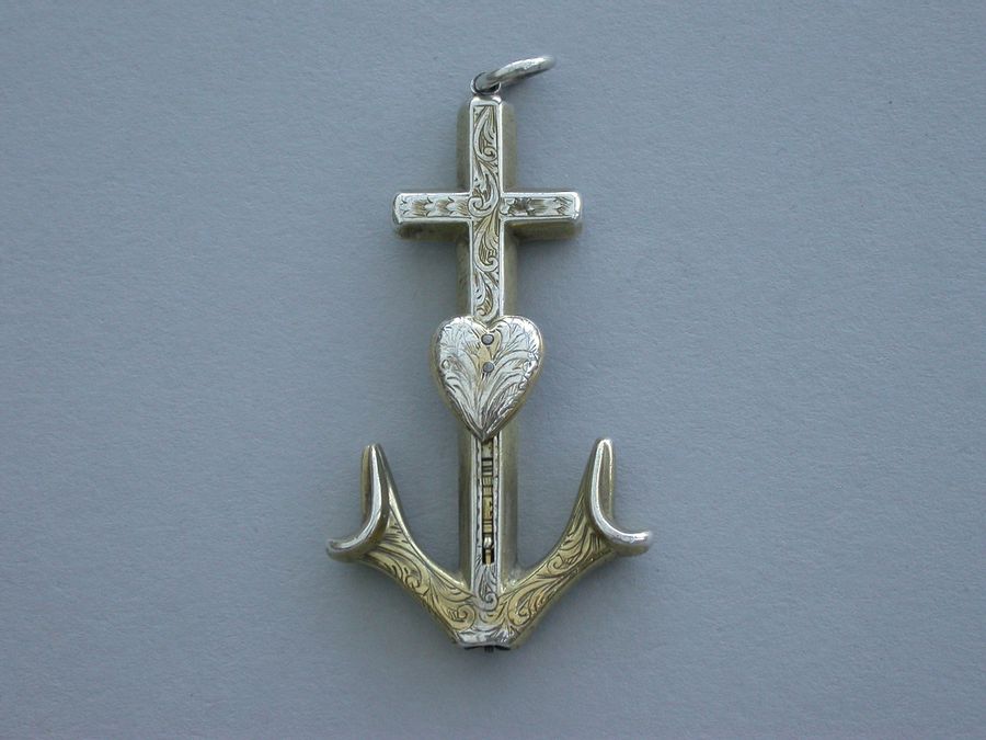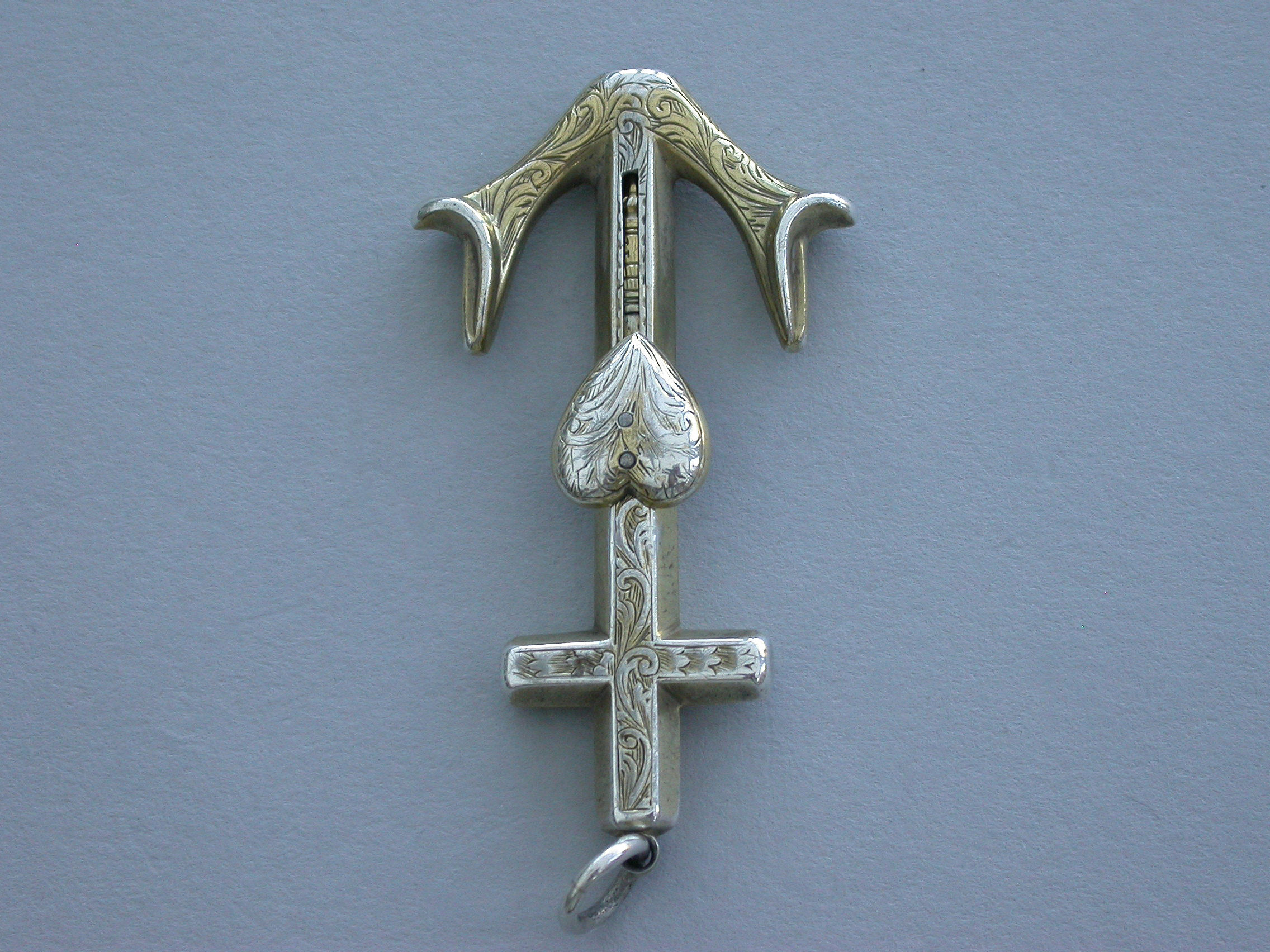 A rare Victorian novelty silver gilt Propelling Pencil made in the form of an anchor/cross/heart (the symbols of Faith, Hope and Charity) with engraved decoration and attached suspension ring. A slide-action mechanism to open.