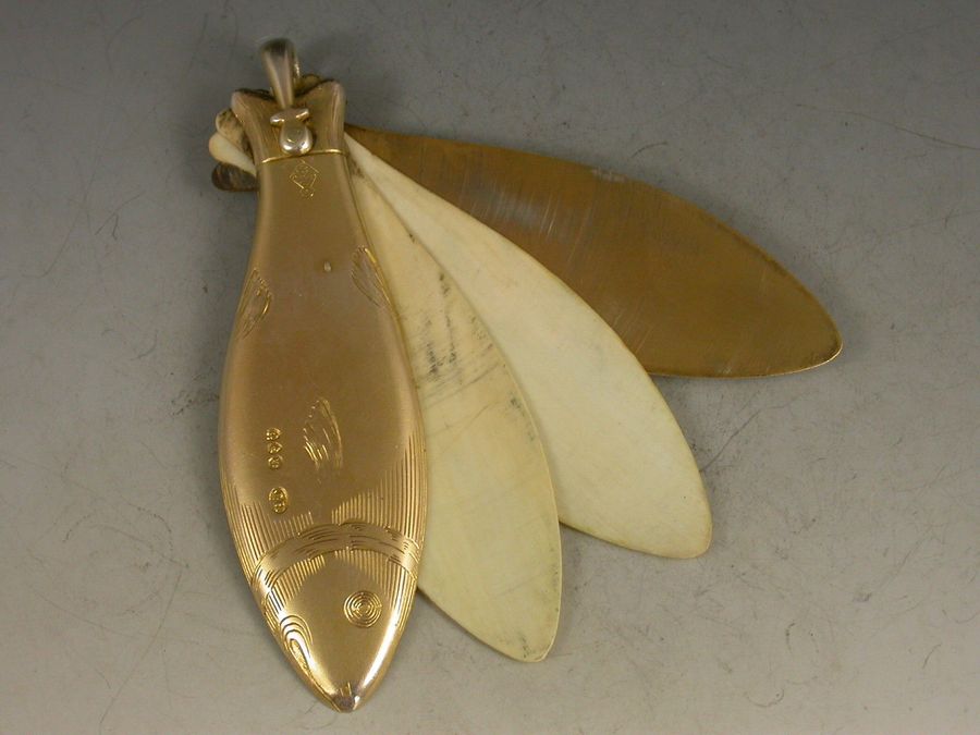 An unusual Victorian novelty silver gilt Aide Memoire made in the form of a fish with engraved fins and details, containing two swiveling ivory pages and held together with a stirrup shaped loop.
