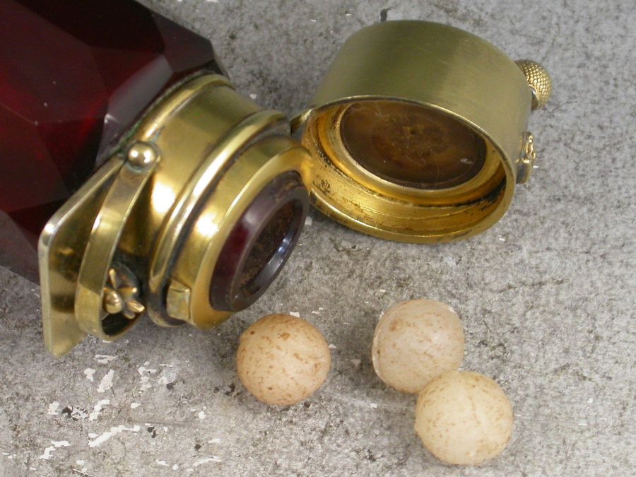 In good condition with no damage or repair, one spring opening mechanism a little sticky. One glass bottle contains some probably contemporary smelling salts balls, which have clouded the glass slightly.