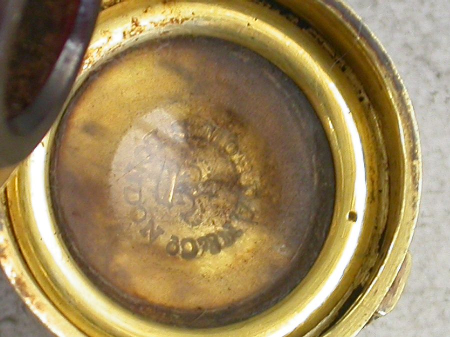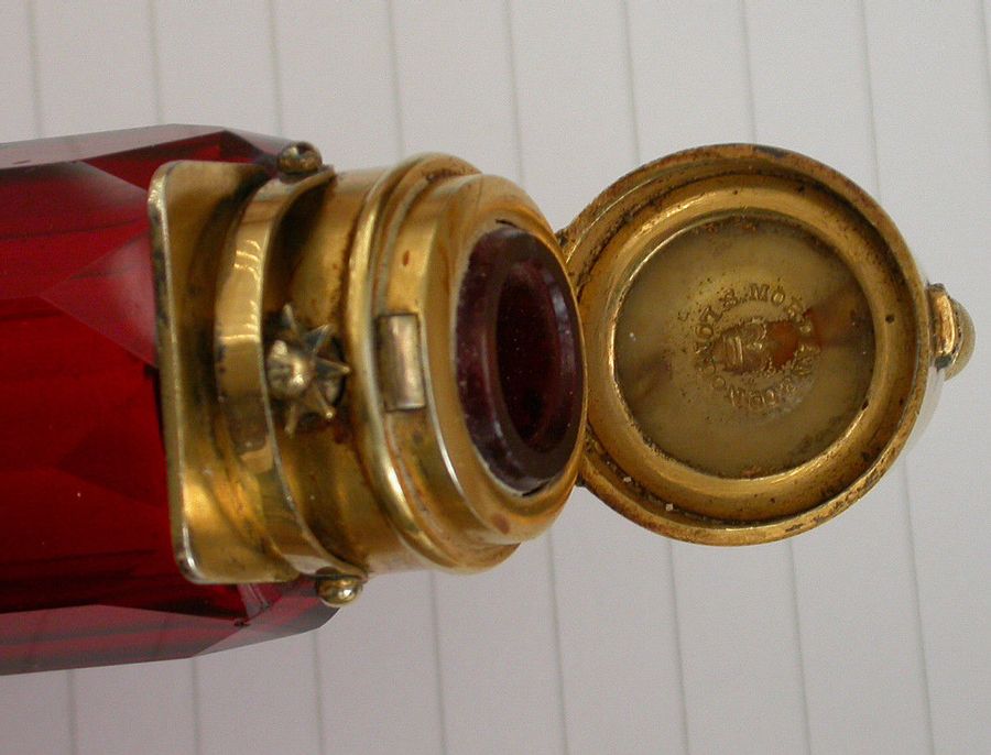 An extremely unusual and fine quality Victorian silver gilt mounted double ended ruby glass Scent Bottle, the large cylindrical bottle with faceted sides, the two silver gilt covers formed as British Military Shako Helmets of ""Stove Pipe"" form. The sprung hinged covers with internal metal plates stamped with Mordan trade marks and covered with glass lenses. The sprung tops are opened by depressing the star shaped badges on the helmets.