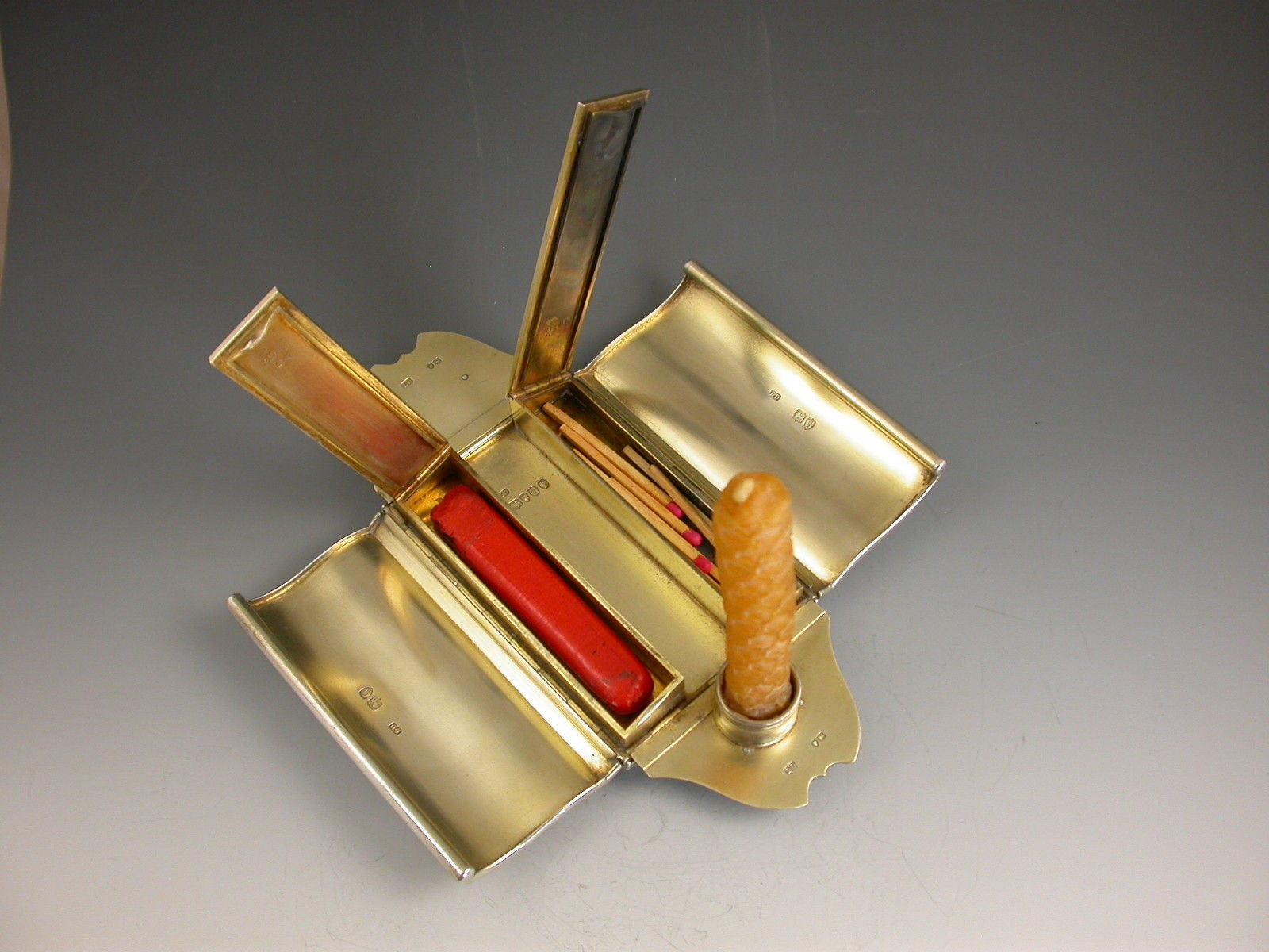 An extremely rare novelty silver table Vesta Case / Go To Bed, made in the form of a Gladstone Bag standing on four ball feet and with two carrying handles. The four sides are all hinged and open to reveal the silver gilt interior with two long hinged vesta boxes and a fold-out taper stick.