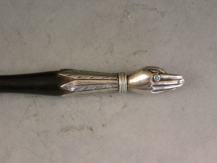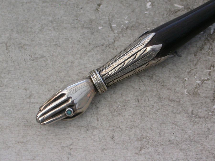 An extremely rare Victorian novelty silver Dip Pen or Quill Holder modelled in the form of a hand with turquoise set ring to the index finger and engraved cuff supporting a shaped ebony shaft. The finger tips cut to accept a quill nib.