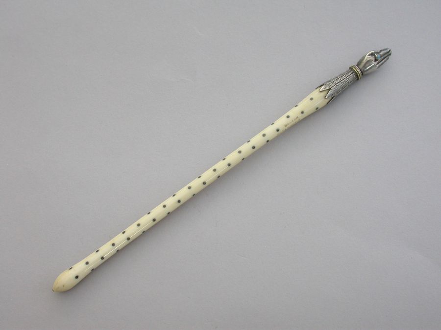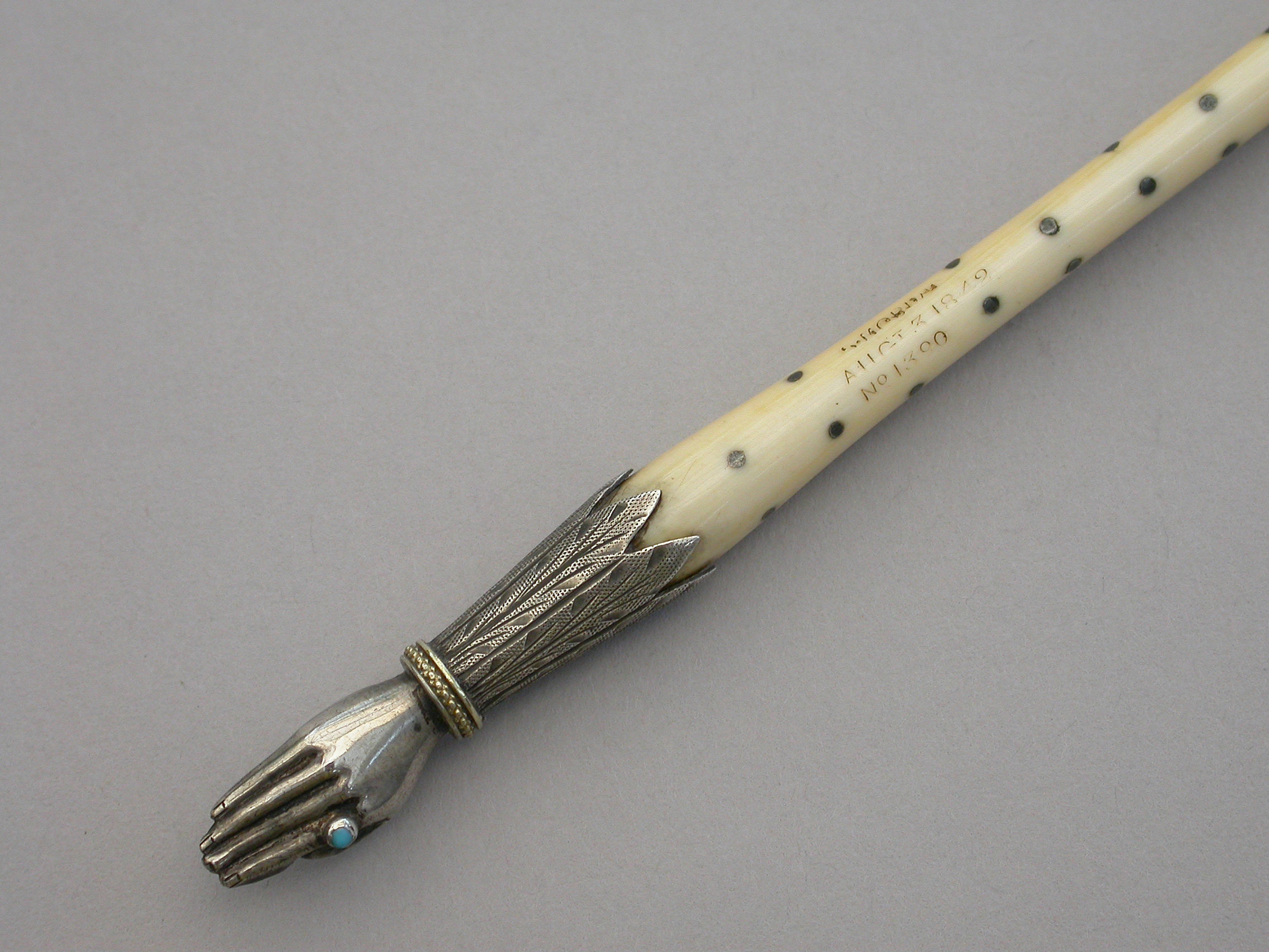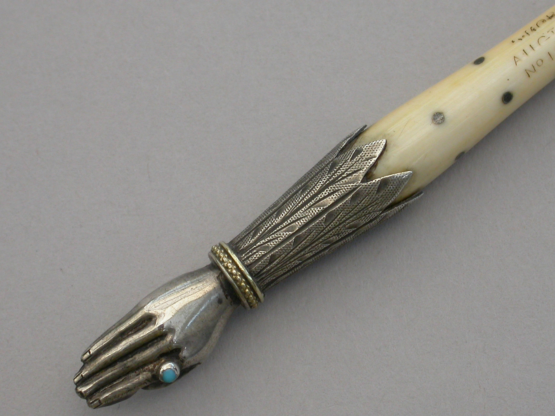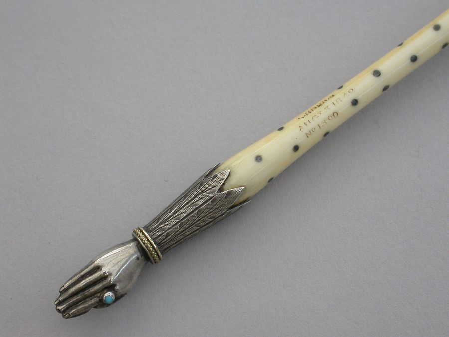 An extremely rare Victorian novelty silver Dip Pen or Quill Holder modelled in the form of a hand with turquoise set ring to the index finger and engraved cuff supporting the shaped ivory shaft decorated with silver pique work. The finger tips cut to accept a quill nib.